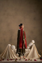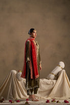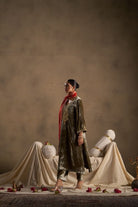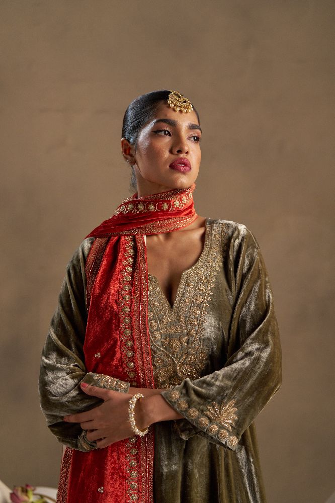 This regal olive green pure silk velvet suit is adorned with intricate zari and sequin handwork on the neckline and sleeves, exuding timeless elegance. It is paired with matching velvet pants/plazos in the same rich hue, creating a seamless and luxurious silhouette. Completing the ensemble is a contrasting rust velvet dupatta stole, beautifully finished with four-side hand embroidery and tissue backing, adding depth, texture, and festive charm to the look.