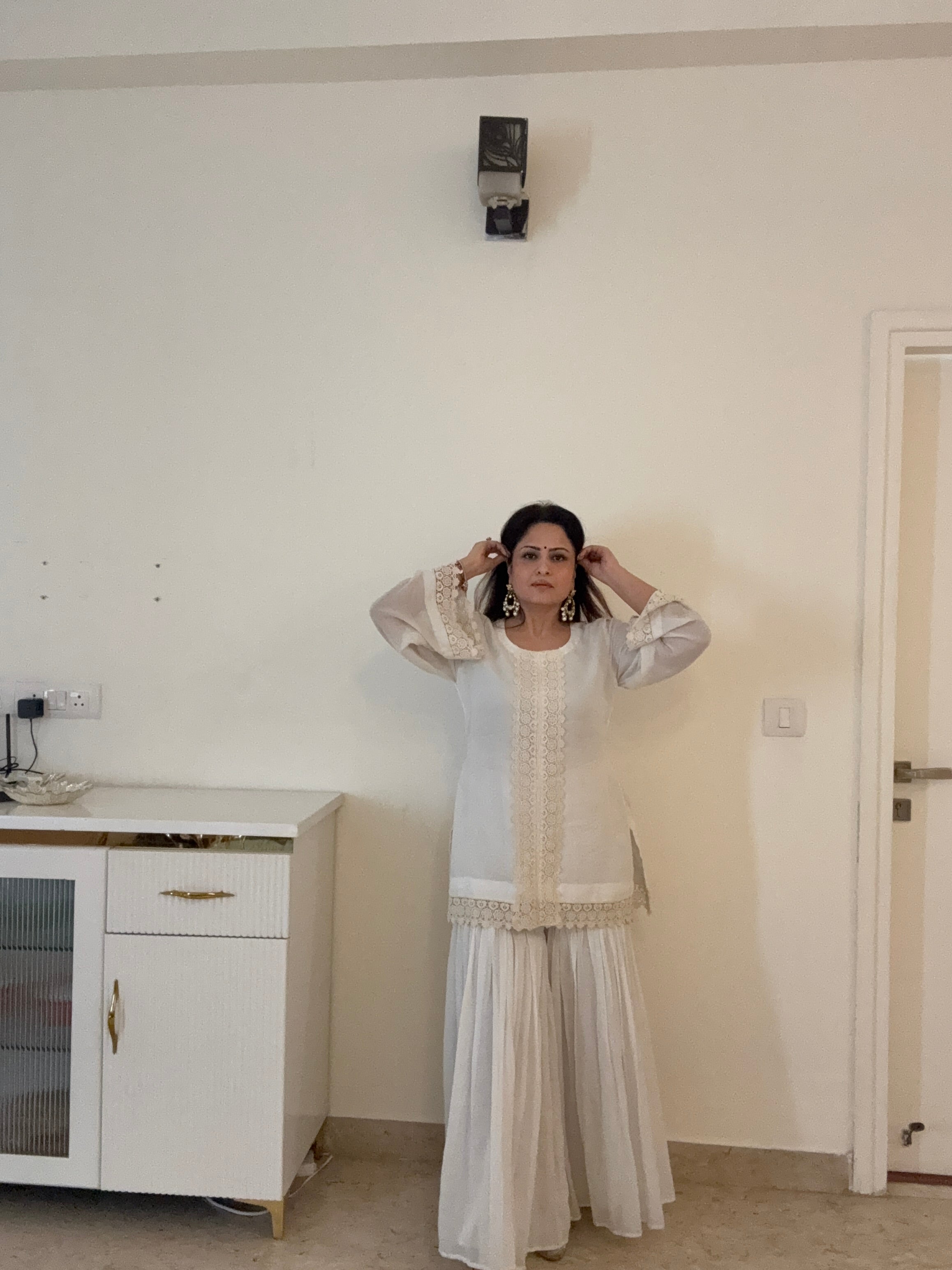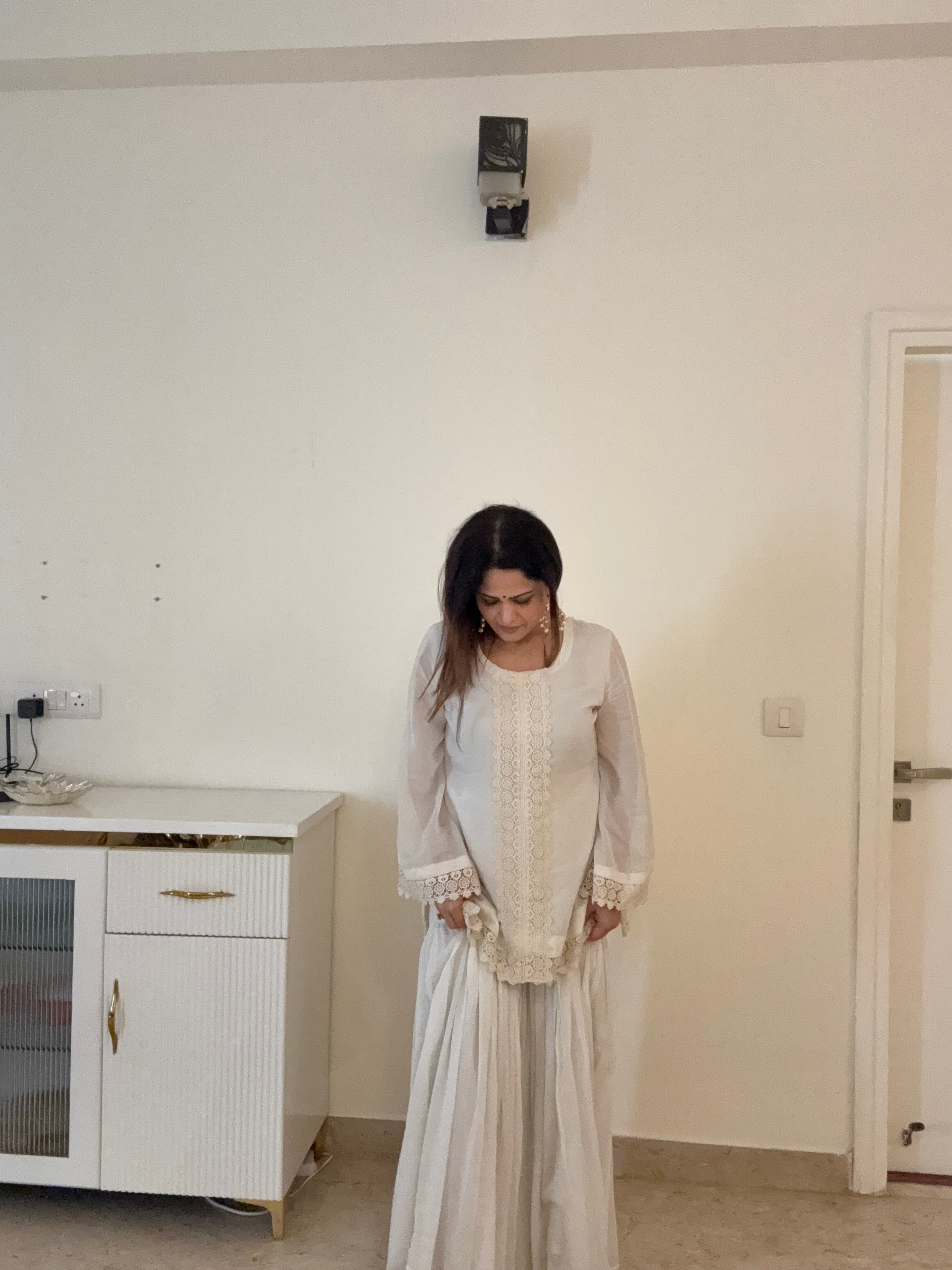 Fresh, effortless, and perfect for summer days, this kurta set is crafted in soft white cotton with a subtle self-check texture. The kurta features delicate panel lace detailing that adds a touch of femininity and charm to the silhouette. Paired with a matching cotton garara, the ensemble is designed to fall at an elegant ankle length, creating a light and graceful look that is both comfortable and refined.