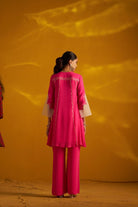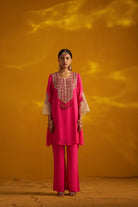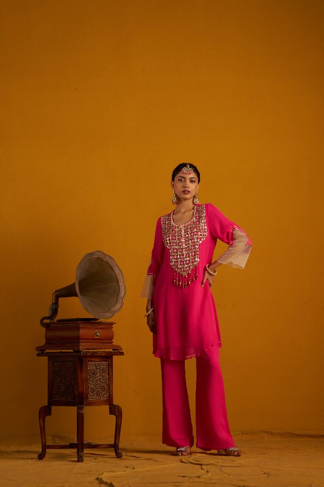 Fuschia pink georgette cord set with attractive sequence handwork in front neckline. Sleeve detailing made with white organza bell sleeves. Back side has gota detailing. Paired with fuschia bell bottoms.