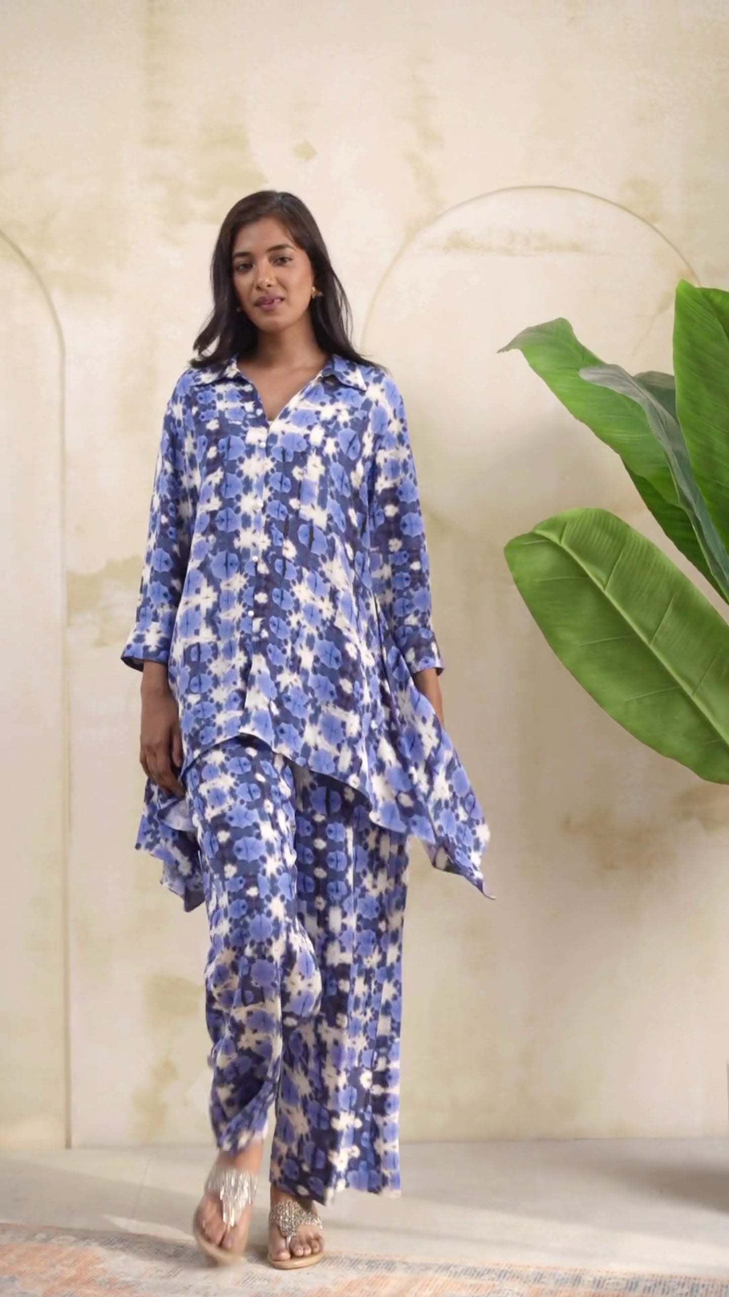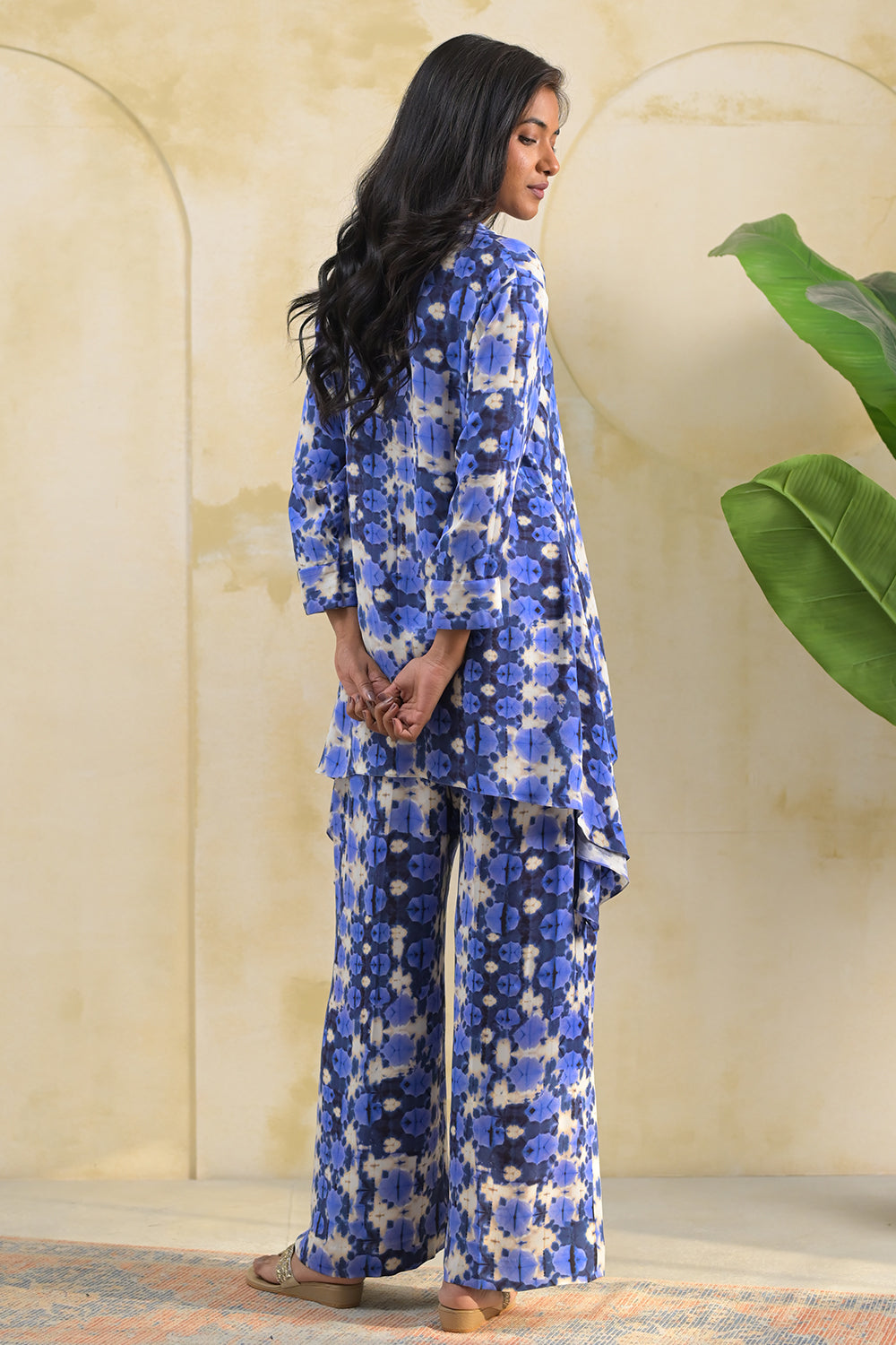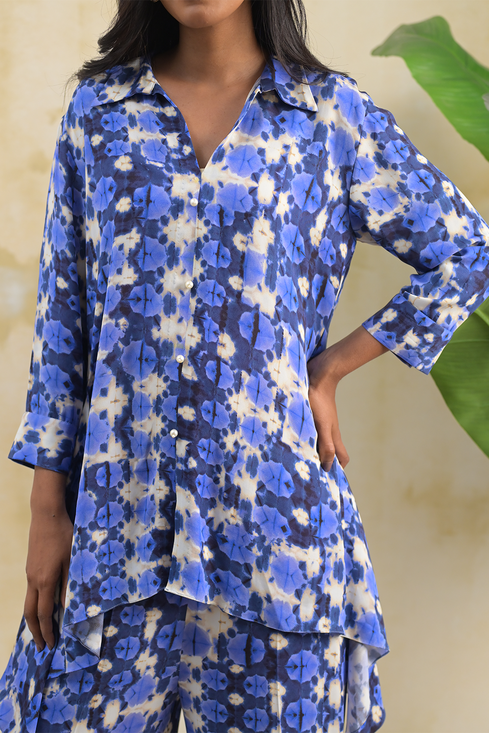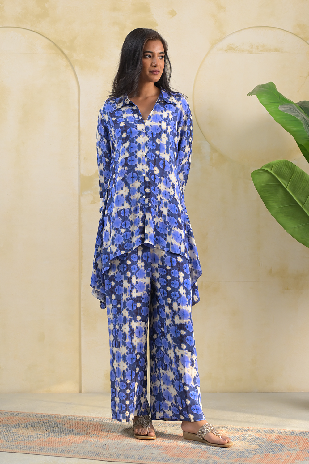Effortlessly blending comfort with contemporary style, this co-ord set is designed for relaxed yet refined everyday wear. Featuring a fluid silhouette, the set includes a longline shirt with a soft, layered hem and wide-leg trousers that offer ease of movement and a flattering drape. The abstract blue print adds a modern, artistic touch, making it perfect for both casual outings and elevated daywear looks.
