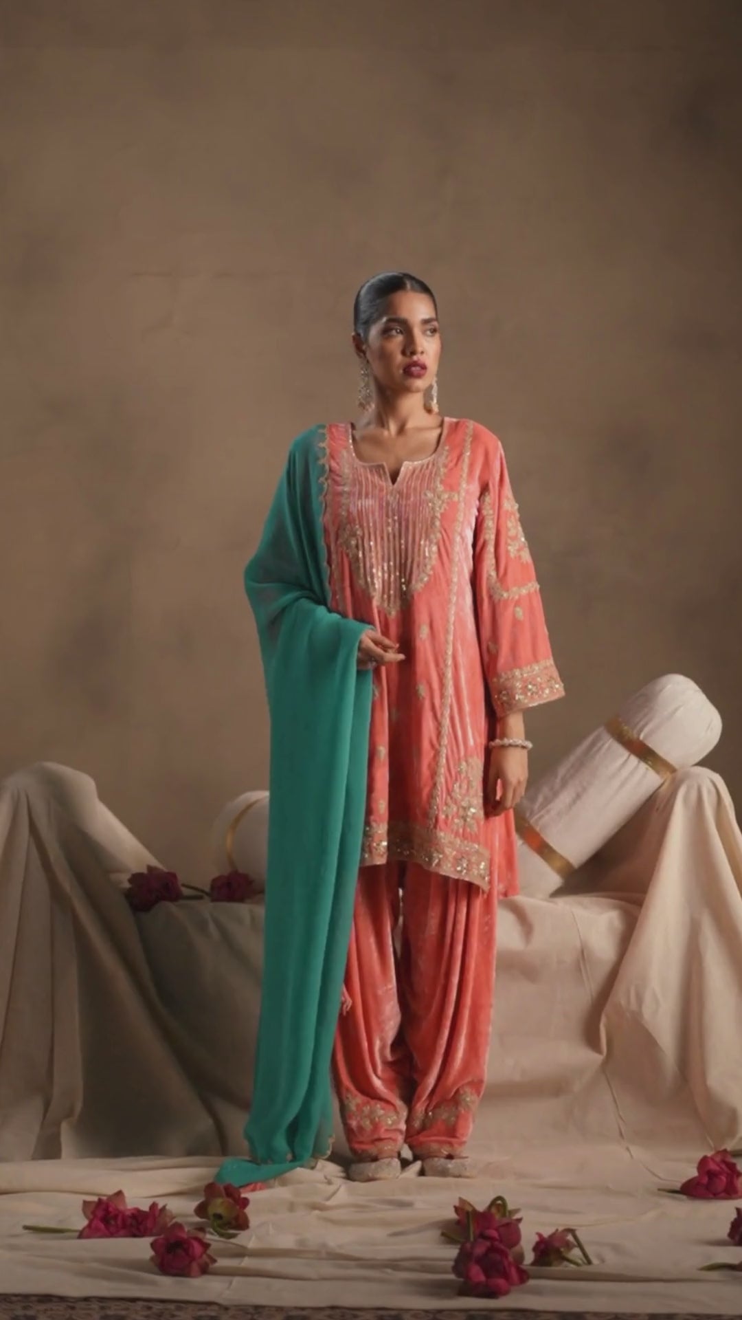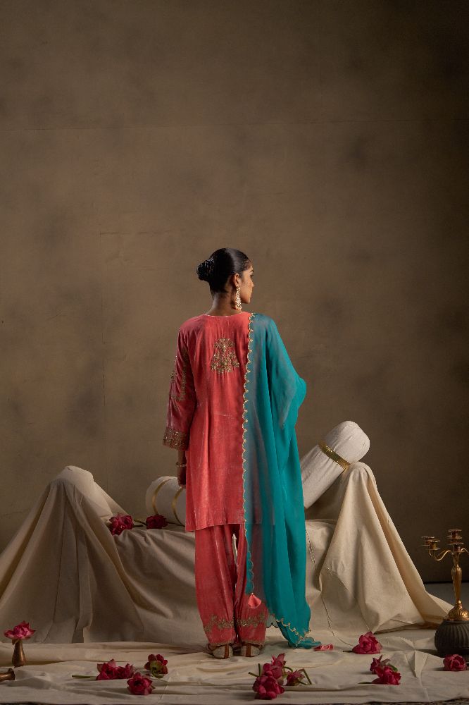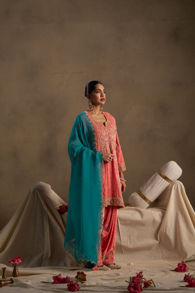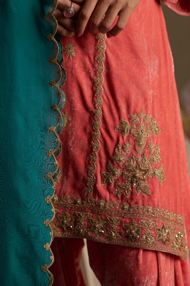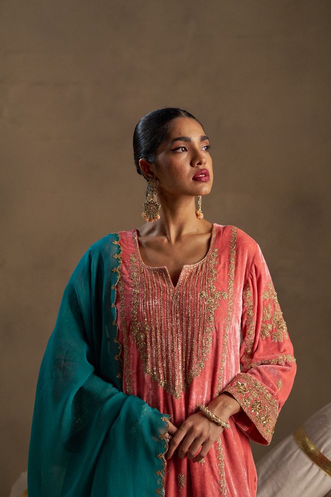 This elegant ensemble is adorned with rich zari, dabka, and sequin handwork on the neckline panel, complemented by attractively detailed sleeves that enhance its festive appeal. The salwar is finished with delicate zari work along the bottom, adding a refined touch. Paired with a contrast teal dupatta featuring beautiful scalloped edges, the look comes together as a graceful blend of tradition and contemporary charm.