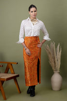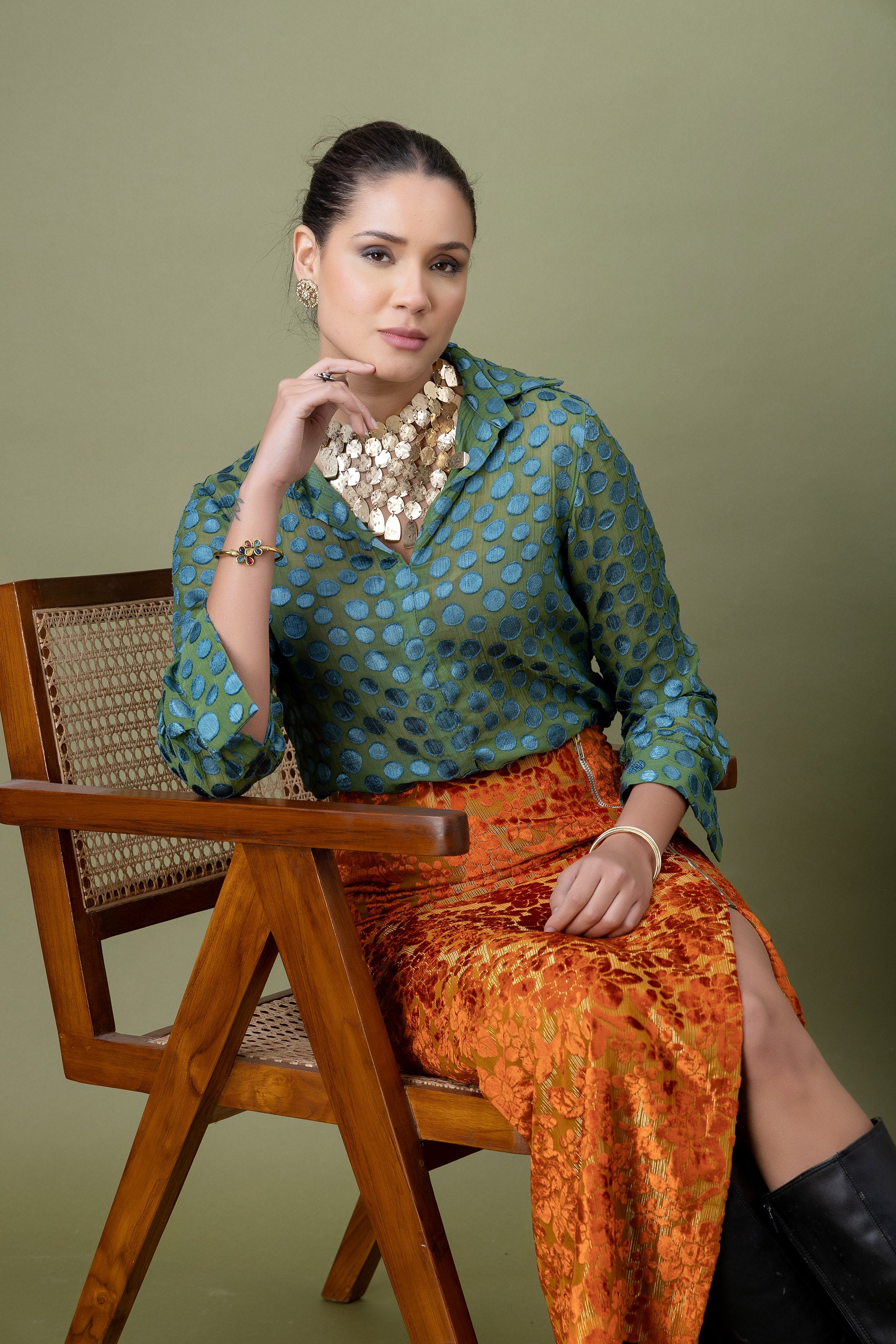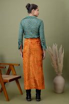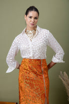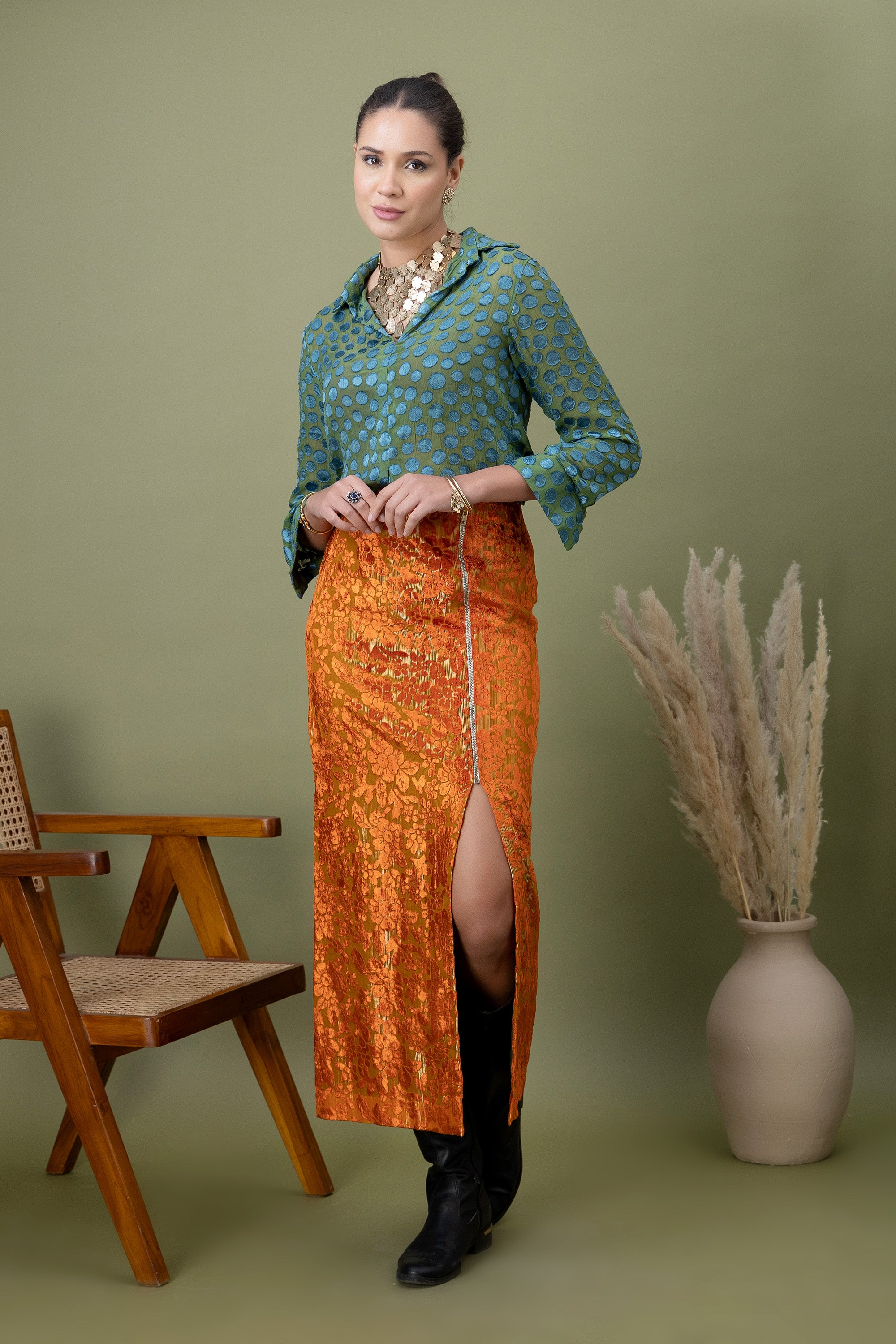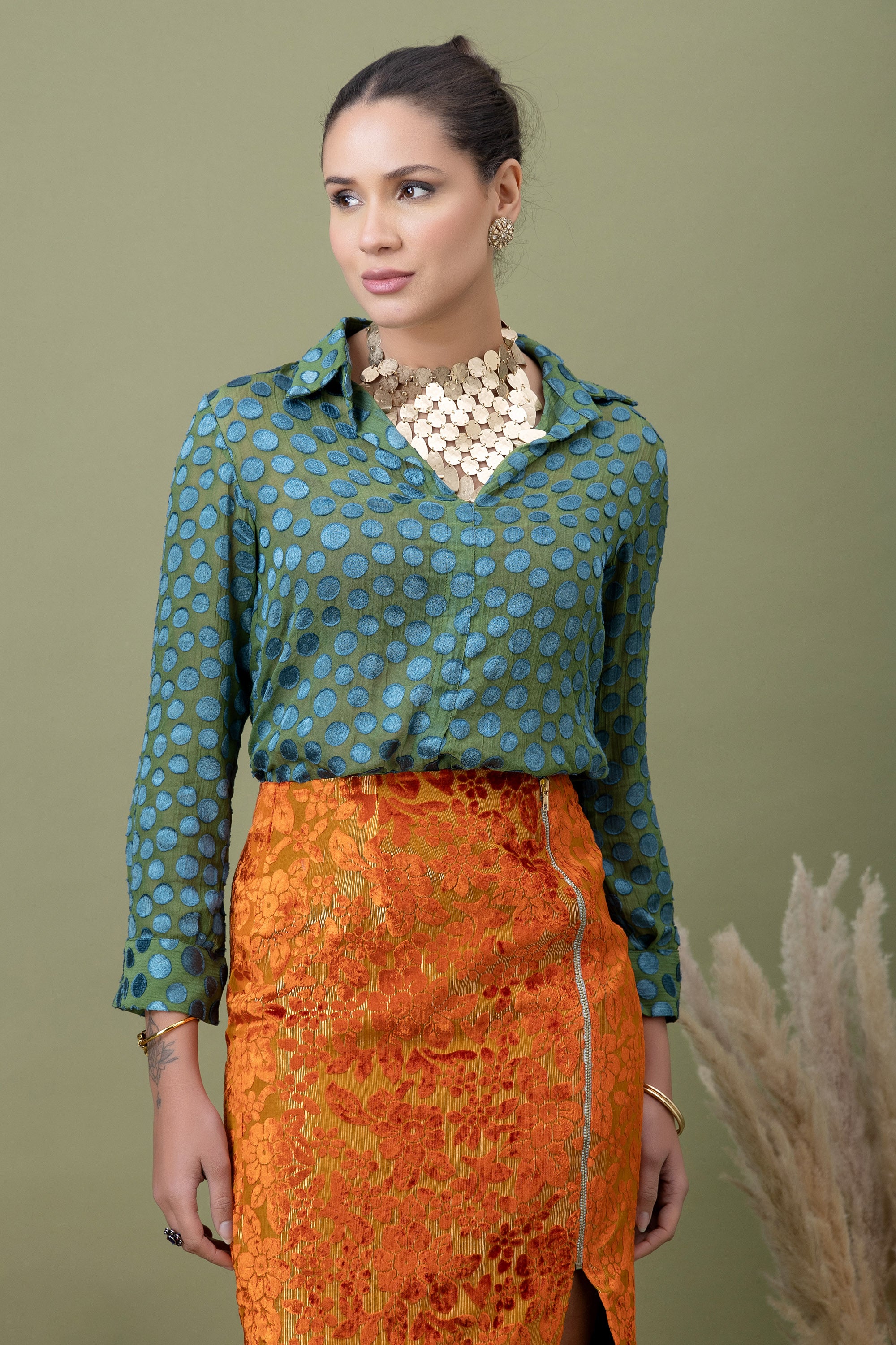 A modern pairing of a teal polka-dotted shirt with a richly textured amber lace skirt. Finished with a front slit detail, this look balances structure and drama—perfect for elevated evenings, gallery nights, and bold festive styling.