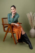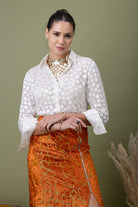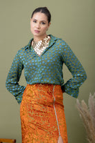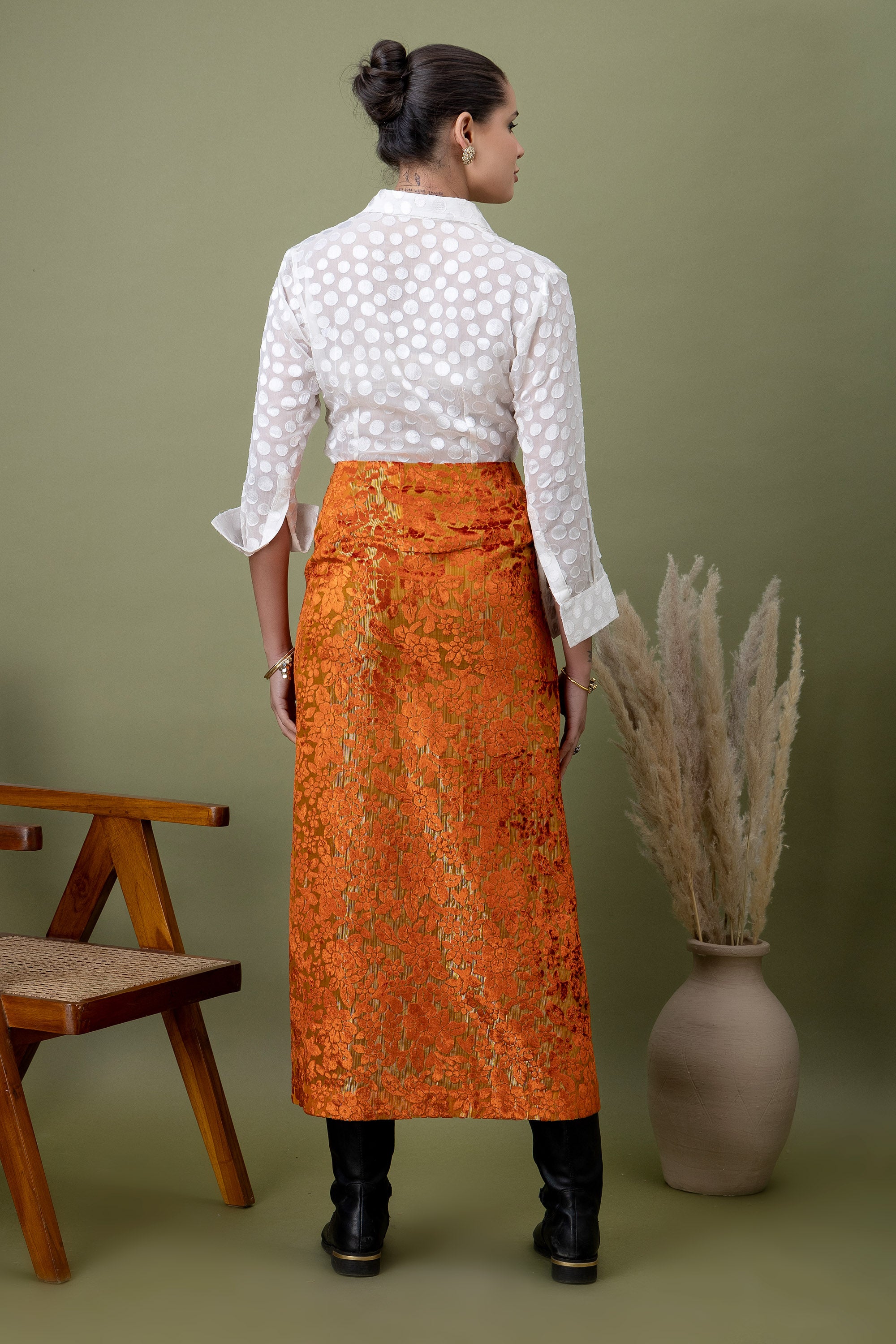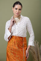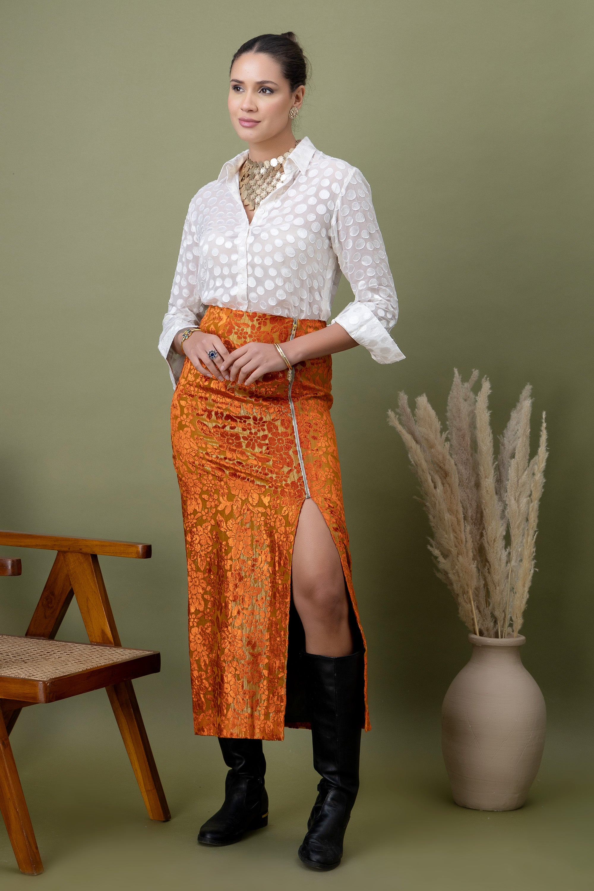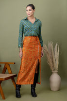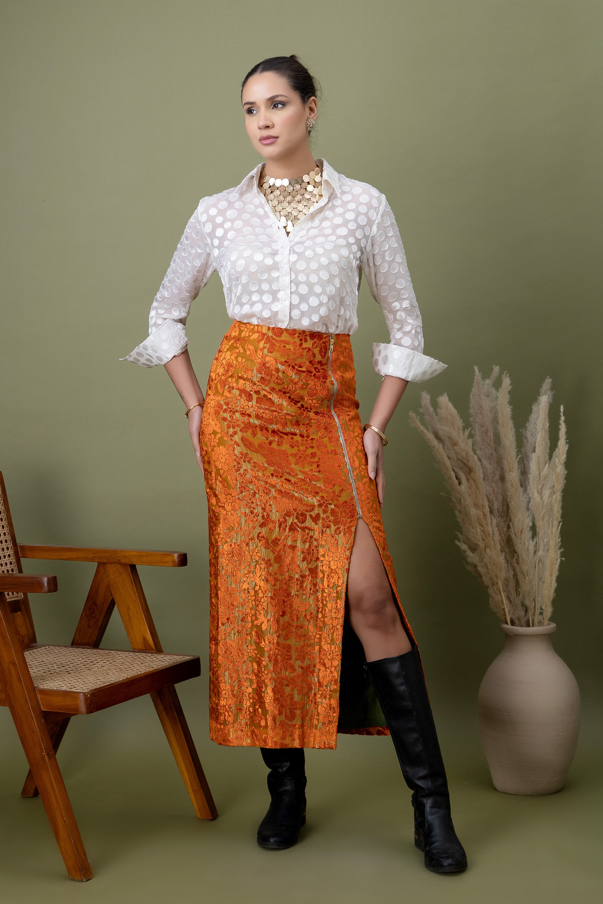 A modern pairing of a teal polka-dotted shirt with a richly textured amber lace skirt. Finished with a front slit detail, this look balances structure and drama—perfect for elevated evenings, gallery nights, and bold festive styling.