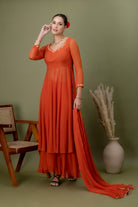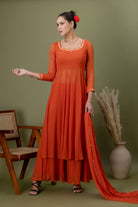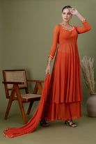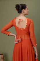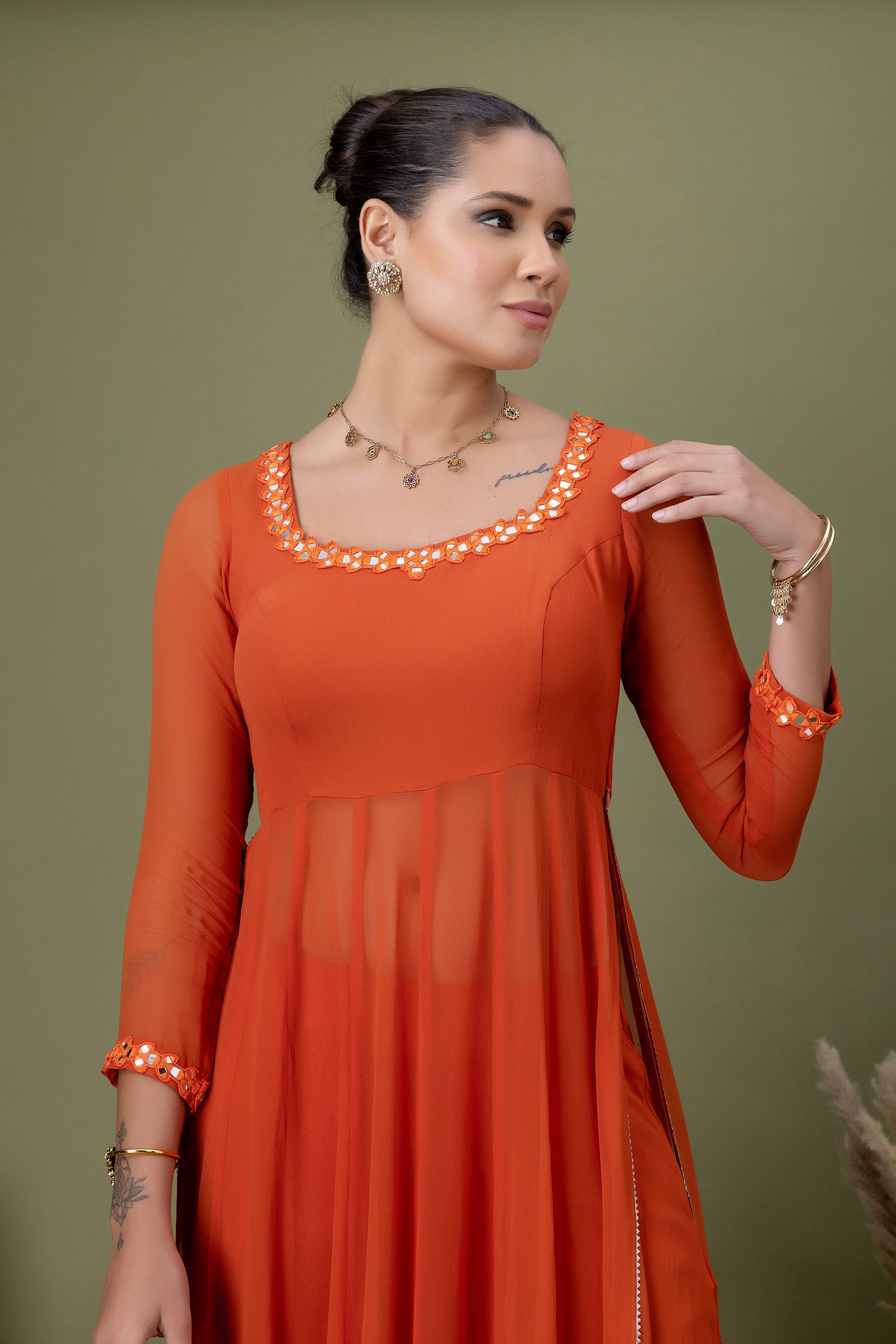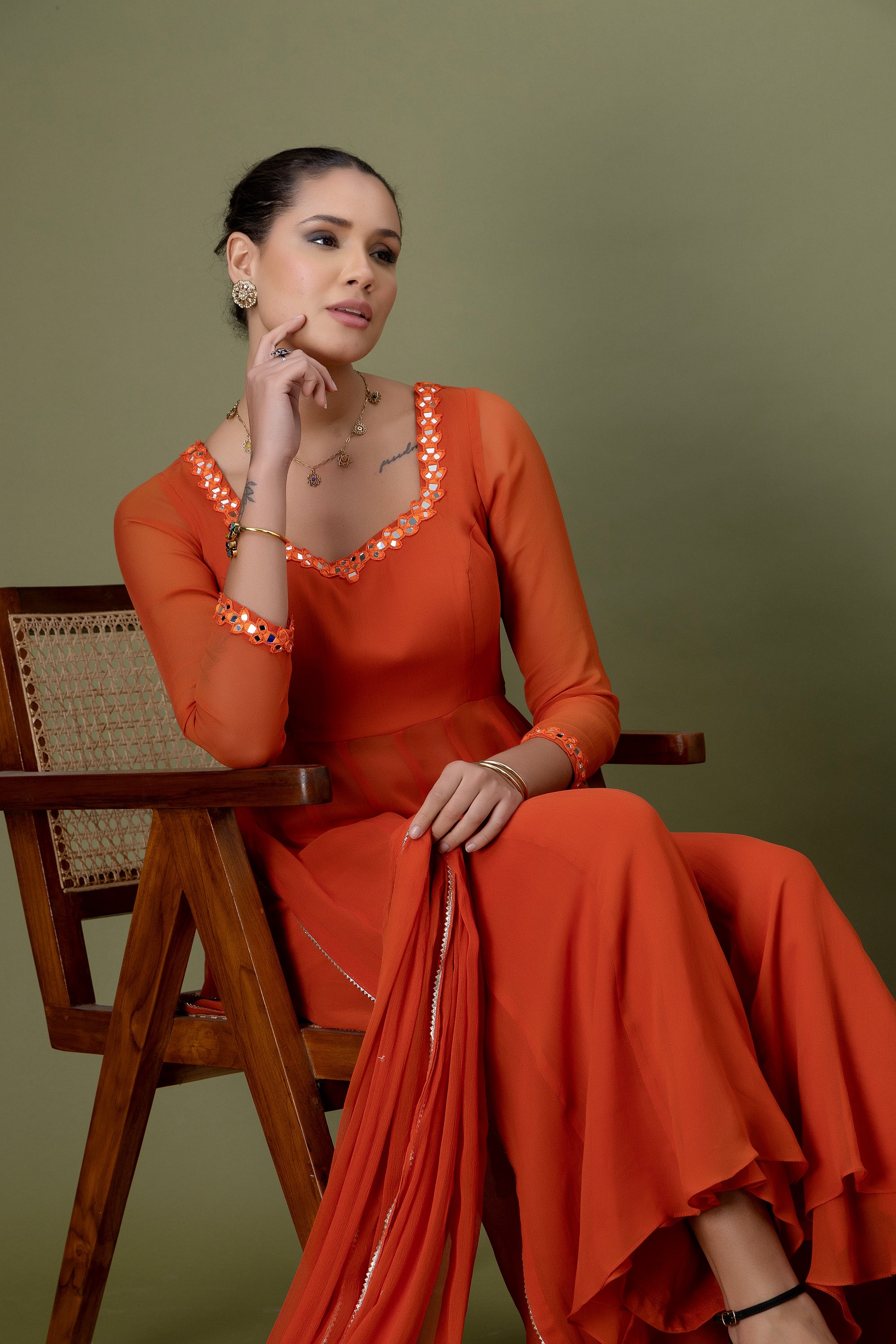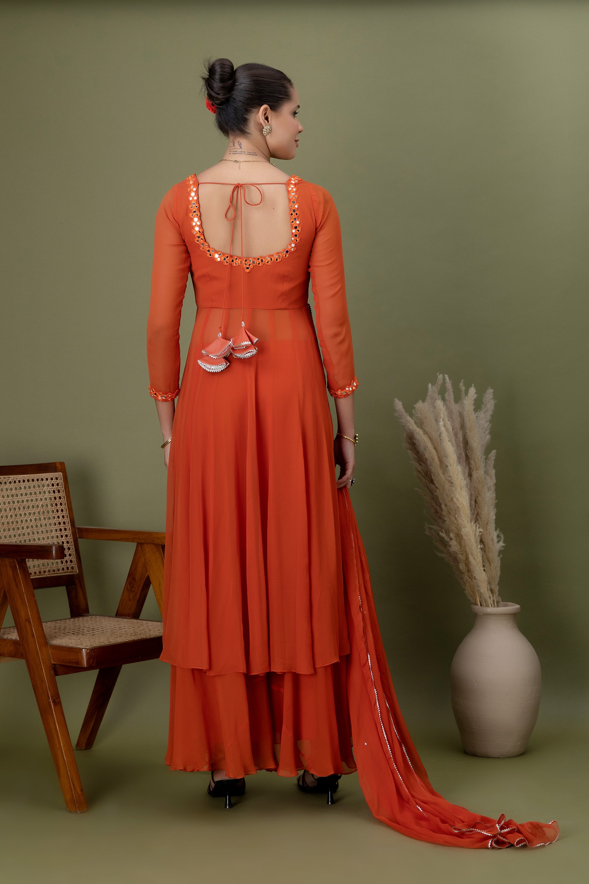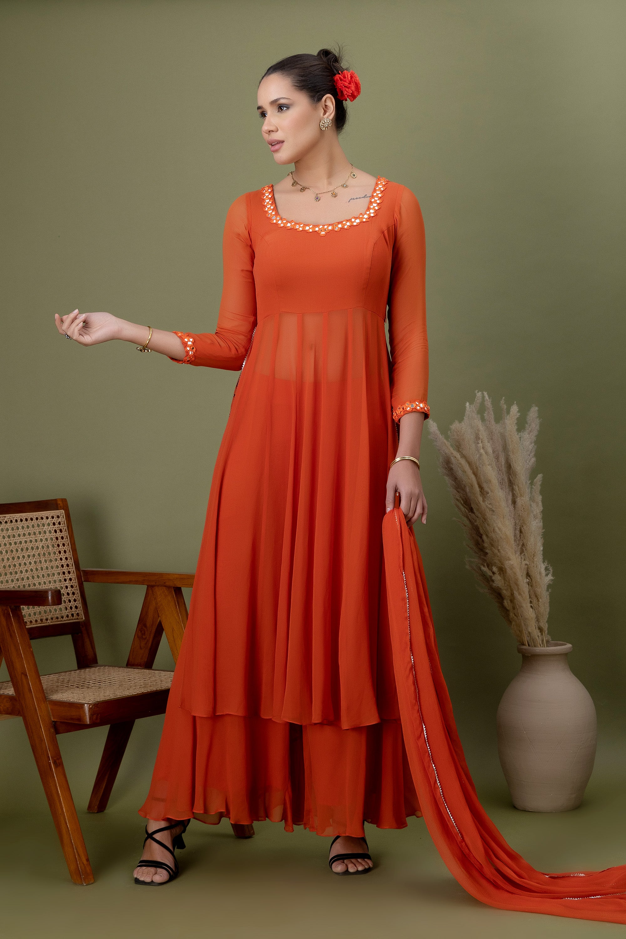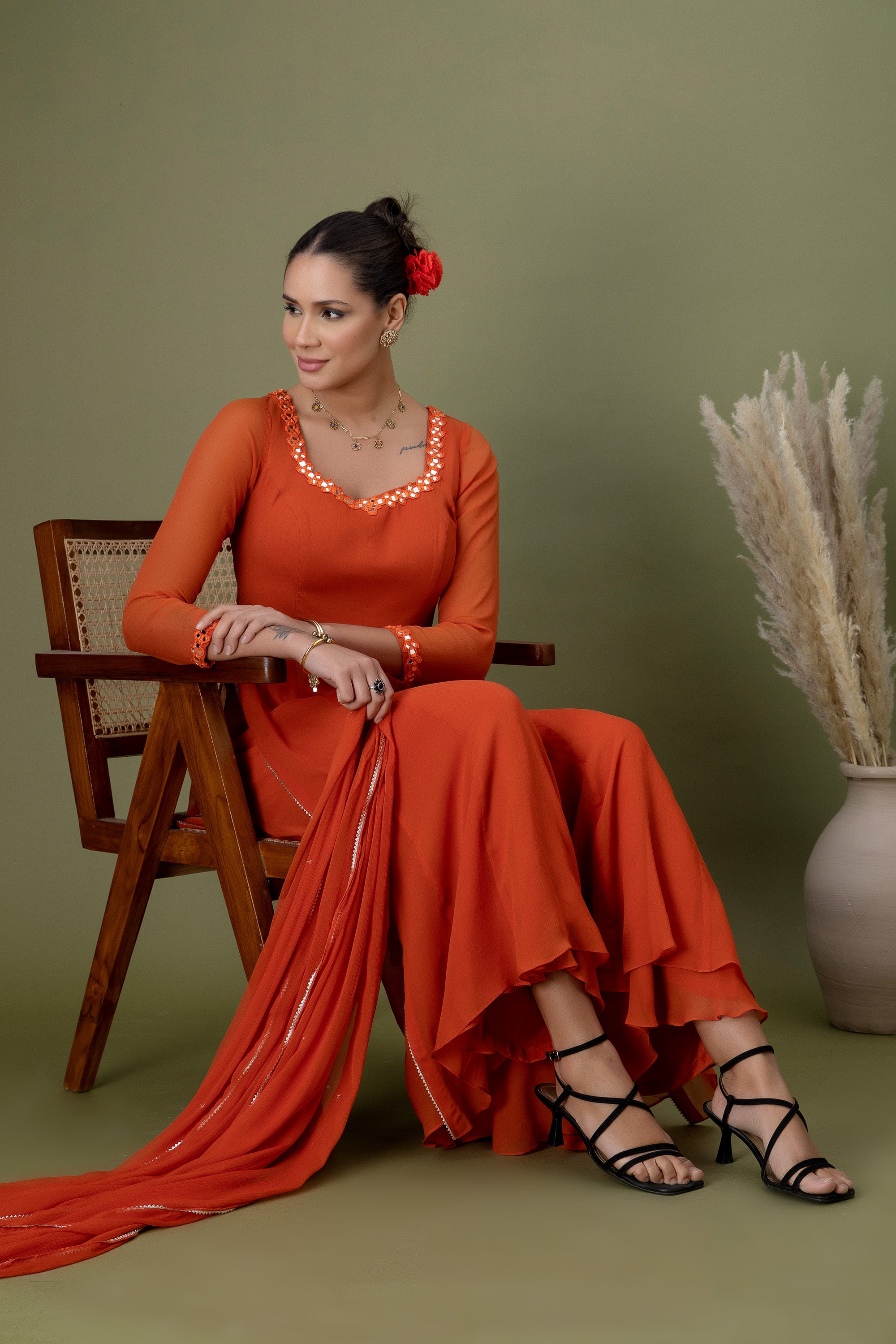 Drenched in a rich burnt-orange hue, this anarkali features delicate mirror accents along the neckline and cuffs. The flowy silhouette paired with a soft dupatta creates a look that’s festive, feminine, and perfect for celebrations from day to evening.