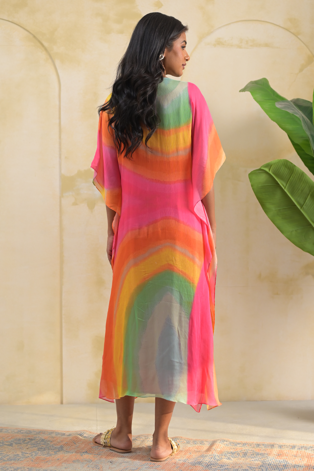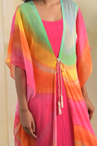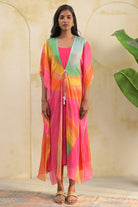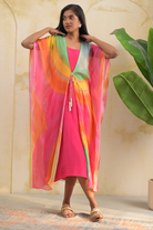 Bask in the energy of summer with this vibrant print chiffon front-open kaftan, radiating bold colors and breezy charm. The lightweight chiffon drapes beautifully, and the front-open design is perfect for a relaxed, effortless look. Paired with a soft pink crepe inner, this ankle-length piece is ideal for warm days—elevated, yet wonderfully comfortable.the pearl tassels to tie, make it super chick for breezy weather.