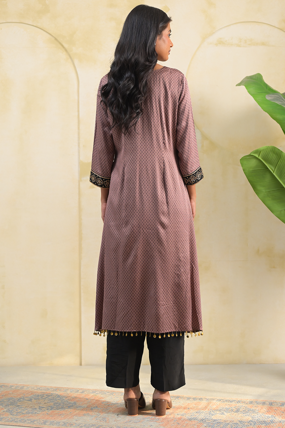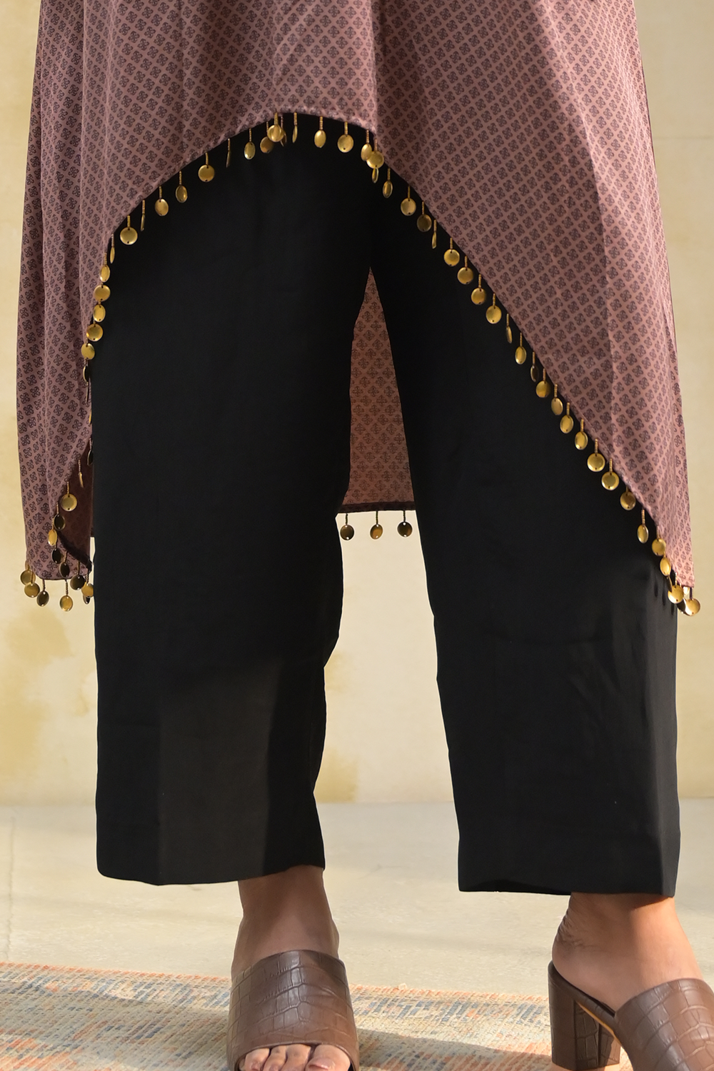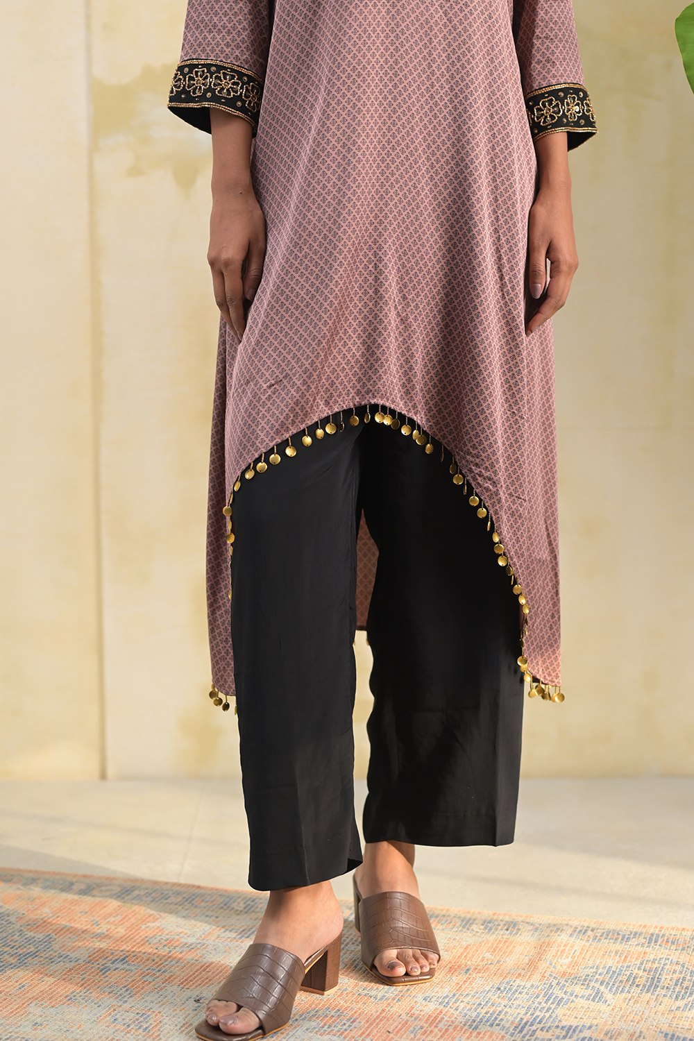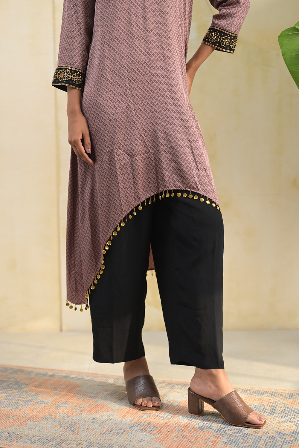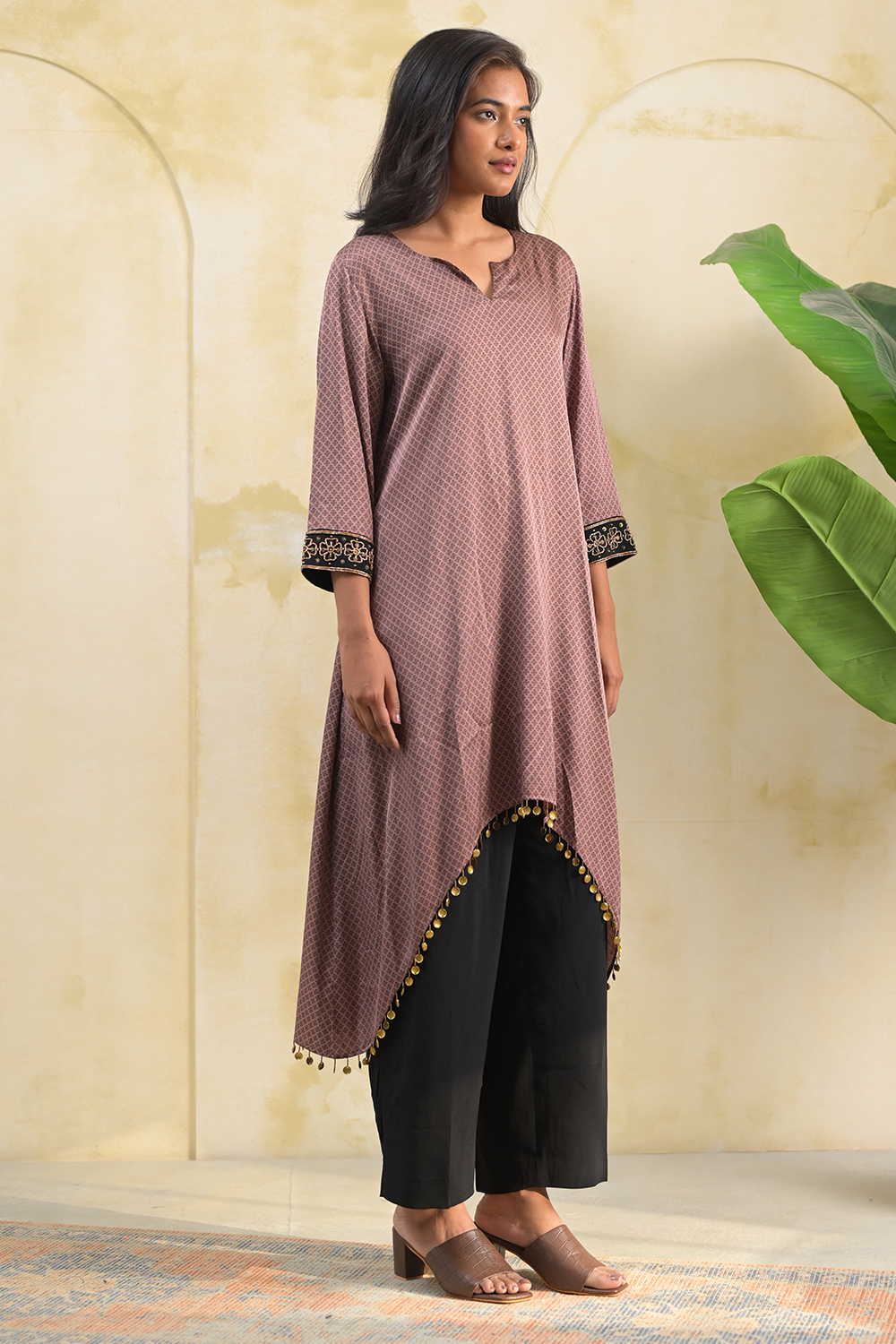 Crafted from soft modal, this brown kurta set features a stylish hi-low cut, offering a modern twist on a classic silhouette. The full sleeves are adorned with exquisite hand embroidery, adding a refined touch. Paired with sleek black pants, this regular-fit ensemble is perfect for both everyday elegance and special occasions.