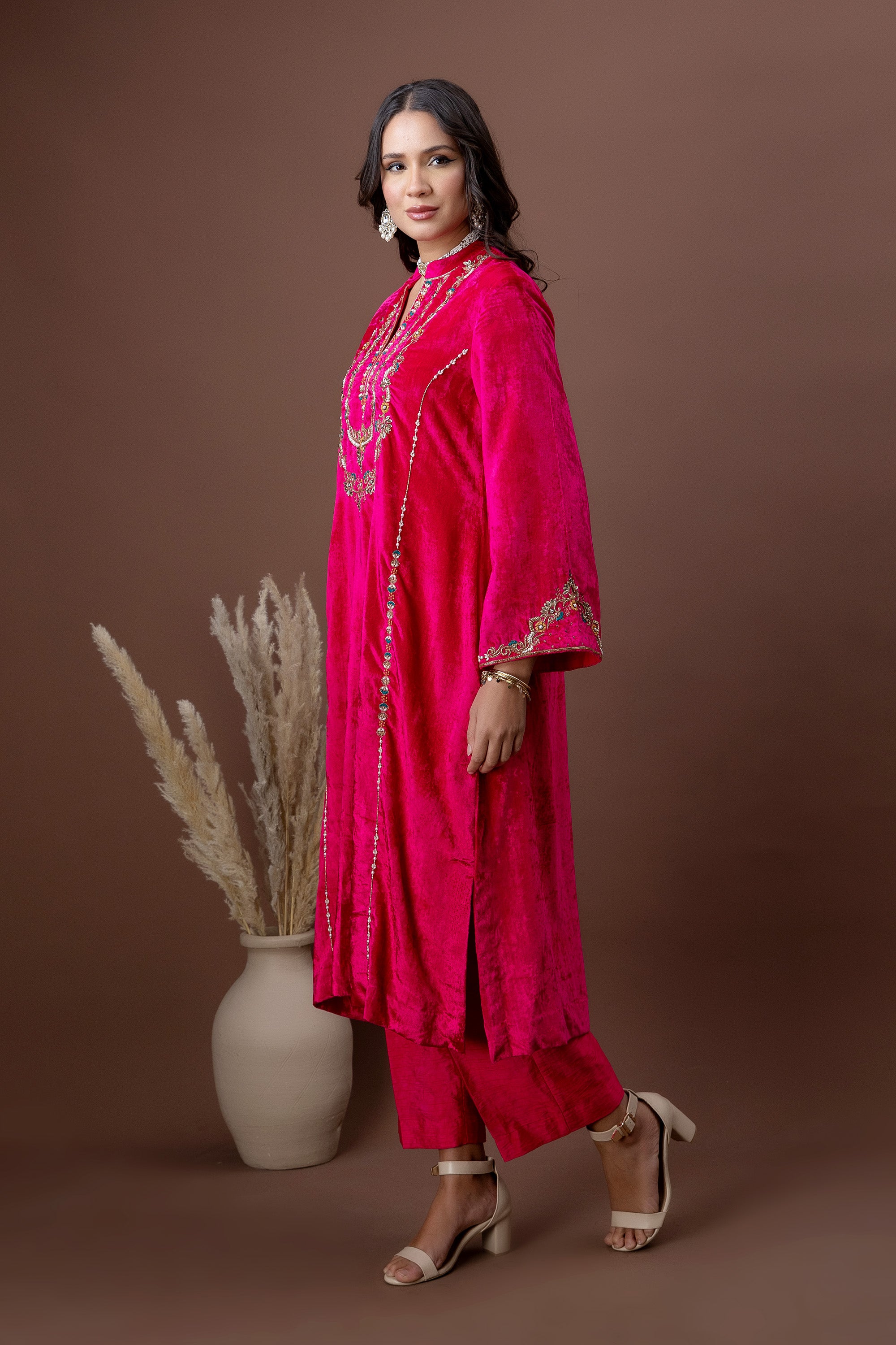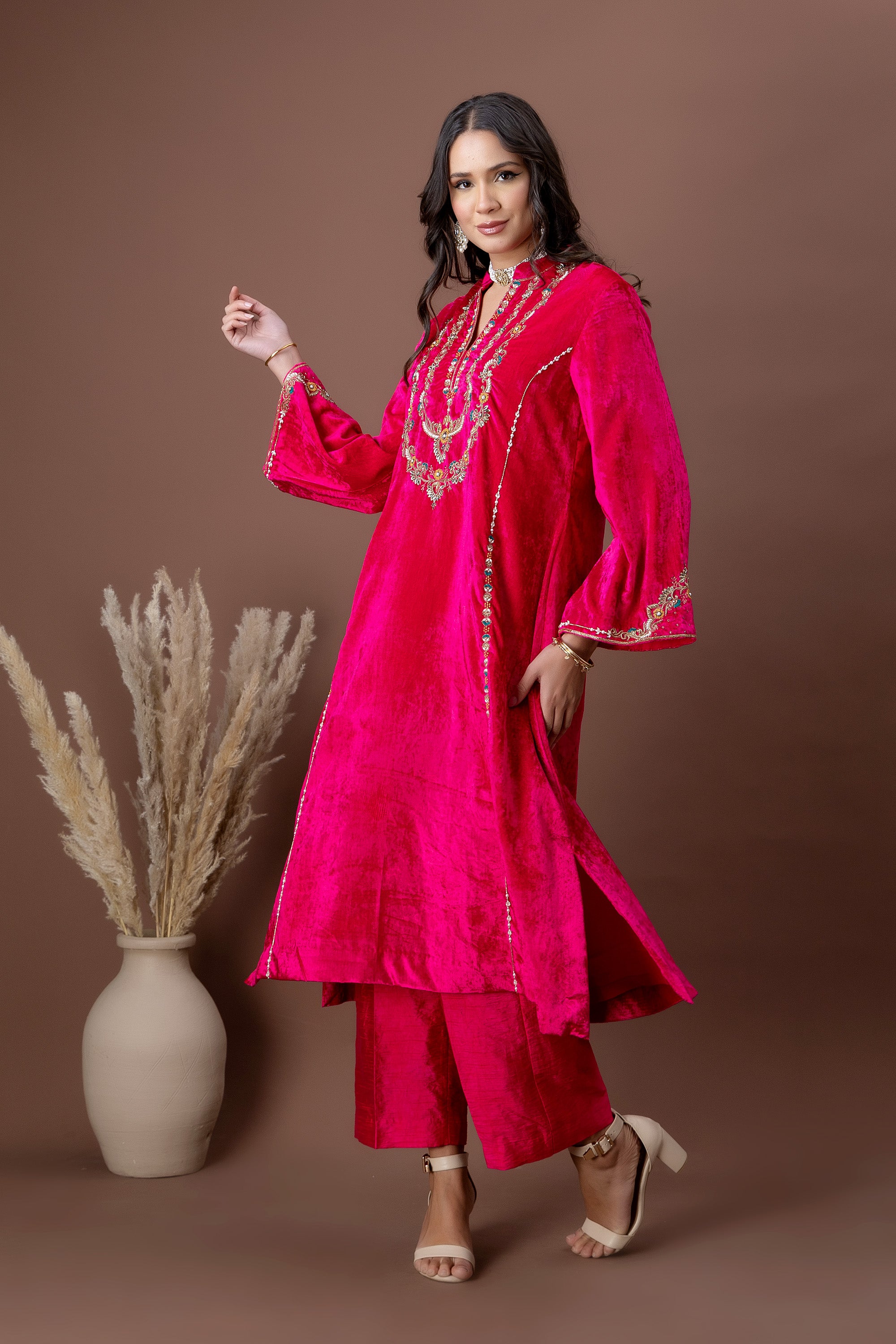 Gulnaar Fuchsia Velvet Kurta Set