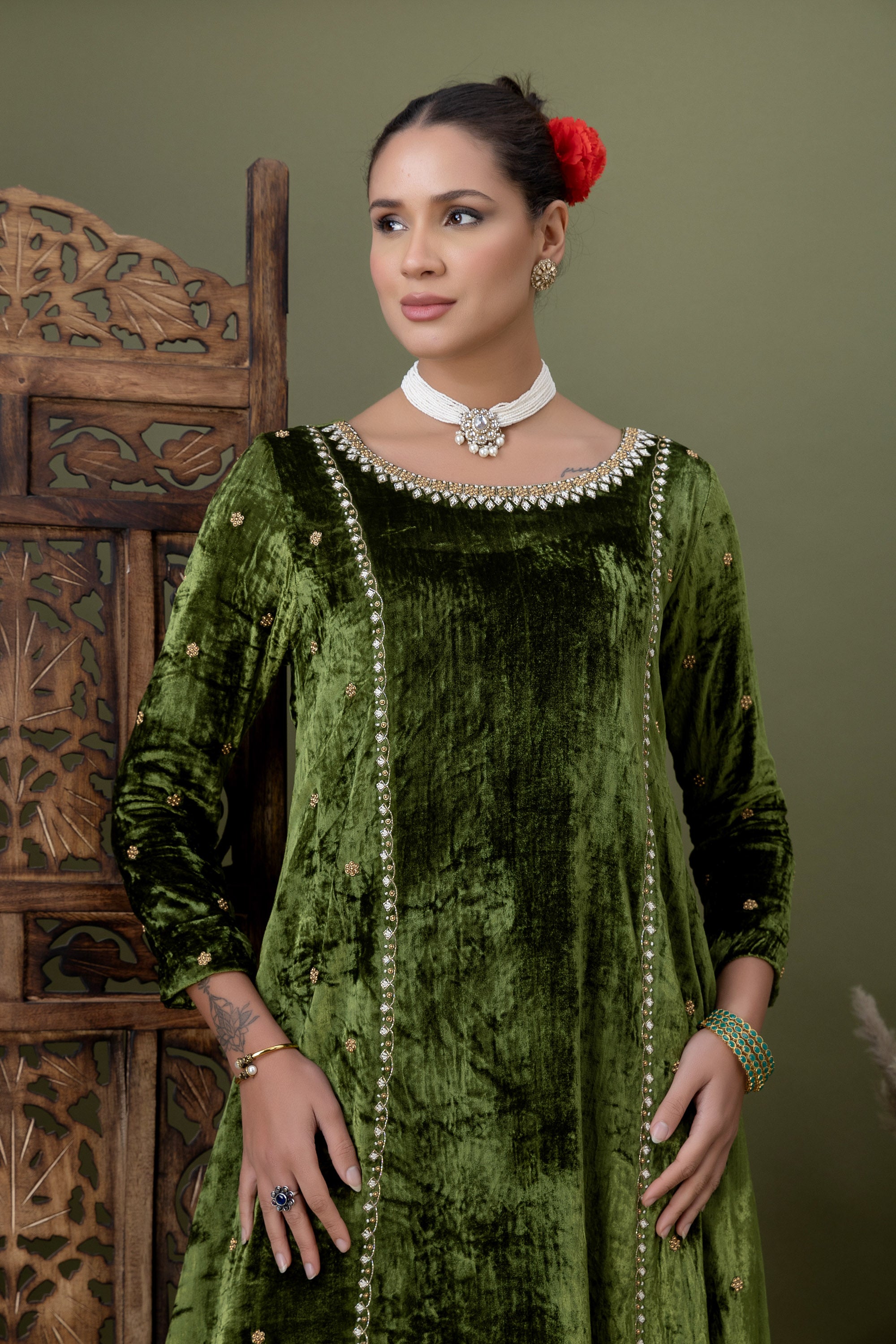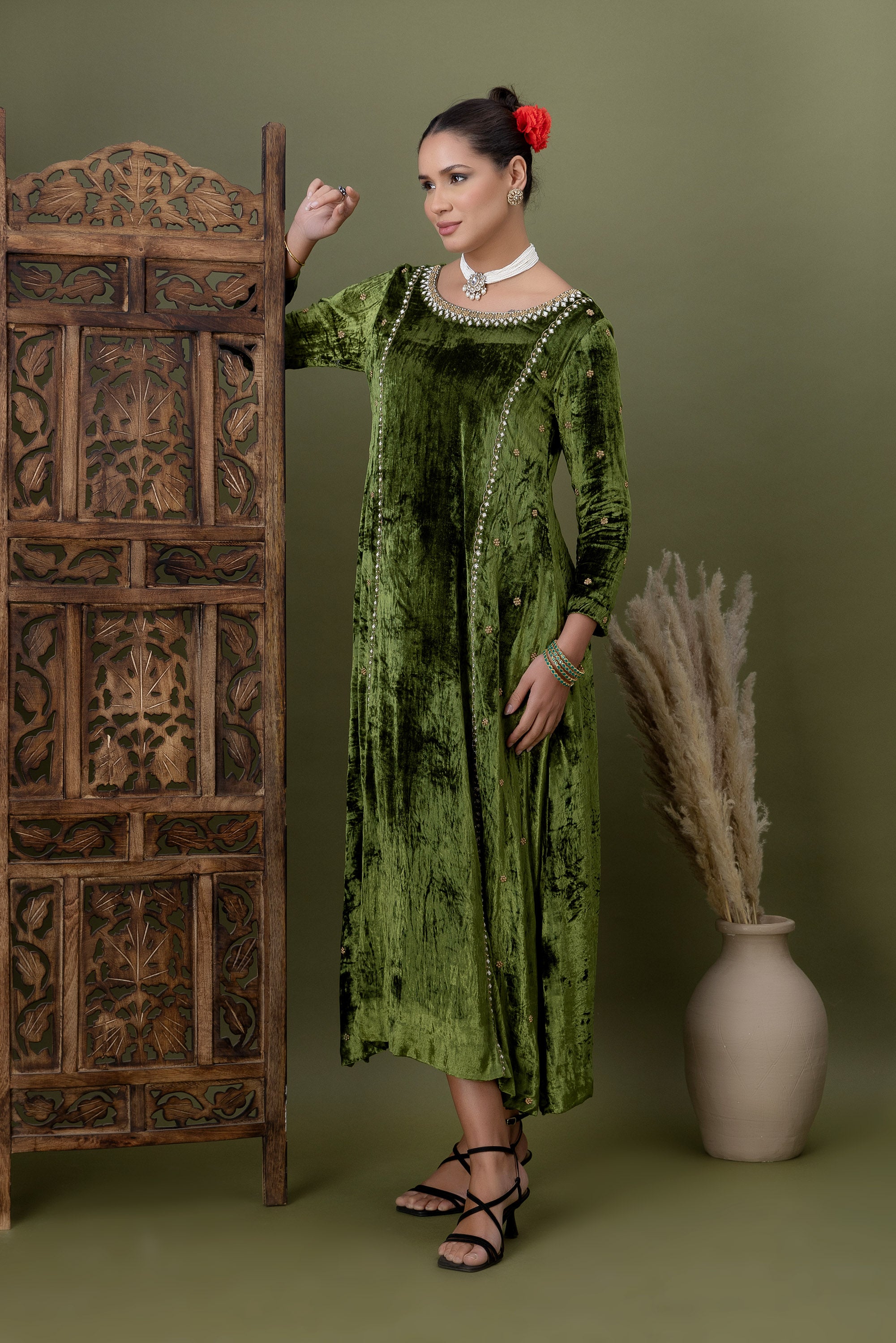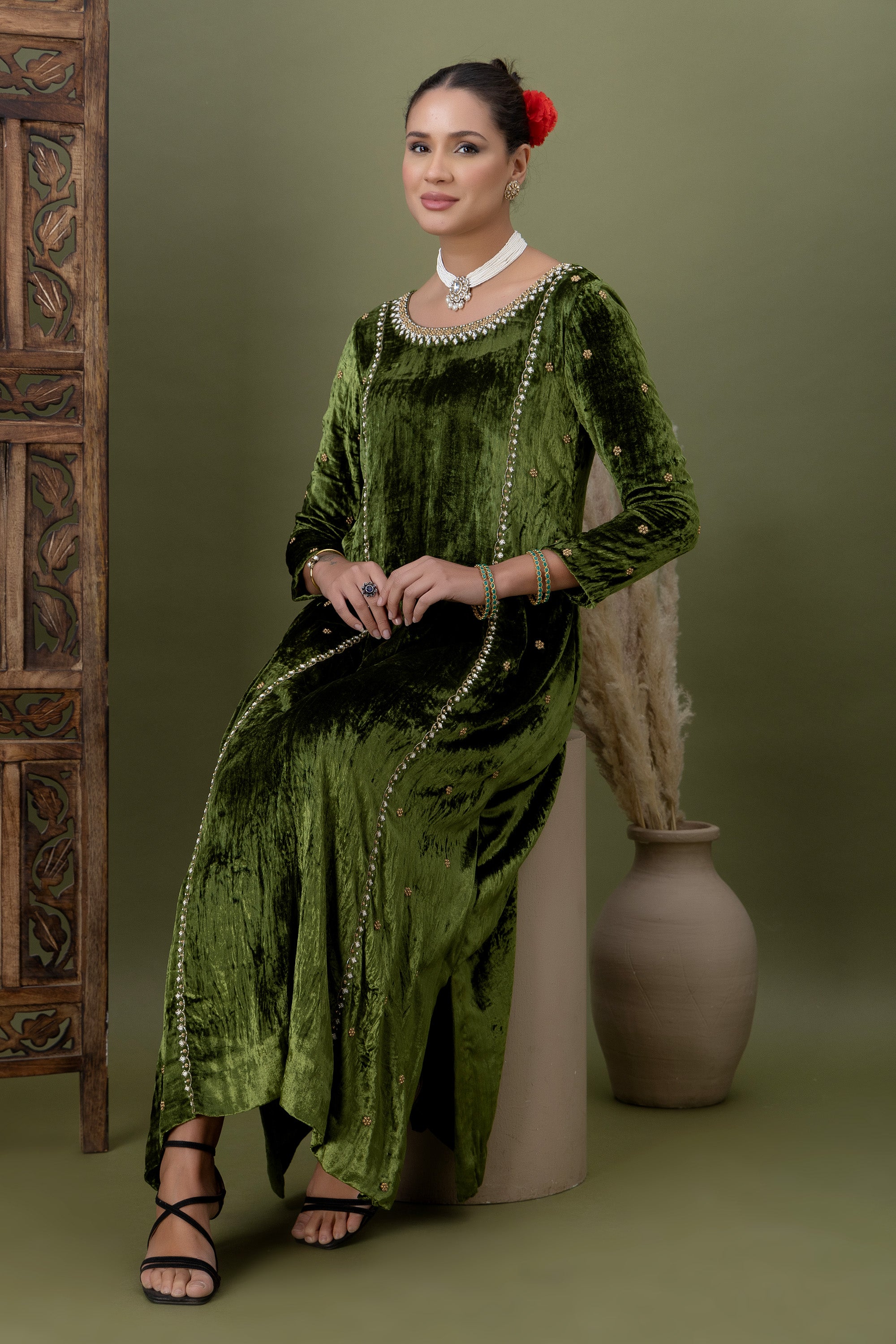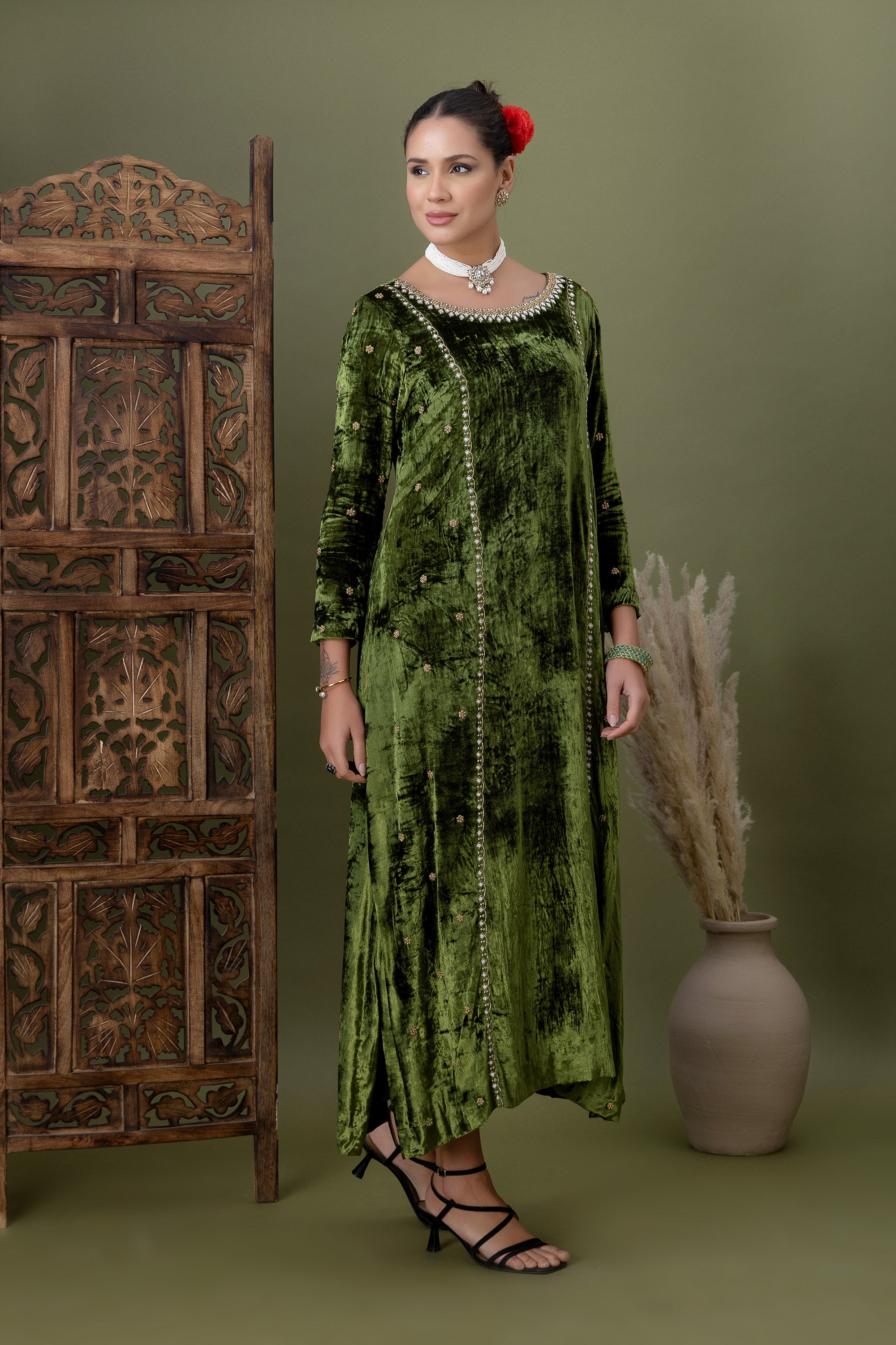 Soft velvet meets delicate craftsmanship in this olive green kurta, highlighted with subtle embellishments along the seams and neckline. A graceful choice for celebrations that call for quiet luxury and refined elegance.