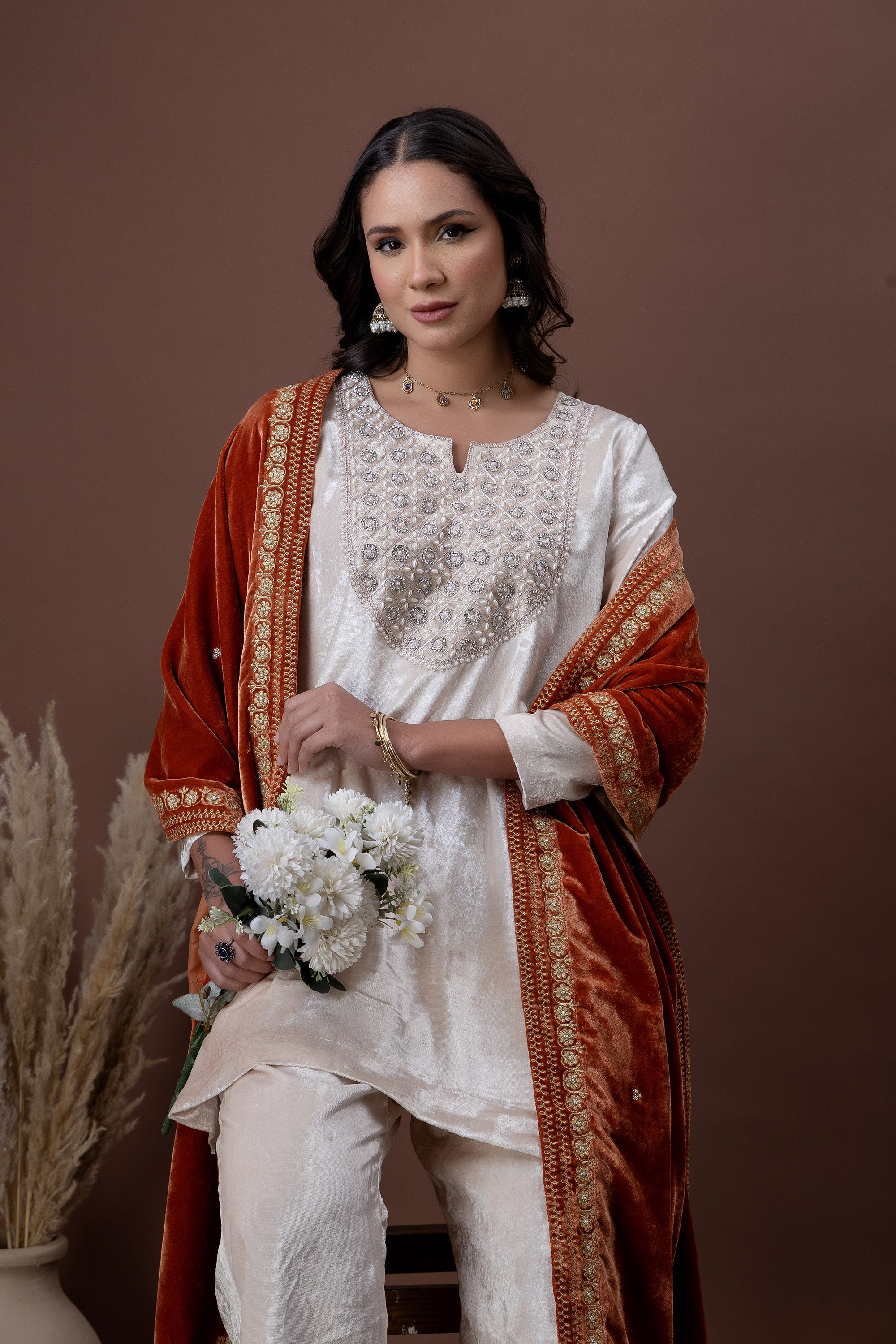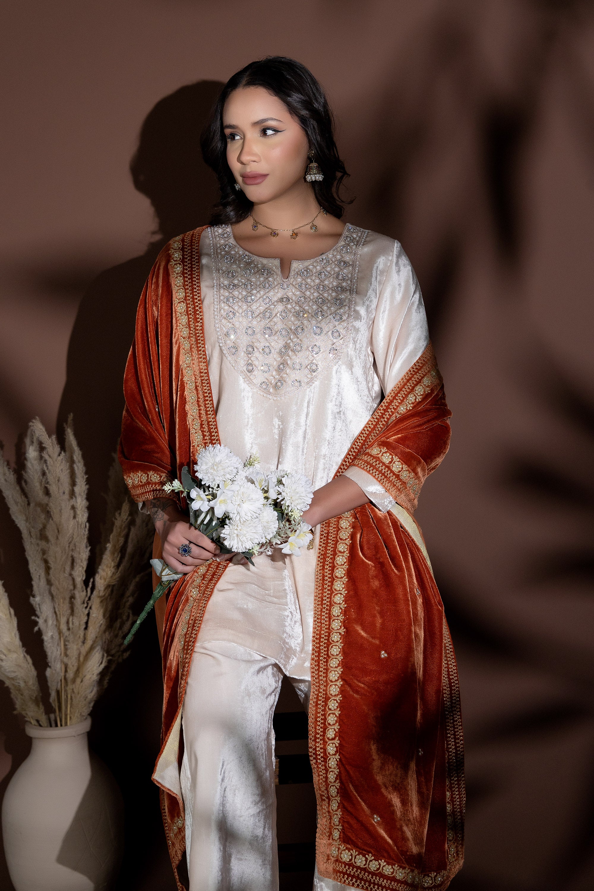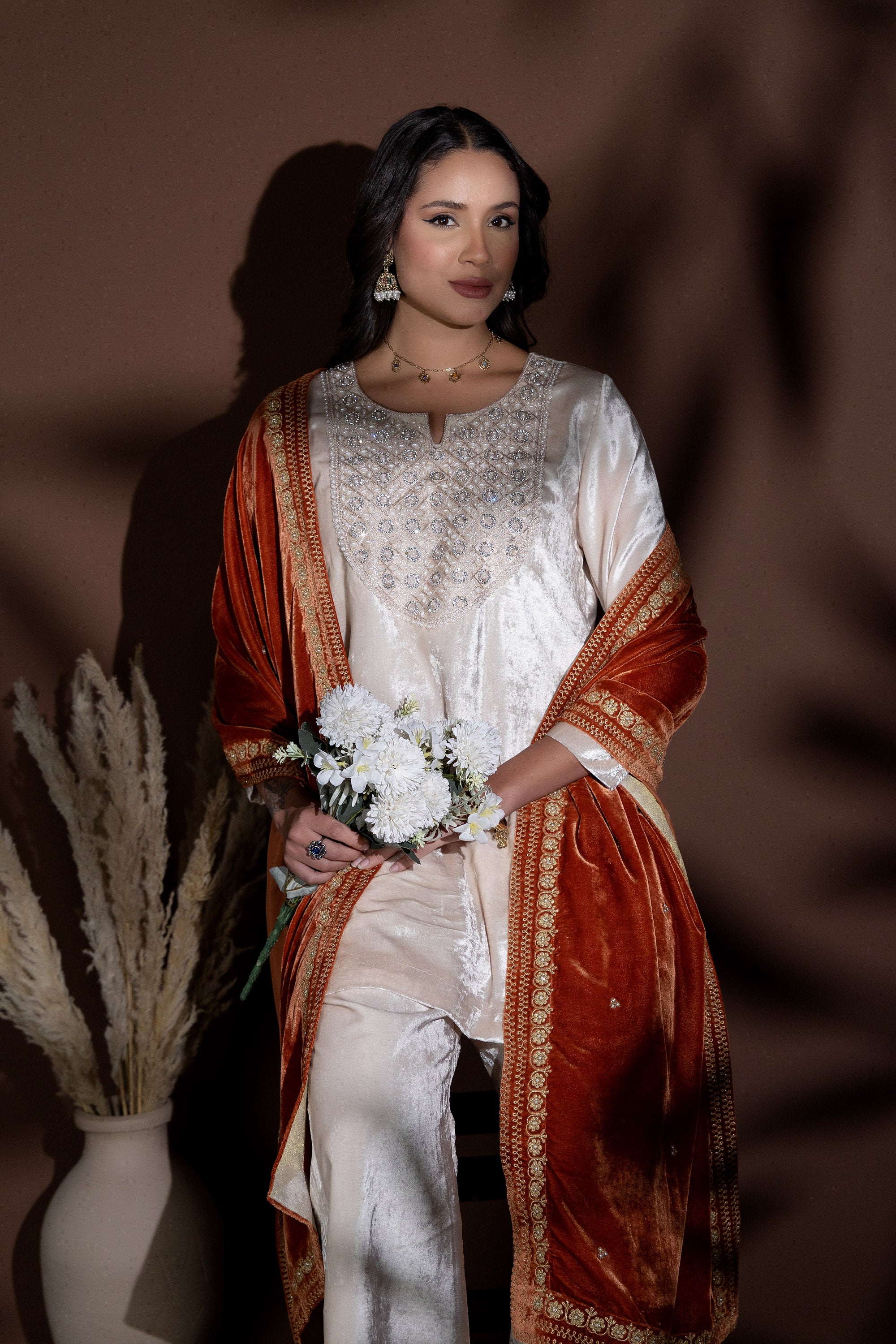 A timeless ivory kurta set paired with a rich rust velvet dupatta, delicately finished with ornate embroidered borders and subtle embellishments. The plush texture and warm tones make it perfect for festive evenings, intimate celebrations, and winter weddings.