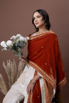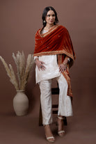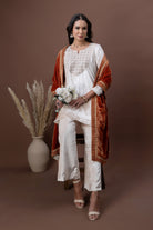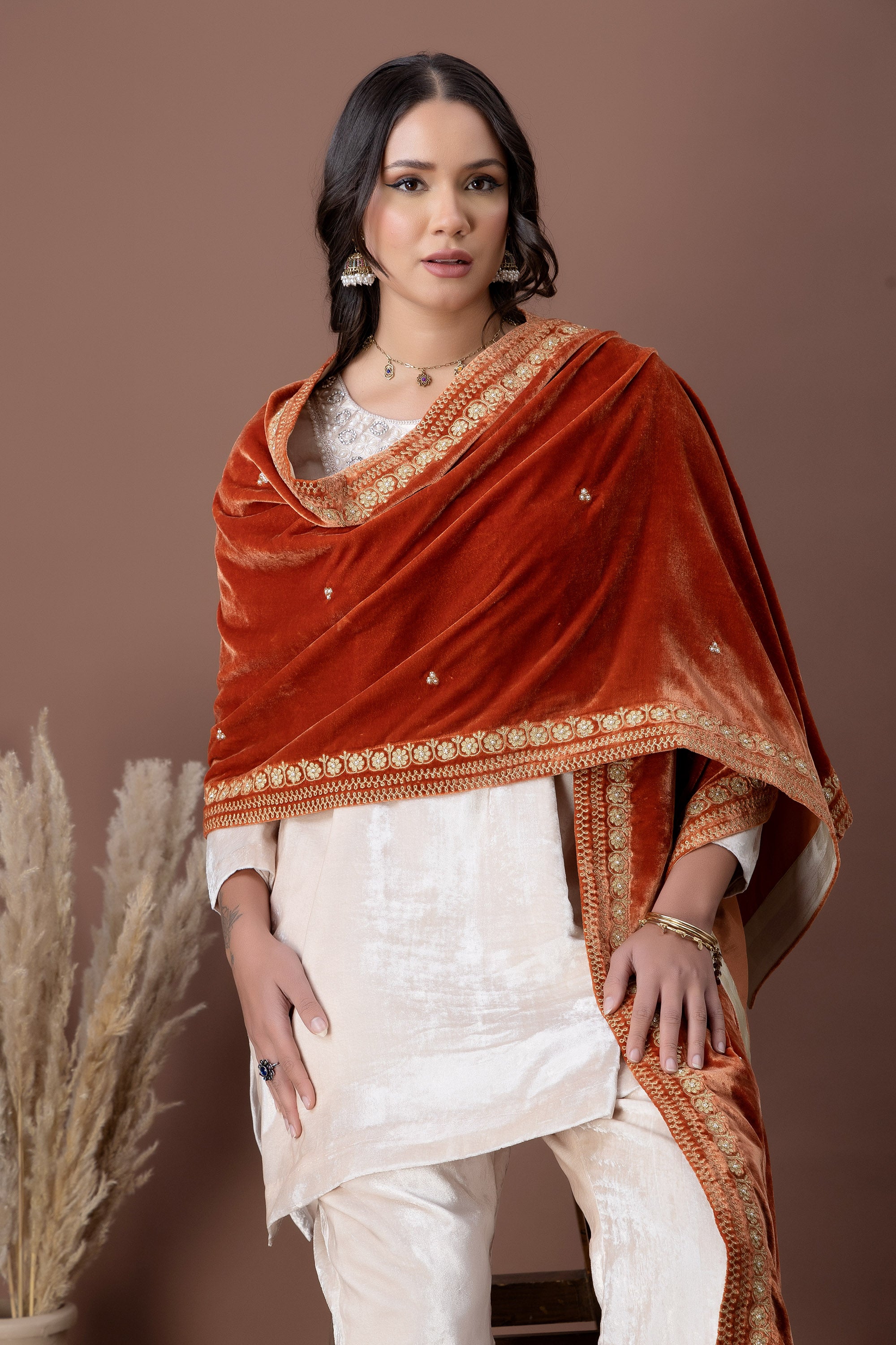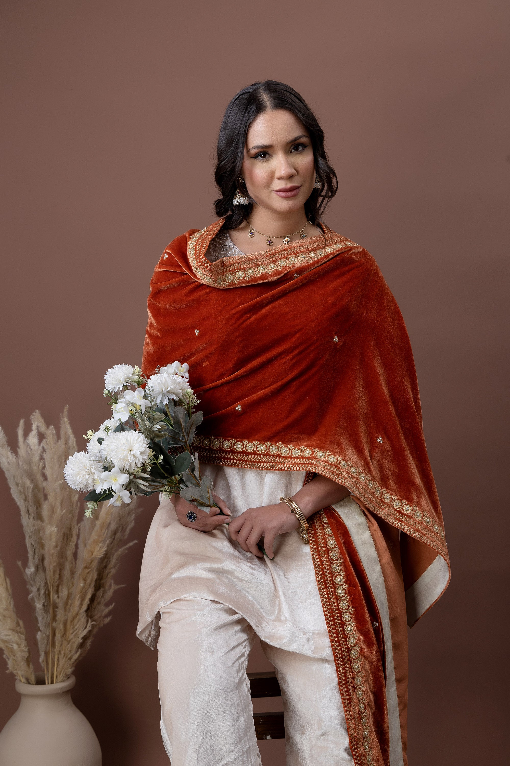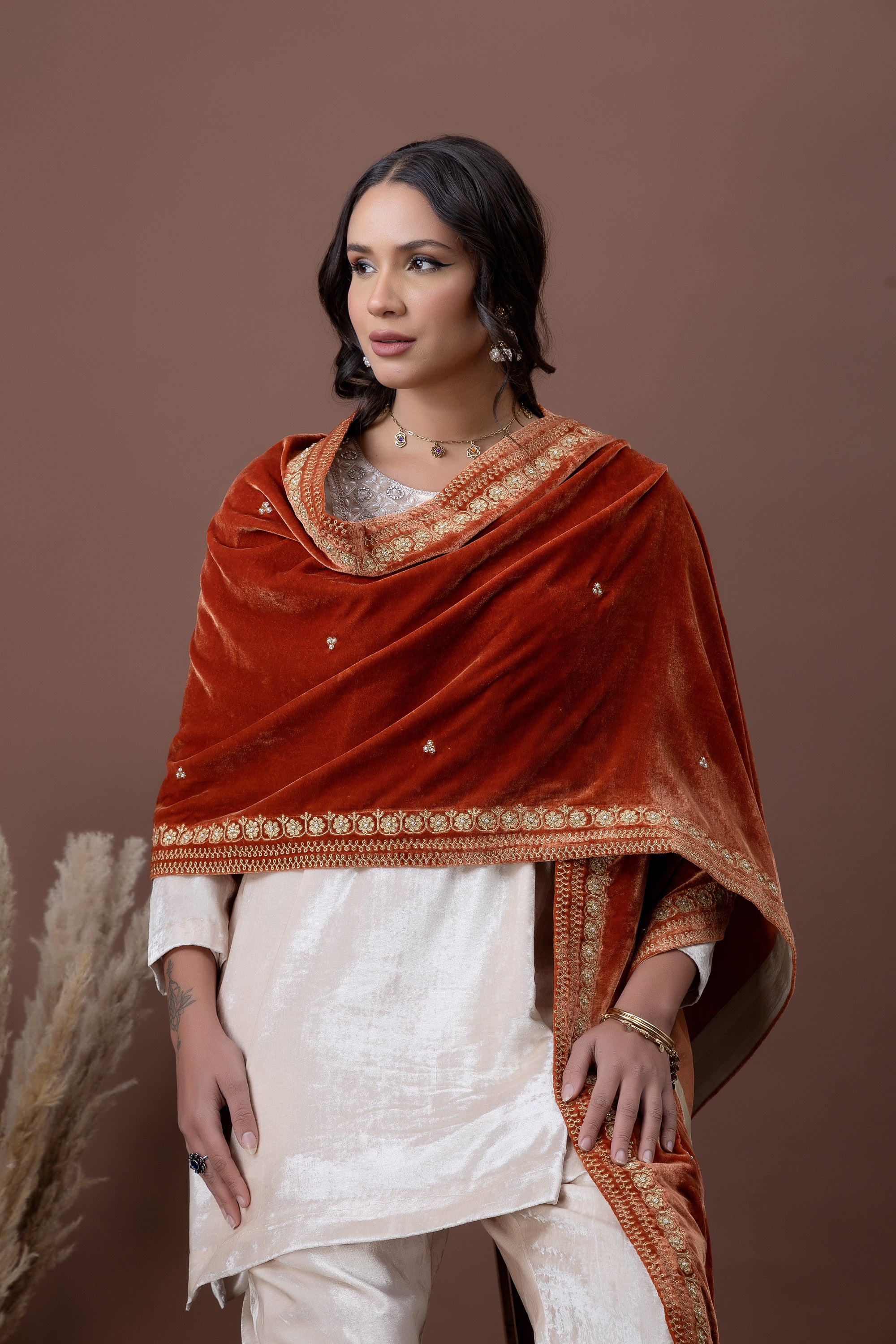 A timeless ivory kurta set paired with a rich rust velvet dupatta, delicately finished with ornate embroidered borders and subtle embellishments. The plush texture and warm tones make it perfect for festive evenings, intimate celebrations, and winter weddings.