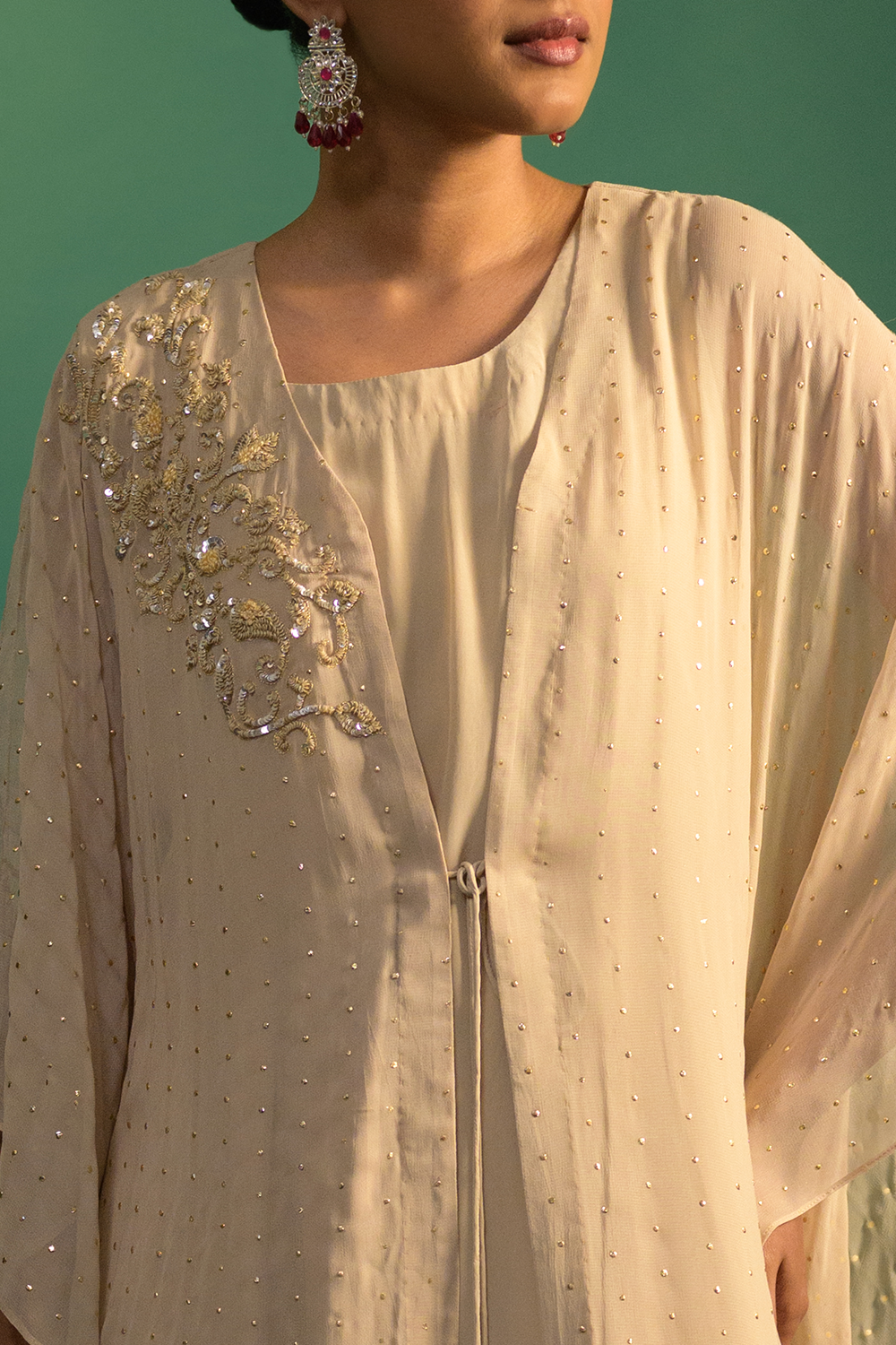 Crafted in a soothing beige palette, this front-open kaftan is a perfect blend of understated elegance and artisanal detail. Designed for effortless sophistication, the silhouette flows gracefully, offering both comfort and refined style.