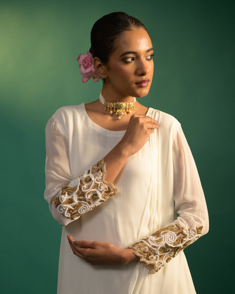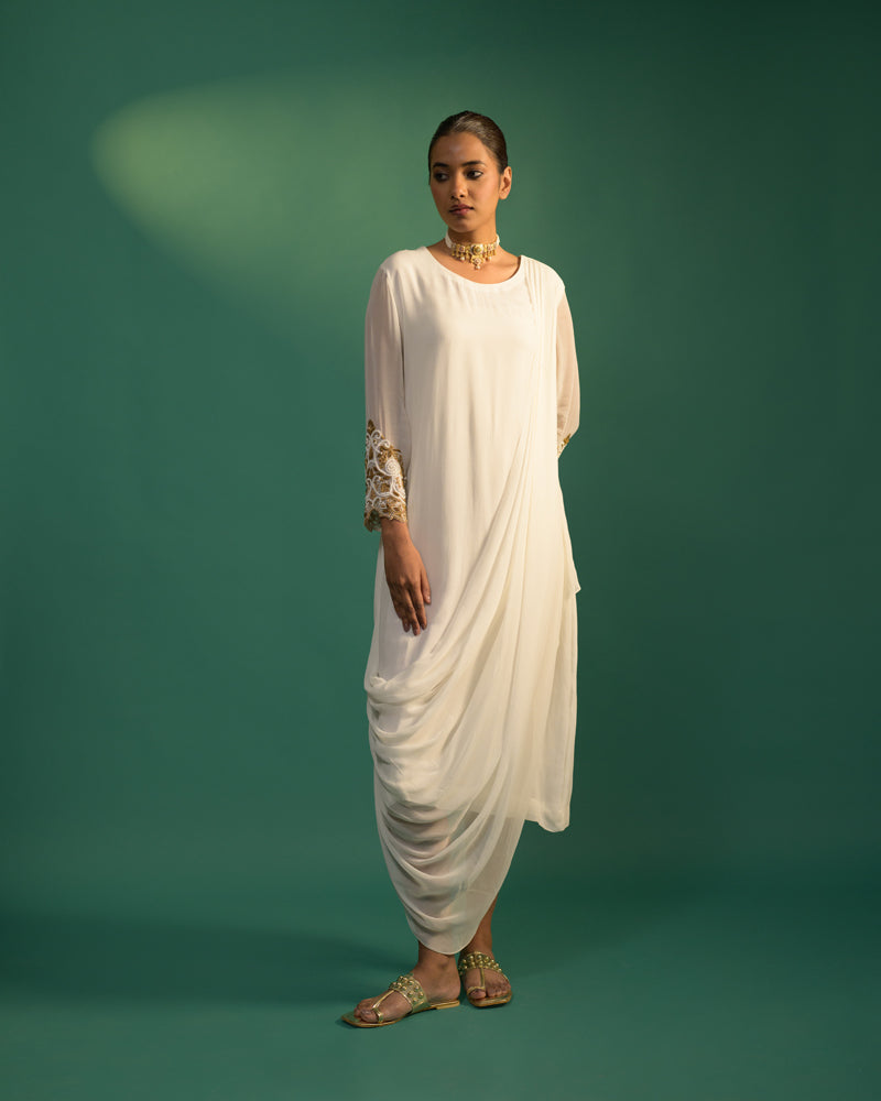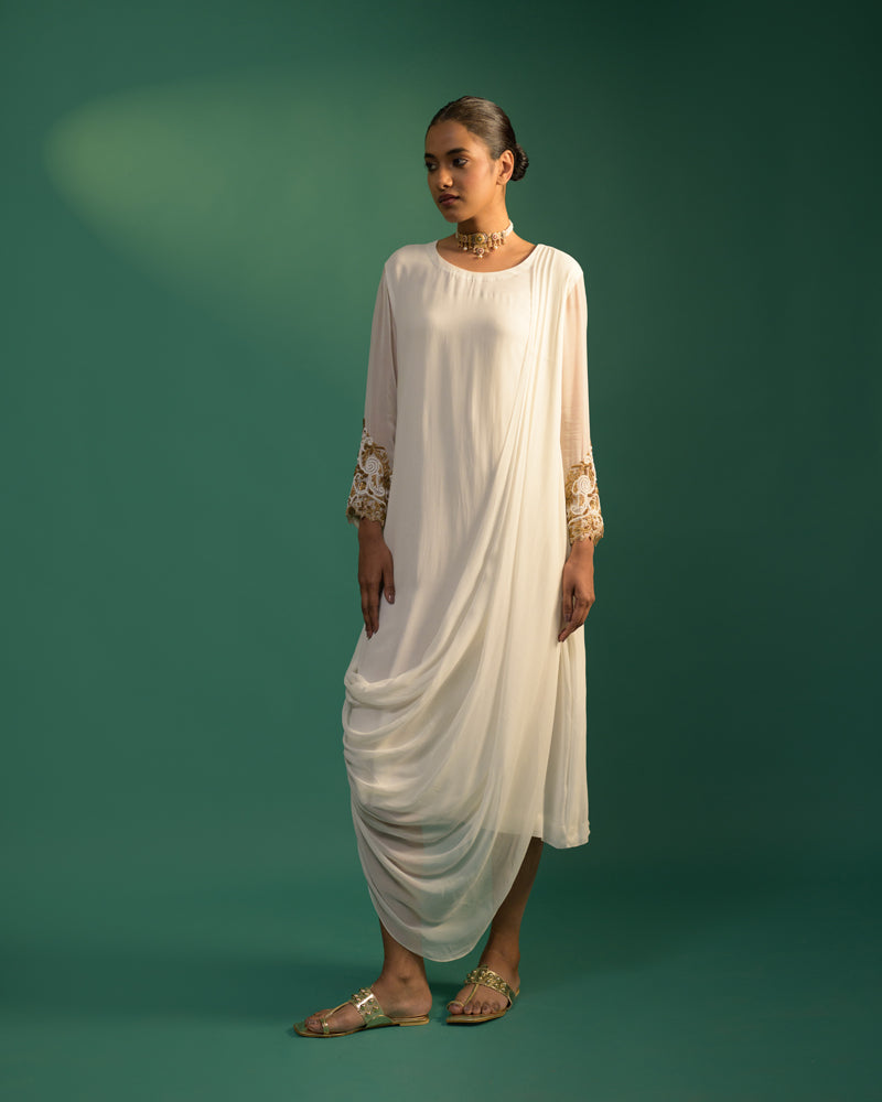 Midi Draped Dress in Georgette with Hand Embroidered Sleeves