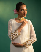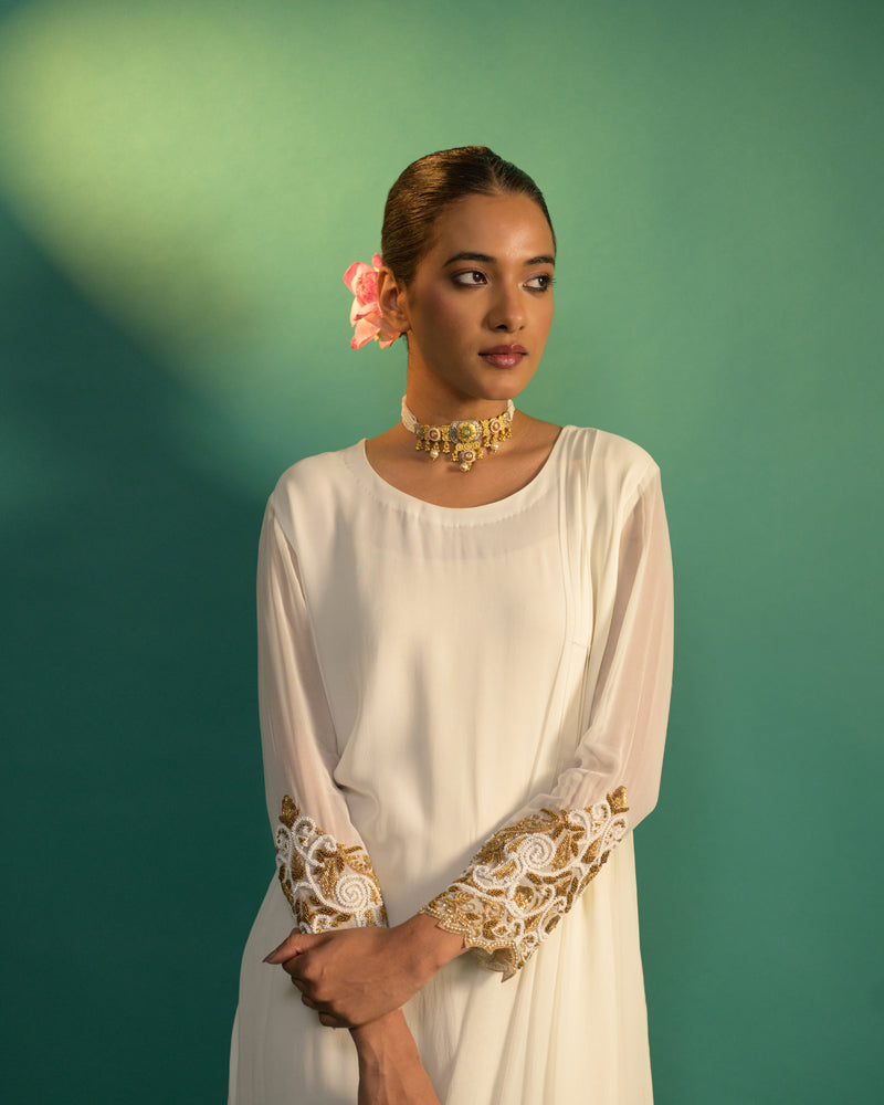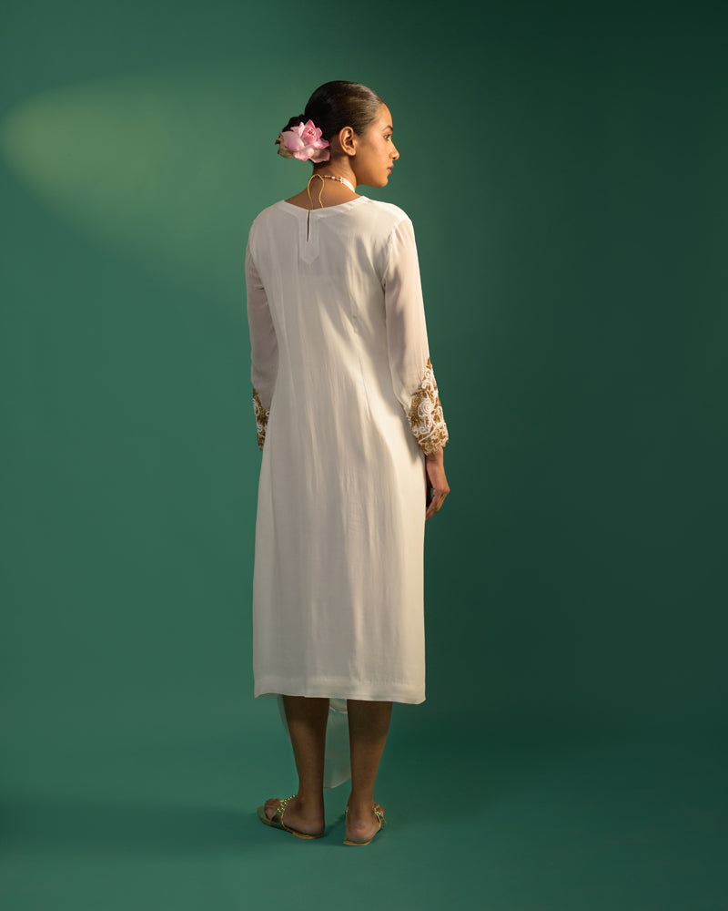Effortlessly elegant, this midi-length dress in soft georgette drapes beautifully, creating a graceful silhouette. The highlight is the exquisite hand embroidery on the full sleeves, adding a delicate touch of art to every movement. Perfect for evening soirees or special occasions, this dress is a timeless piece that radiates understated glamour.