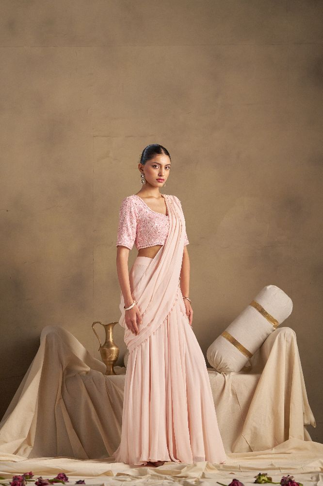 This elegant ensemble features a nude pink blouse richly adorned with heavy all-over handwork in sequins, cutdana, and zardozi, beautifully detailed on both the front and back. It is paired with a flowing georgette saree, highlighted with a striking four-side heavy embroidered border and scattered rainbow sequin work across the drape, adding a vibrant shimmer and festive elegance to the look.