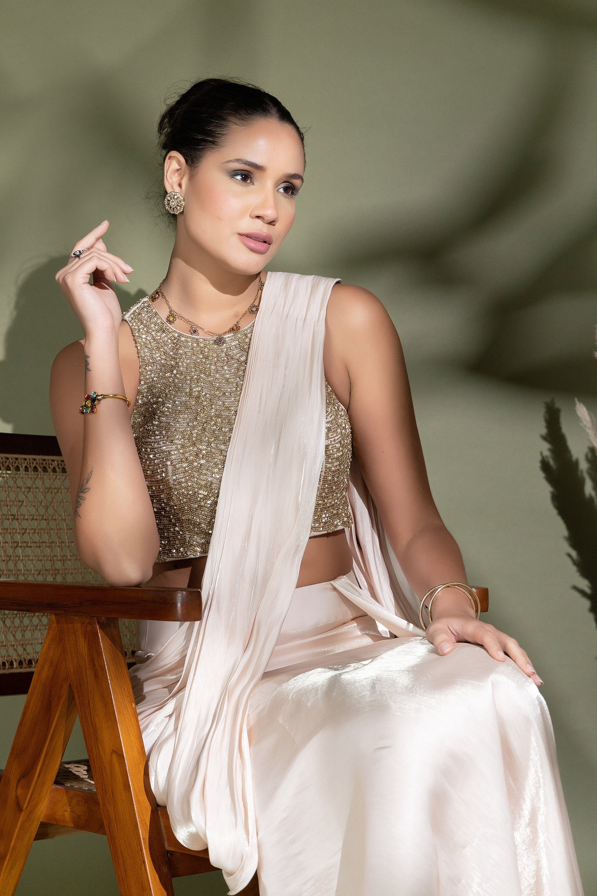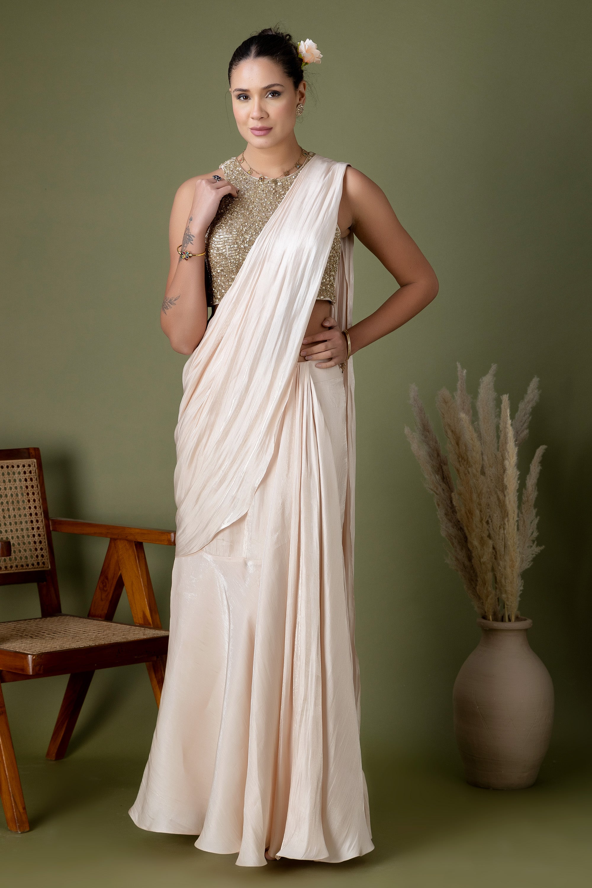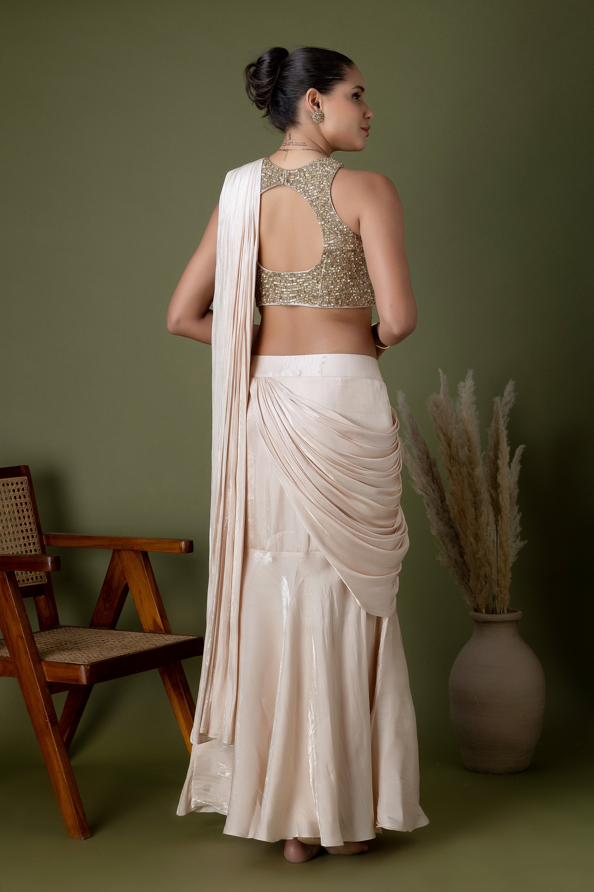 This modern ivory saree set combines clean draping with a statement sequin-embroidered blouse. Light, fluid, and elegant, it’s designed for celebrations that call for understated luxury.