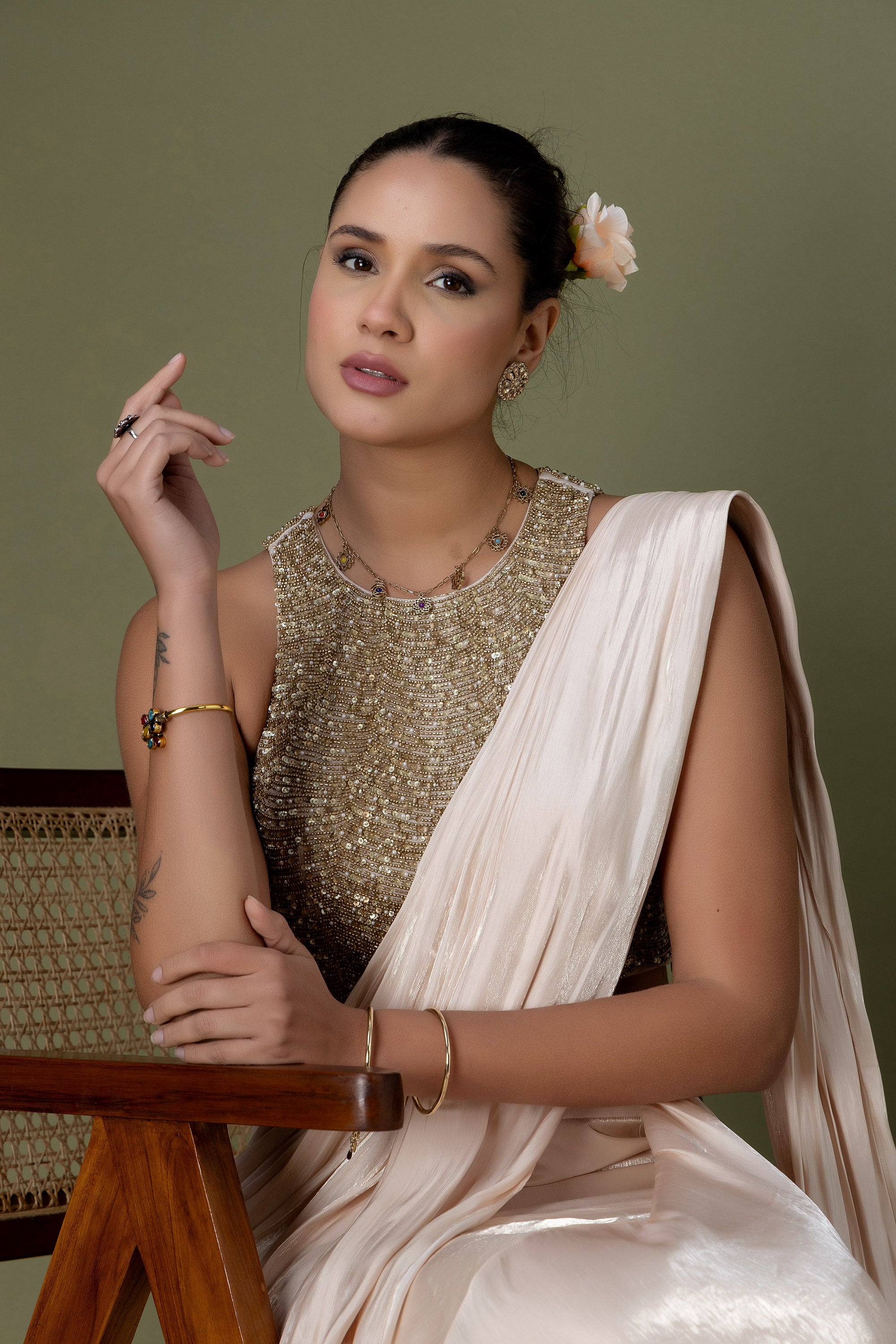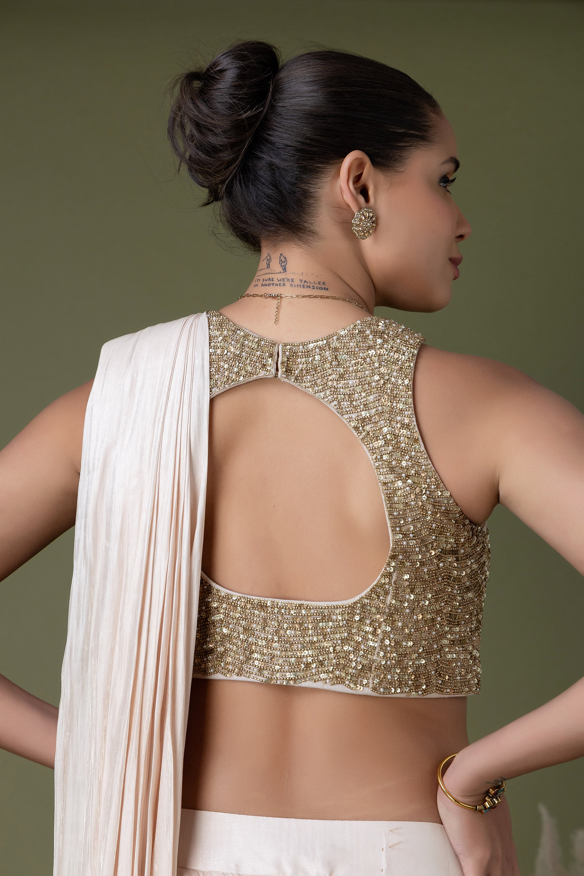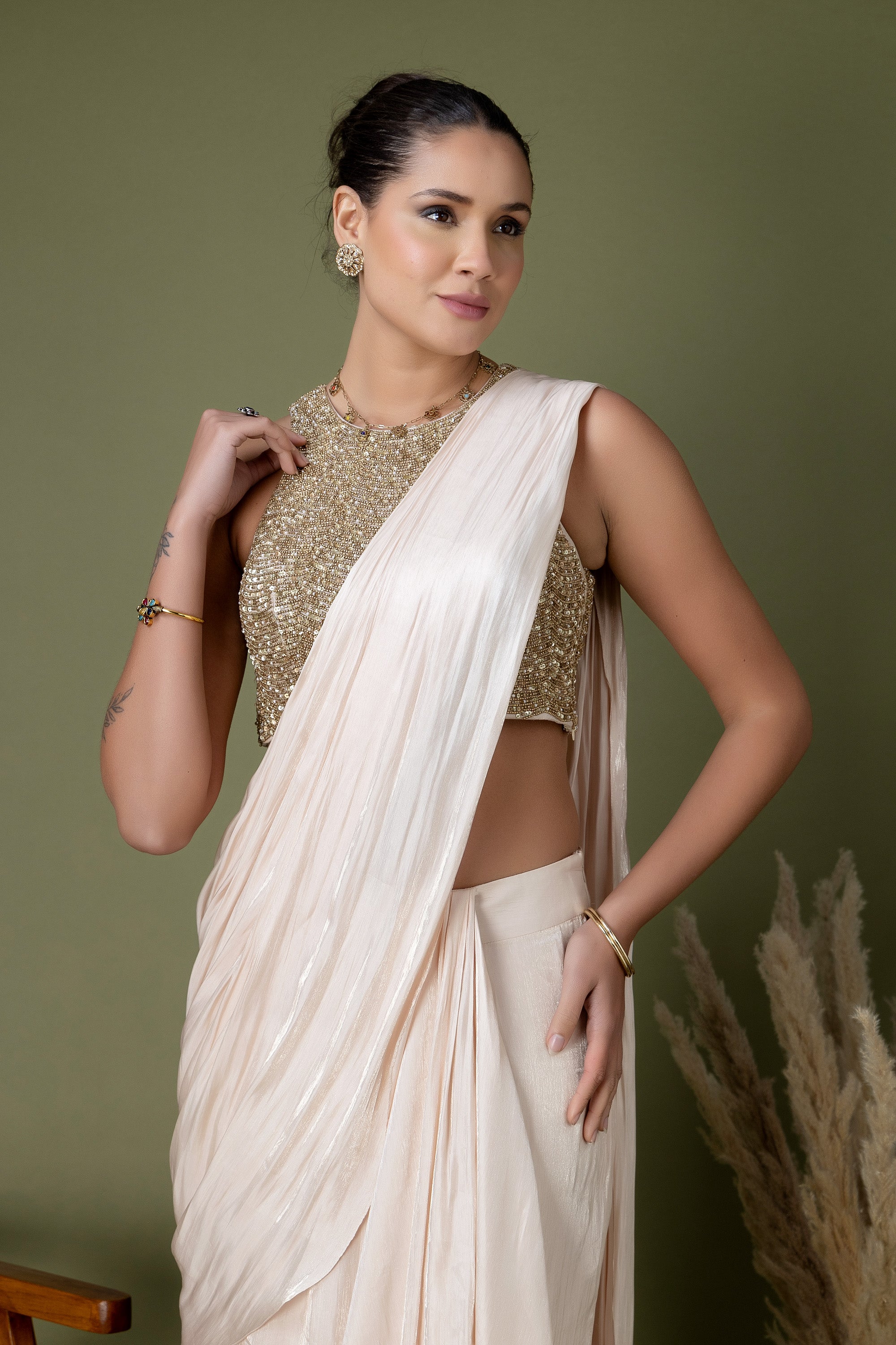 This modern ivory saree set combines clean draping with a statement sequin-embroidered blouse. Light, fluid, and elegant, it’s designed for celebrations that call for understated luxury.
