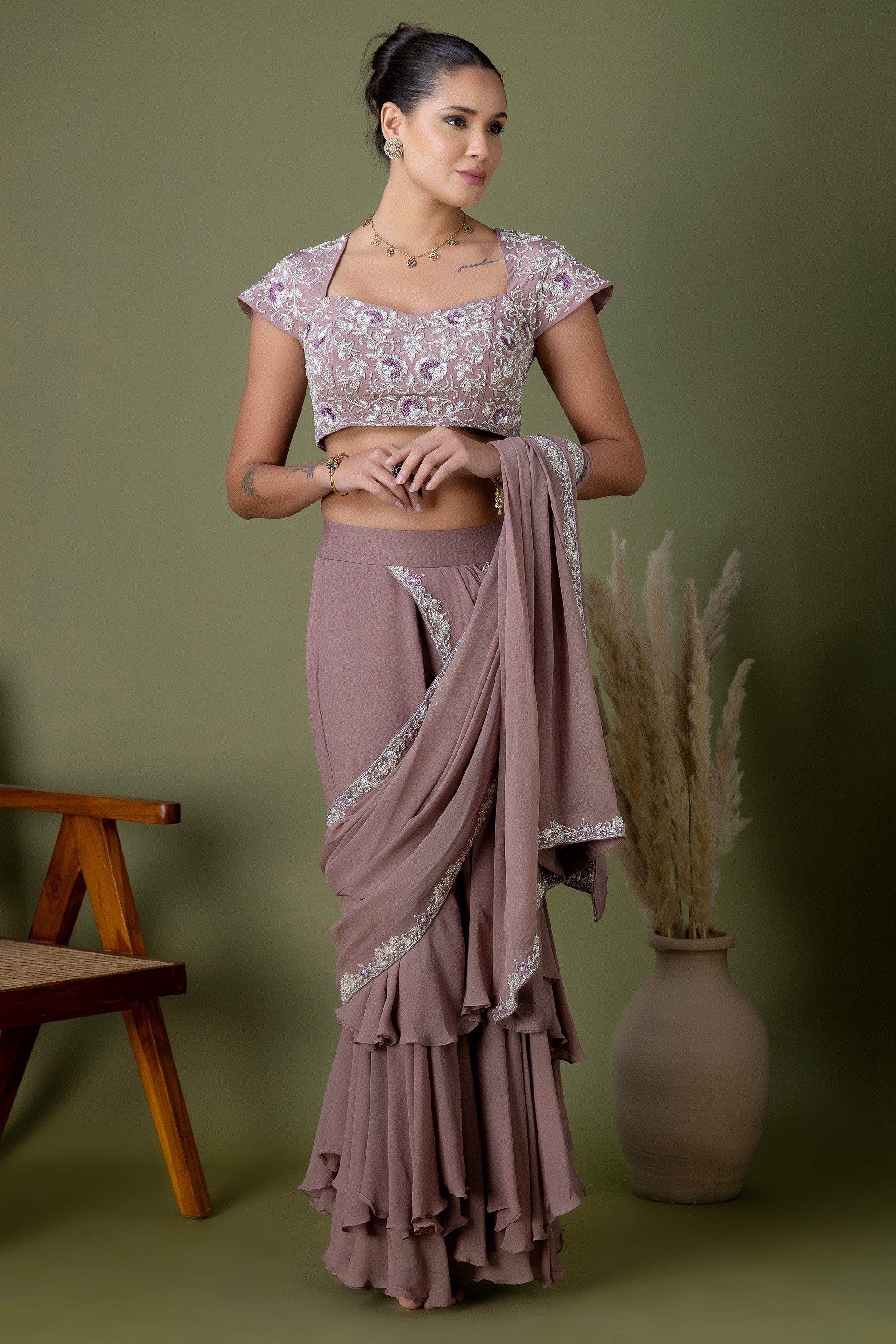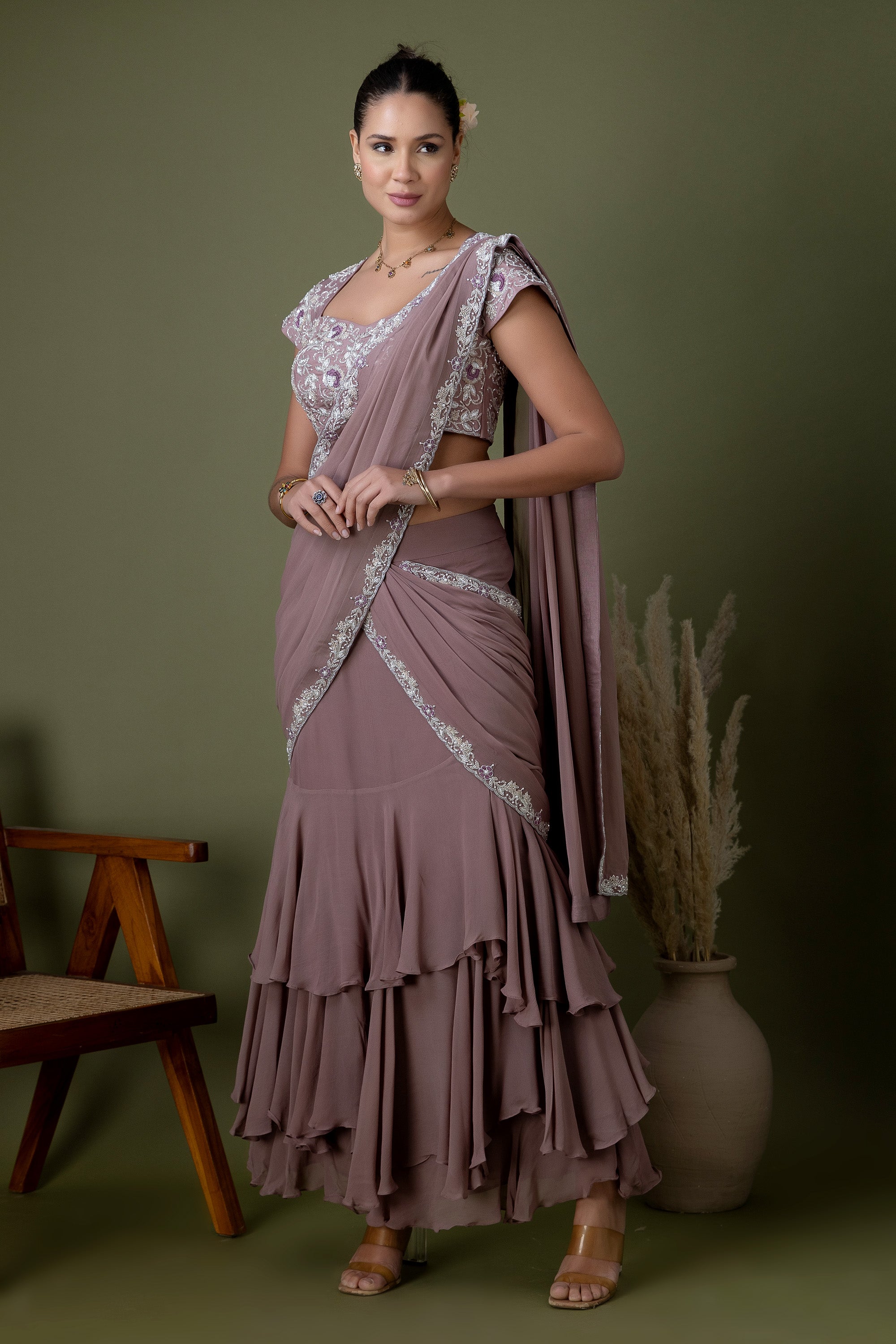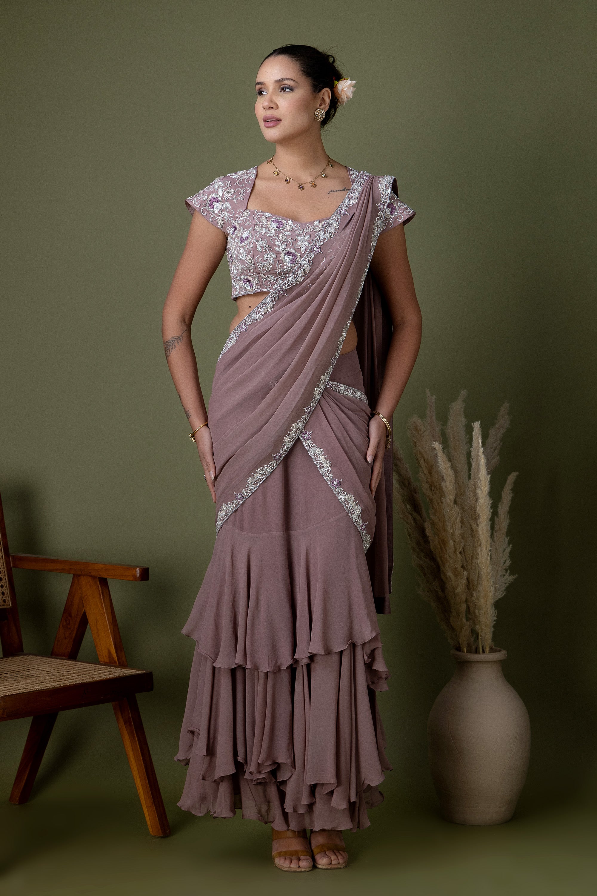 Rendered in a muted dusty rose tone, this pre-draped saree is elevated with delicate silver accents and cascading ruffles. A modern festive look that feels light, feminine, and effortlessly refined.