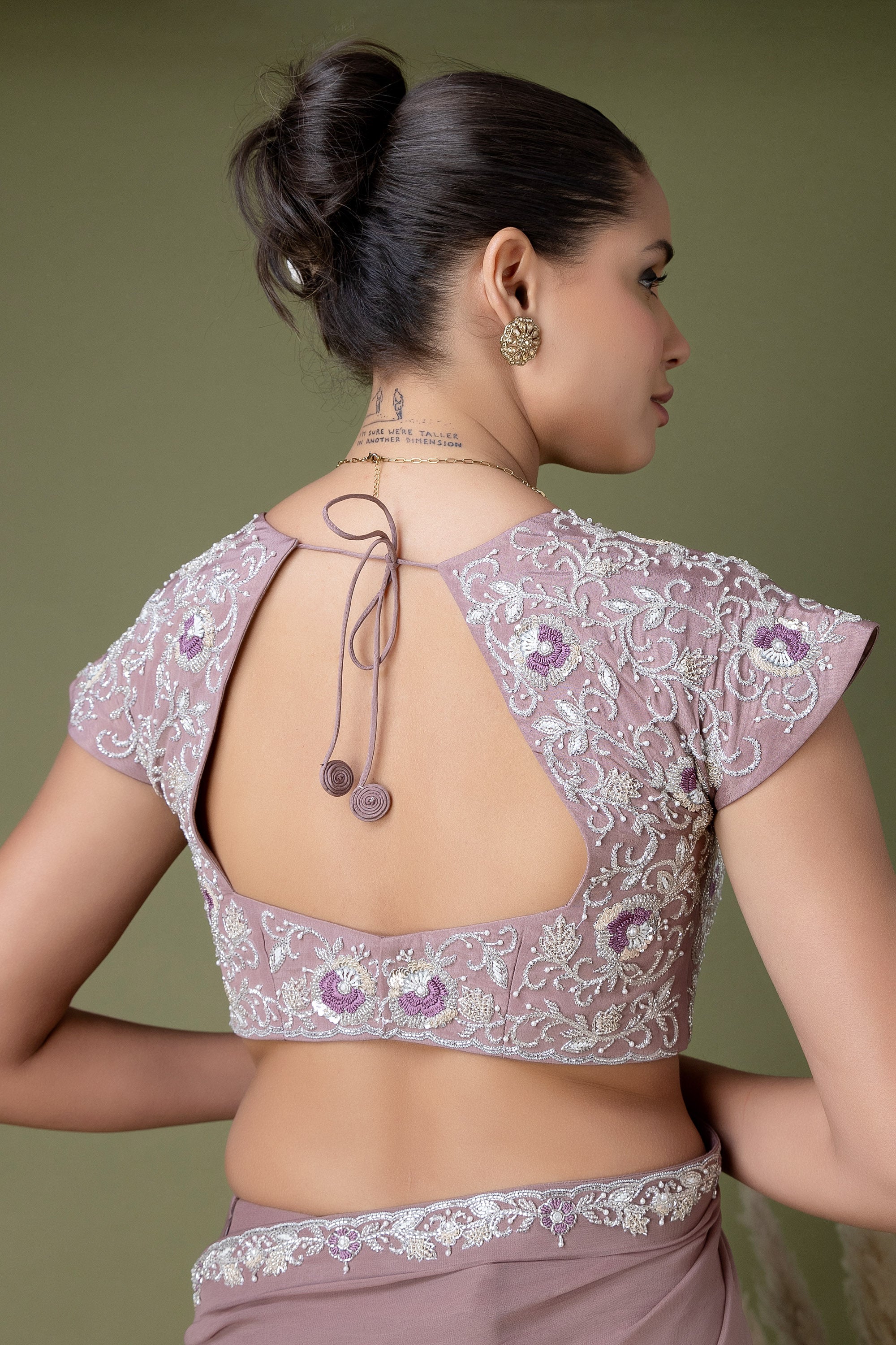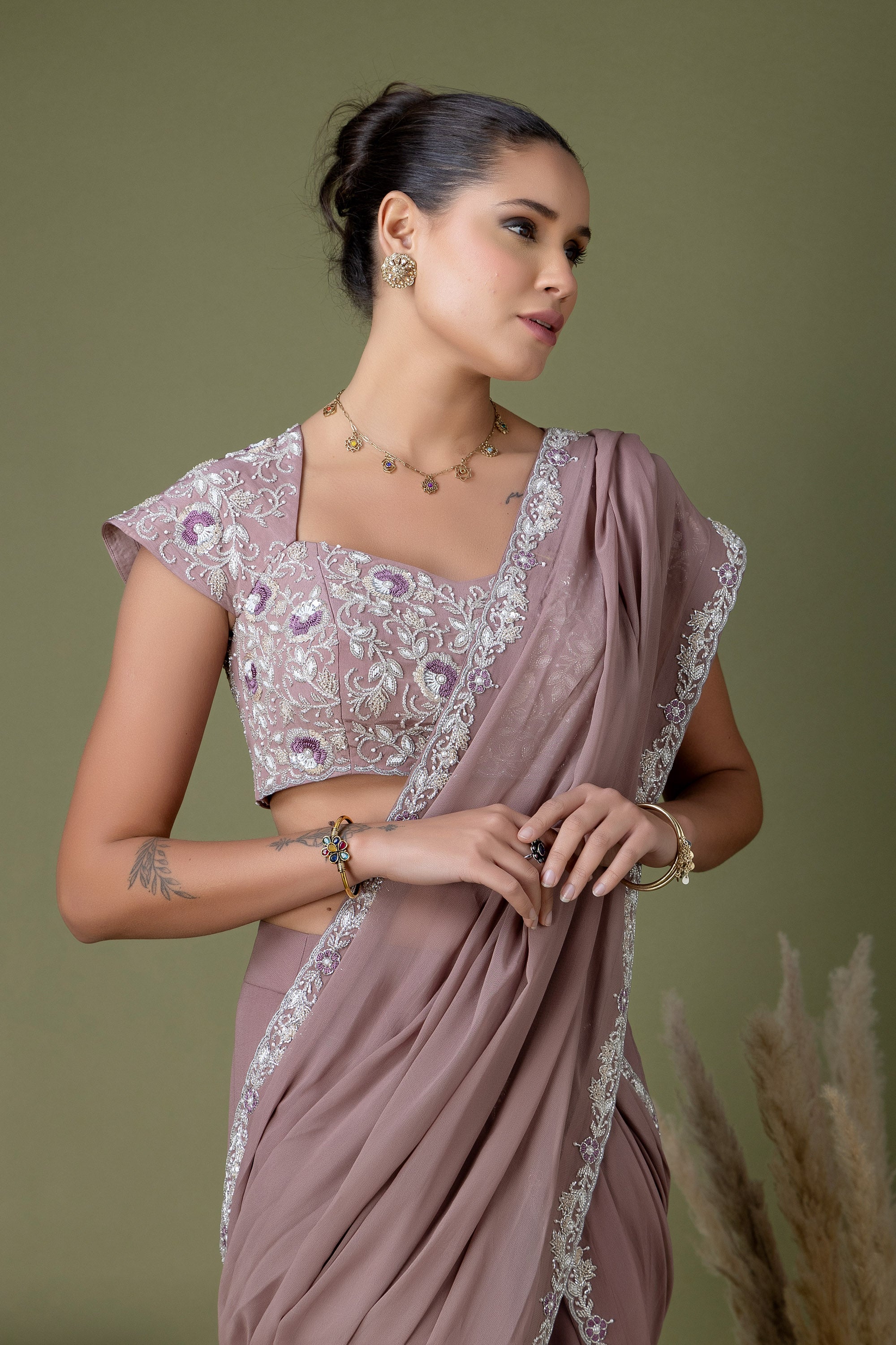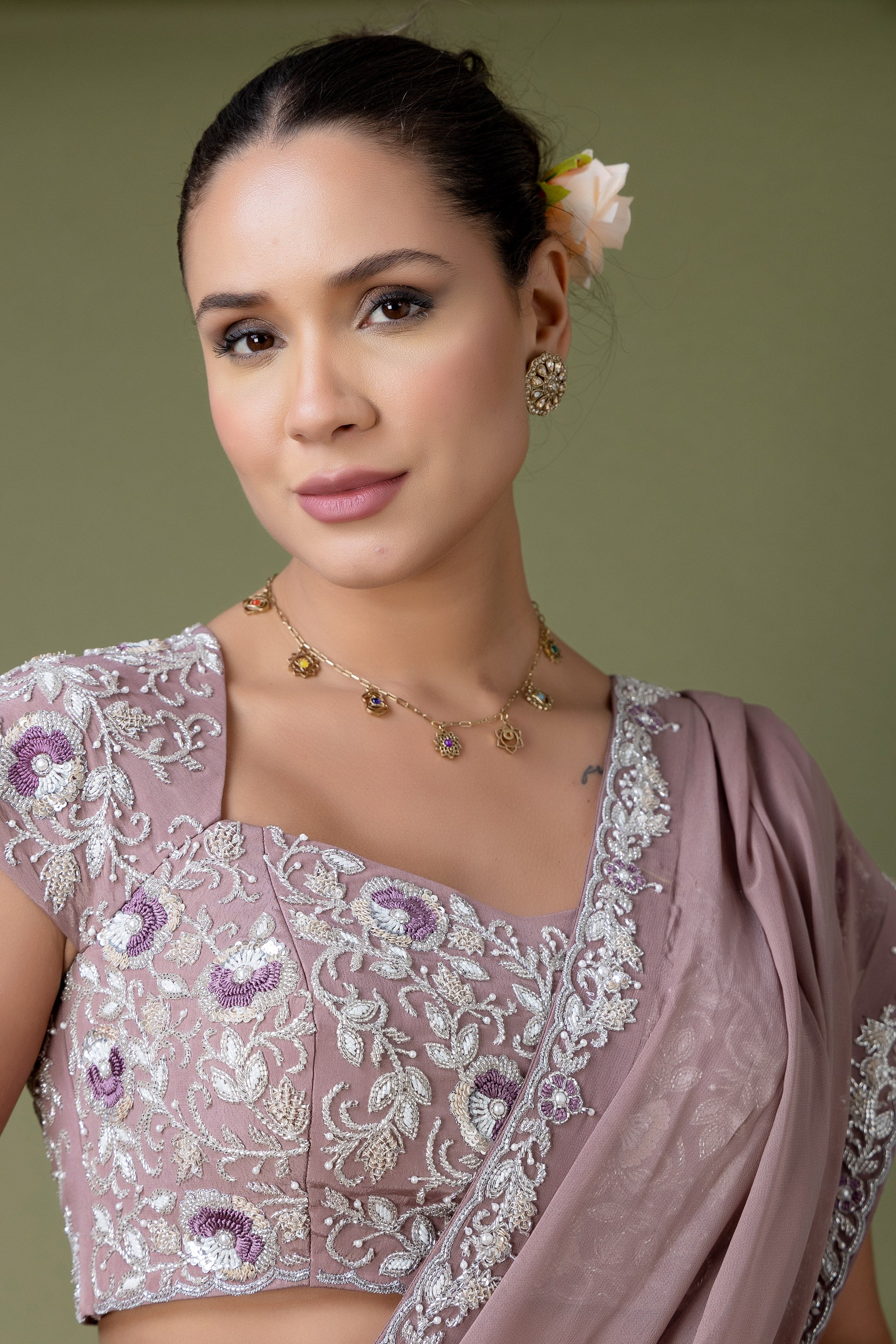 Rendered in a muted dusty rose tone, this pre-draped saree is elevated with delicate silver accents and cascading ruffles. A modern festive look that feels light, feminine, and effortlessly refined.