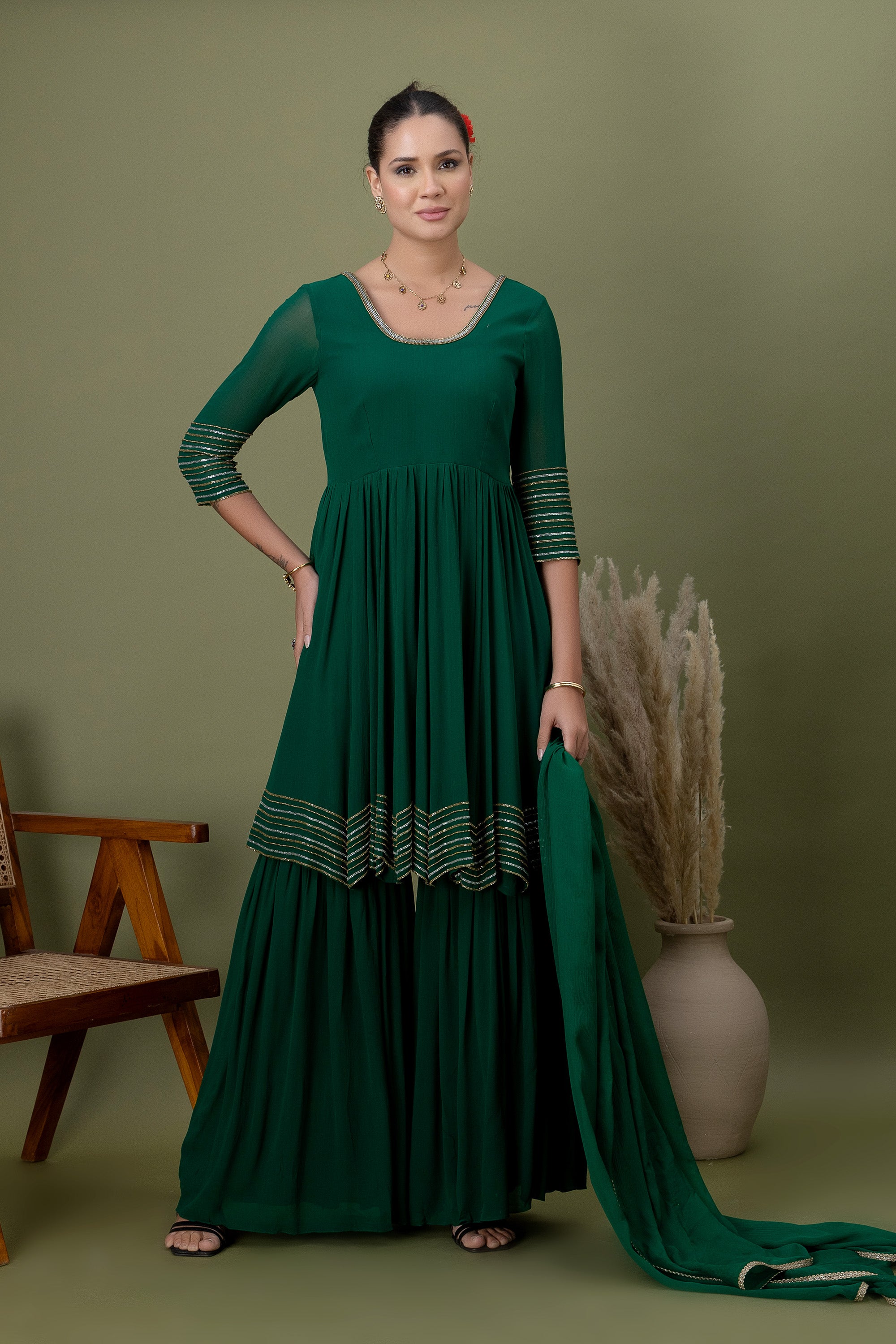 A celebration of simplicity and flow, this emerald flared anarkali is accented with minimal metallic trims and soft gathers. The layered silhouette adds drama while keeping the look understated and elegant.