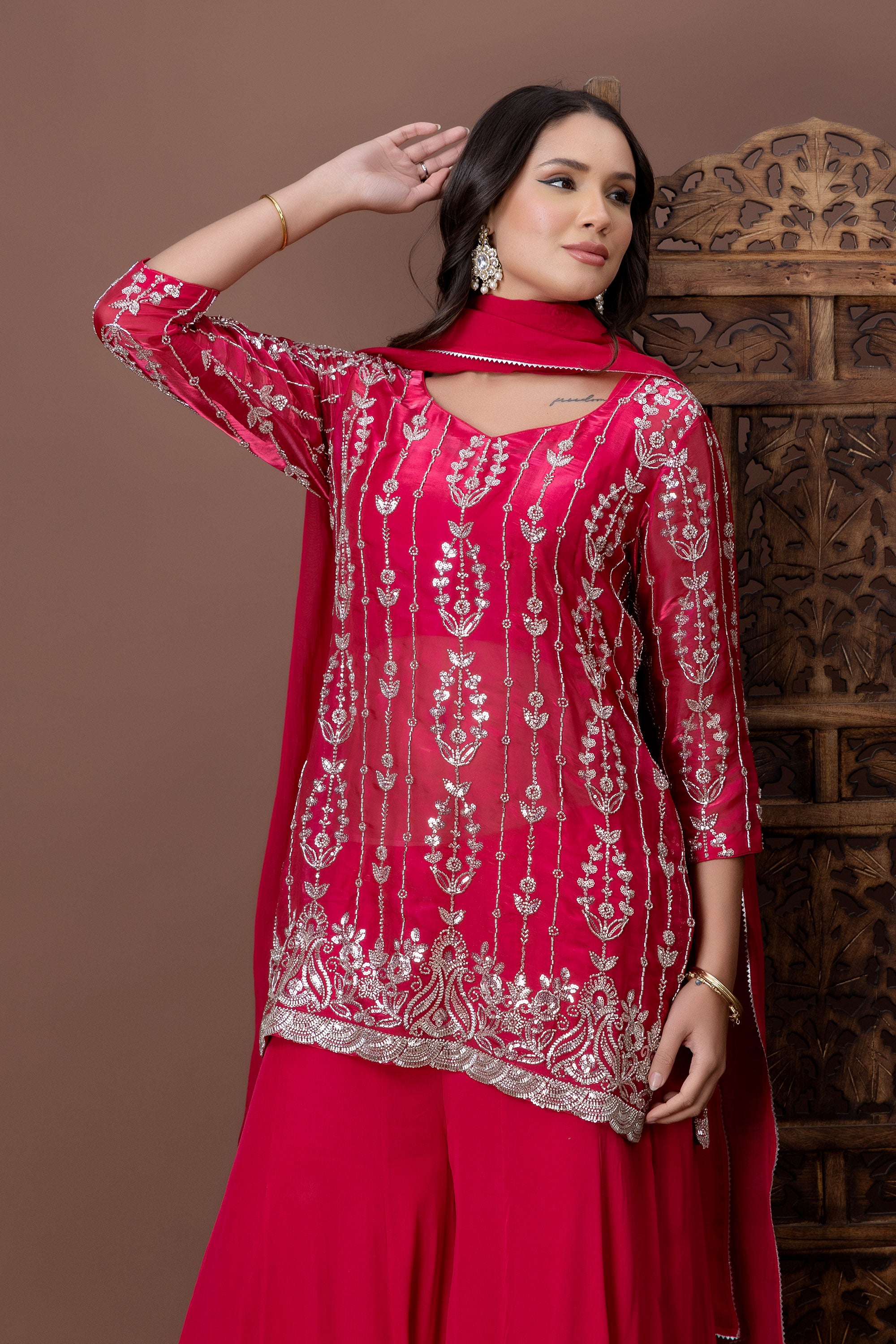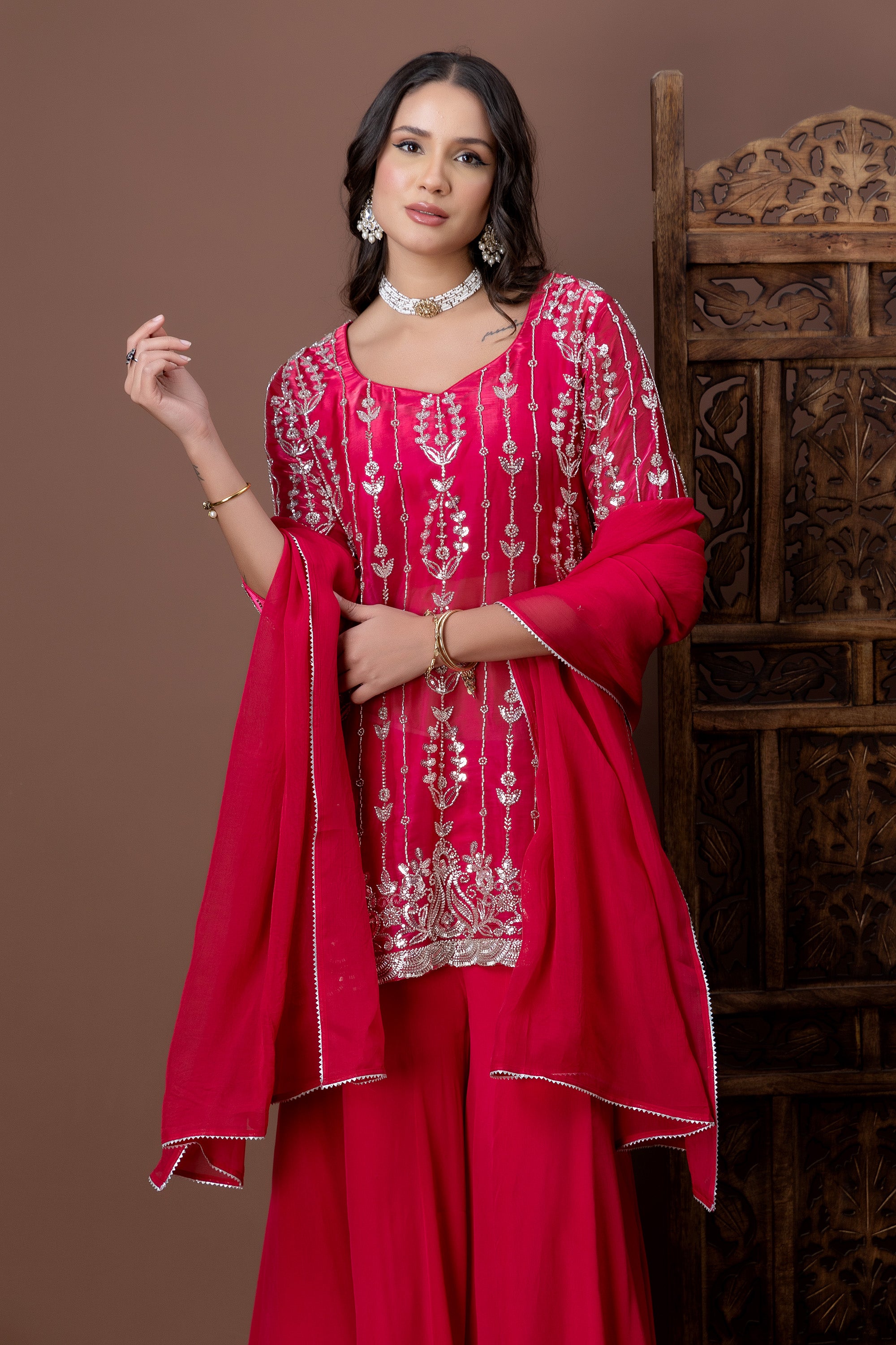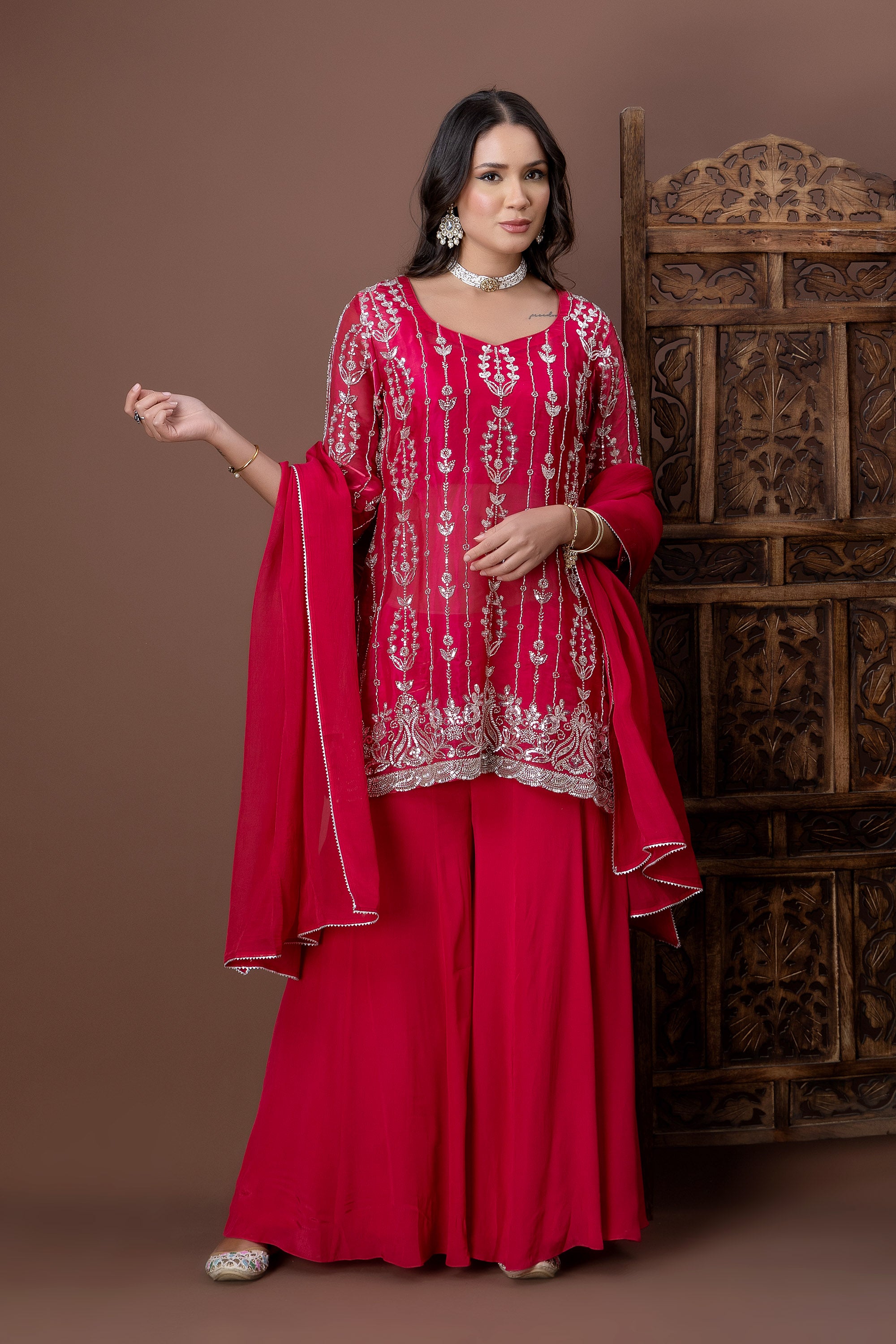 Crafted in a rich red hue, the Laal Noor Kurta Set features intricate silver embroidery running across the bodice and hemline. Paired with fluid palazzo pants and a matching dupatta, this ensemble is perfect for festive celebrations, weddings, and evening gatherings.
