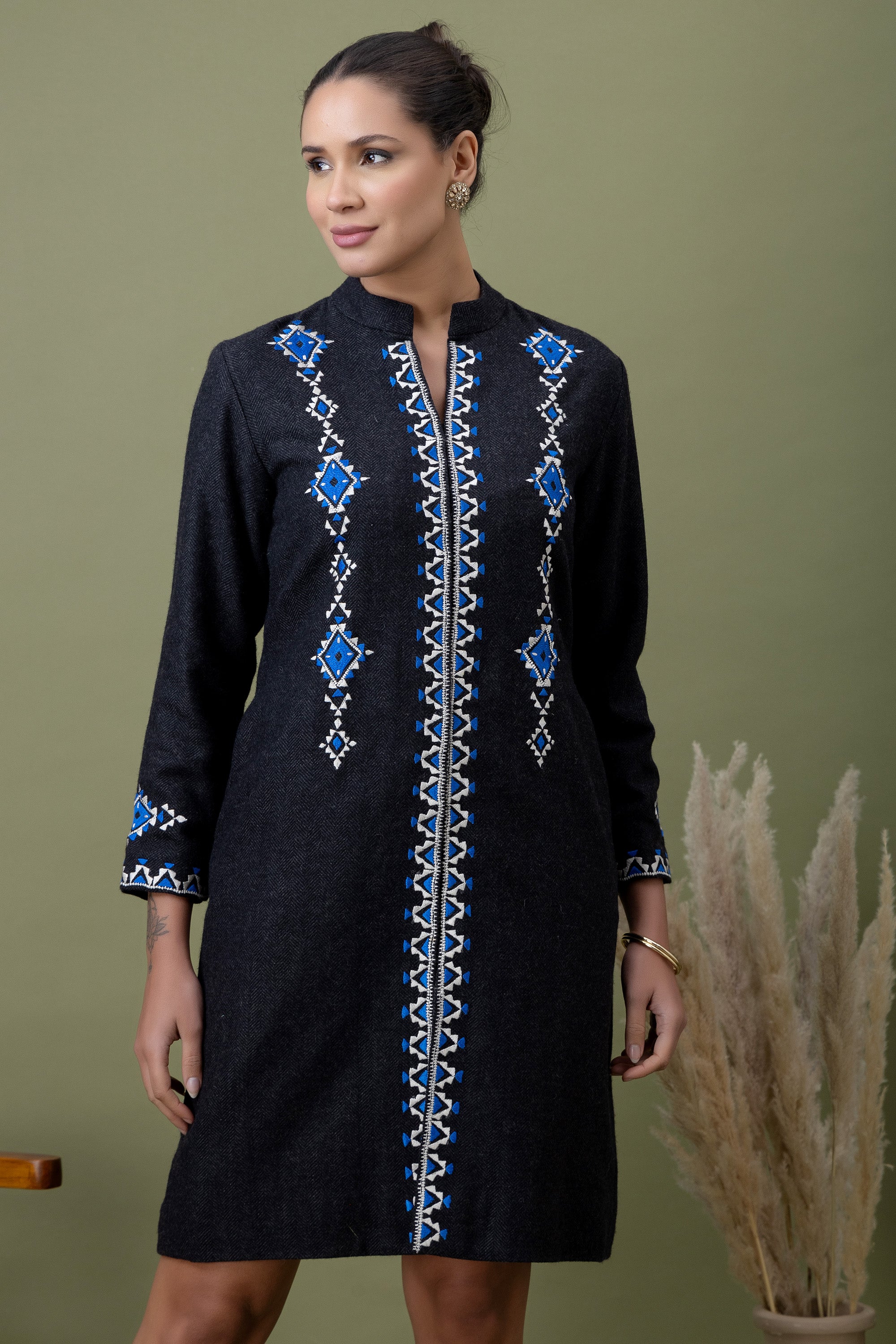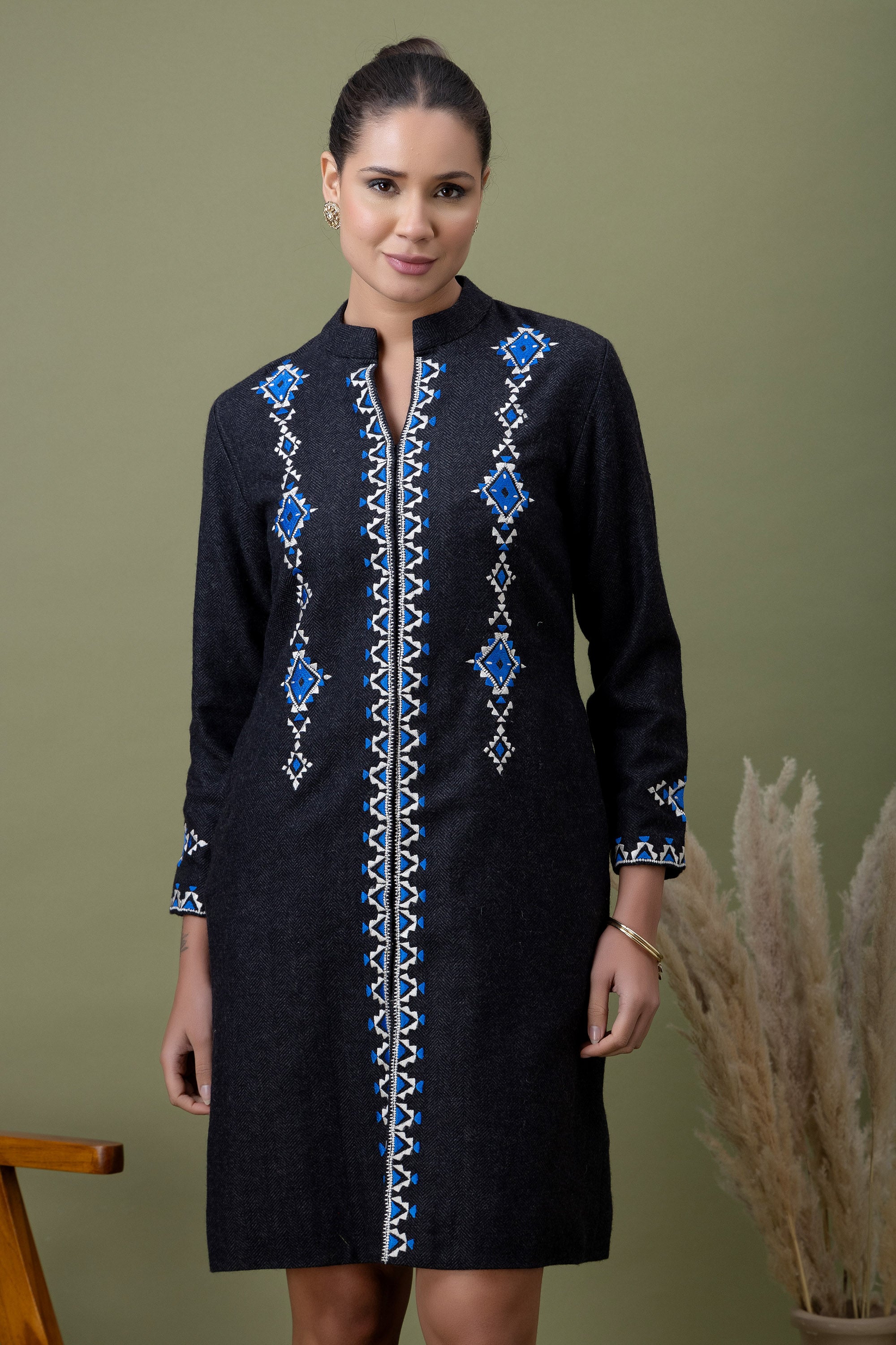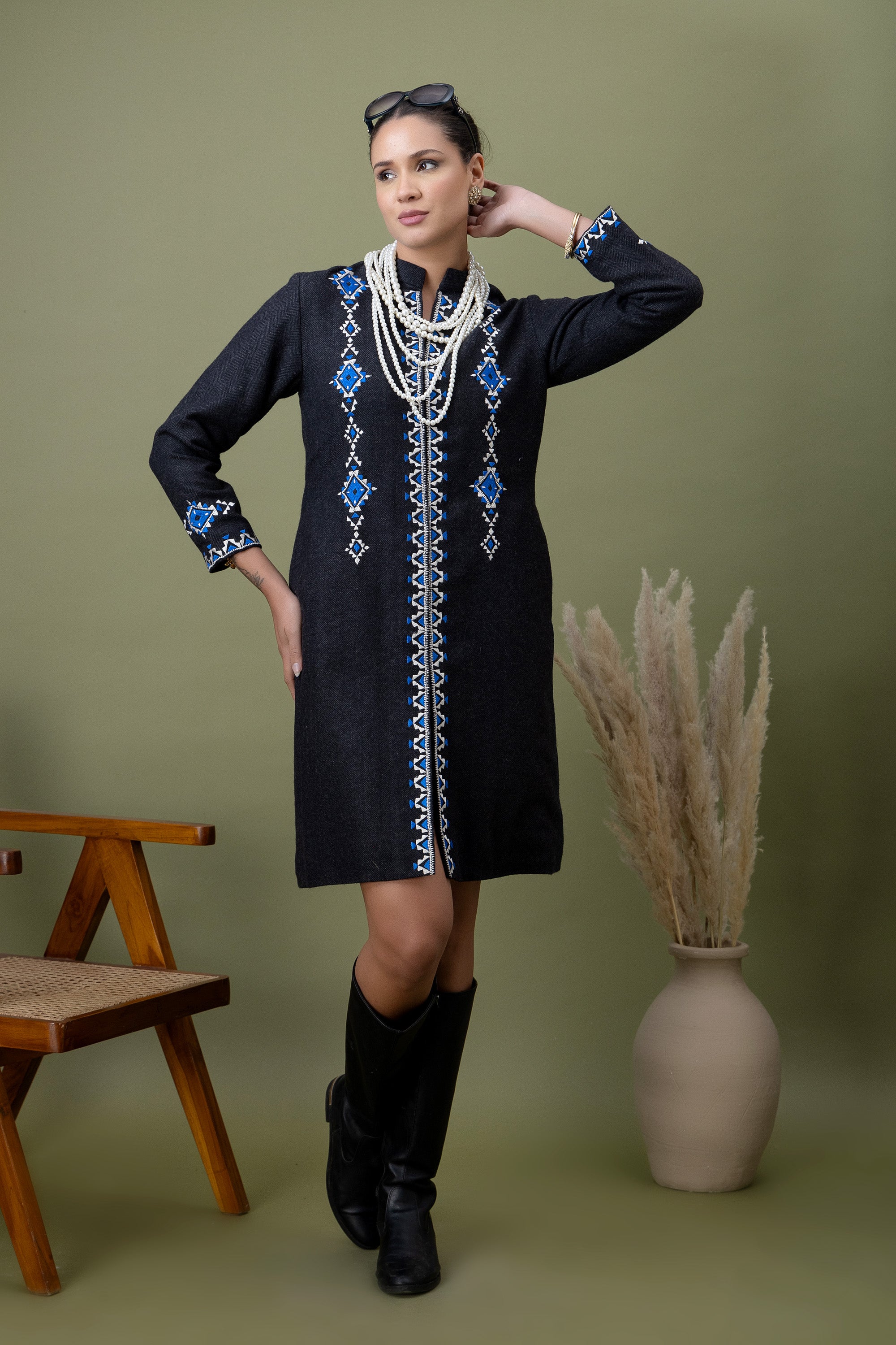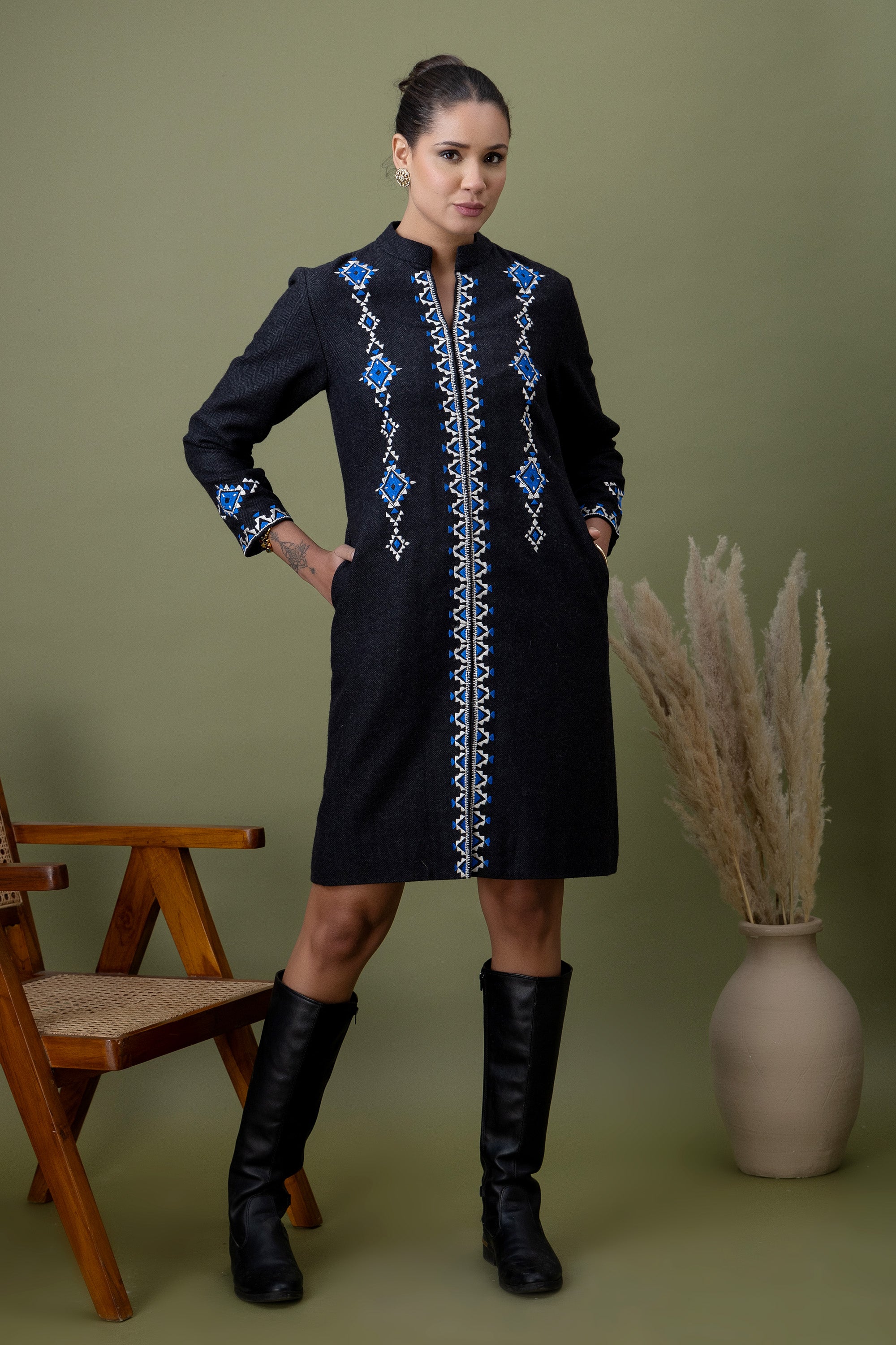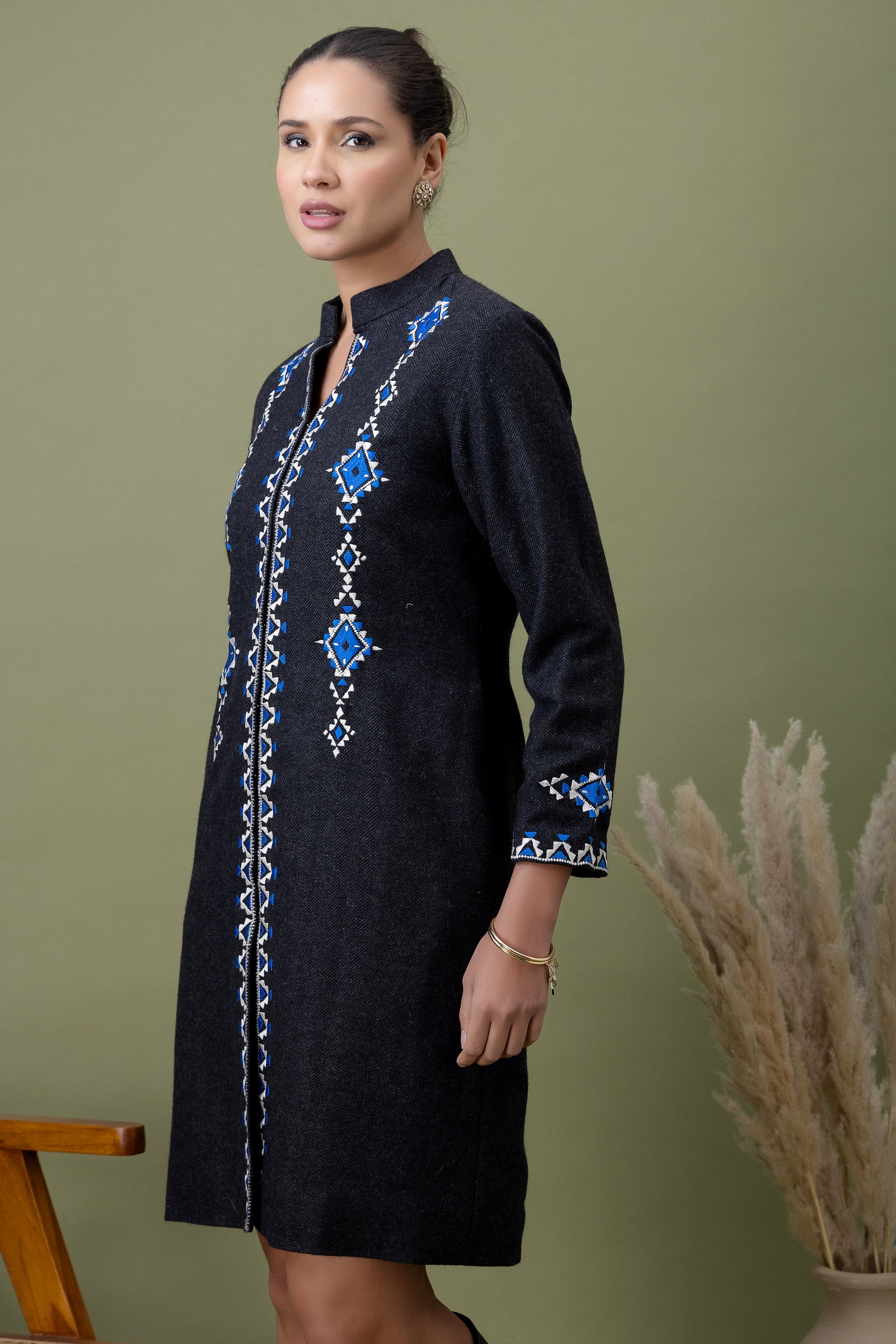 Minimal yet commanding, this black jacket is detailed with graphic blue embroidery for a refined statement. Designed for women who prefer strong silhouettes with subtle cultural cues.