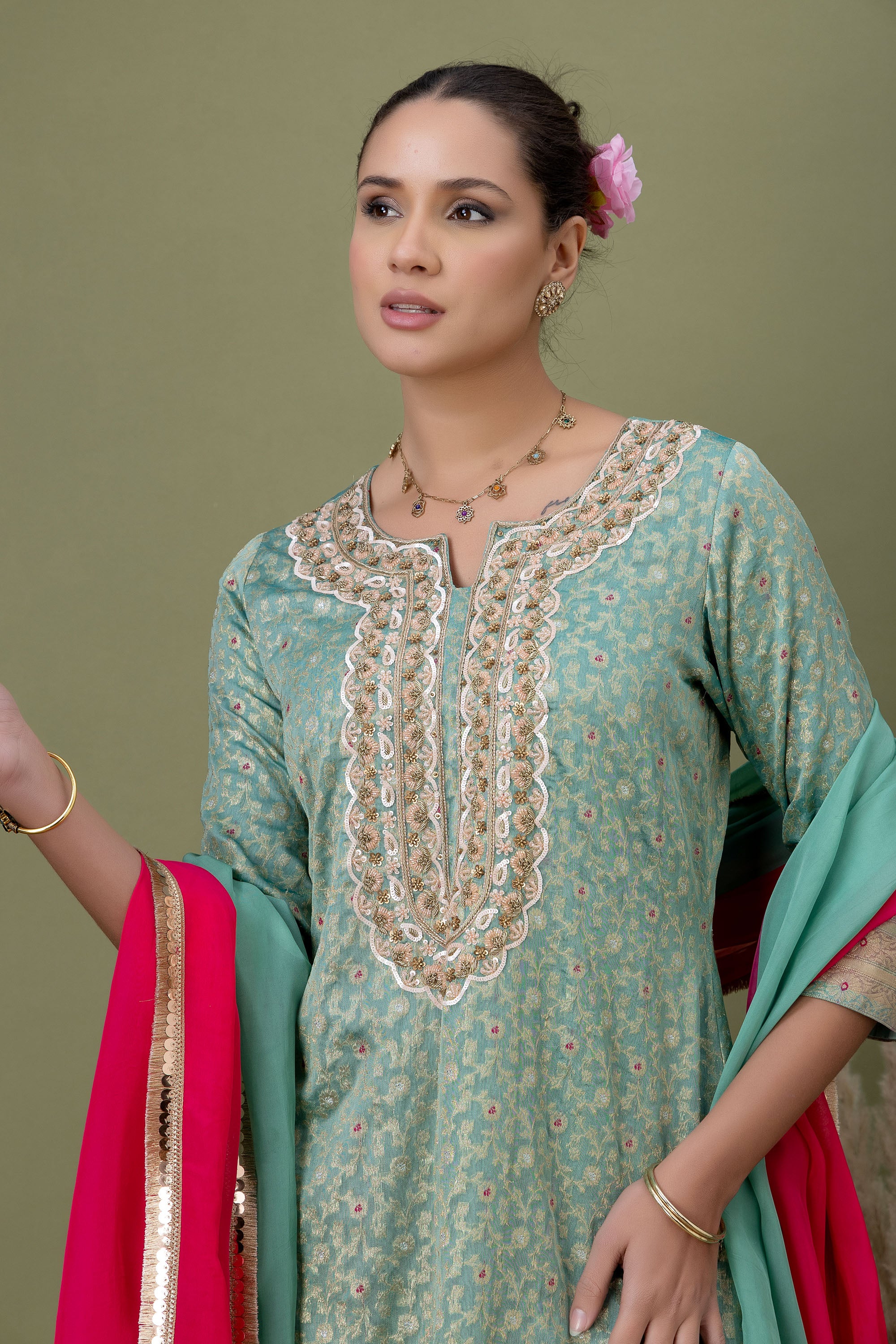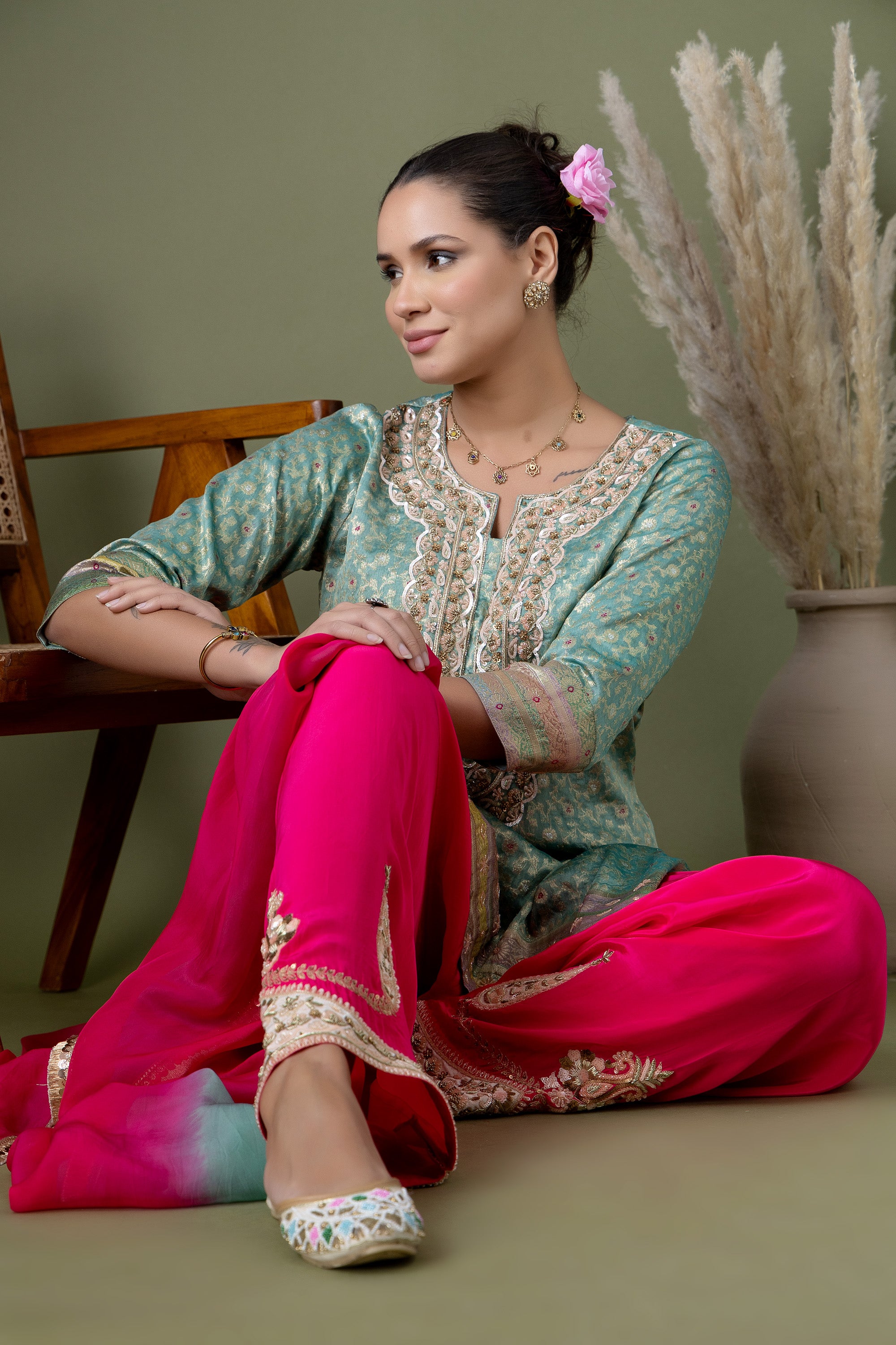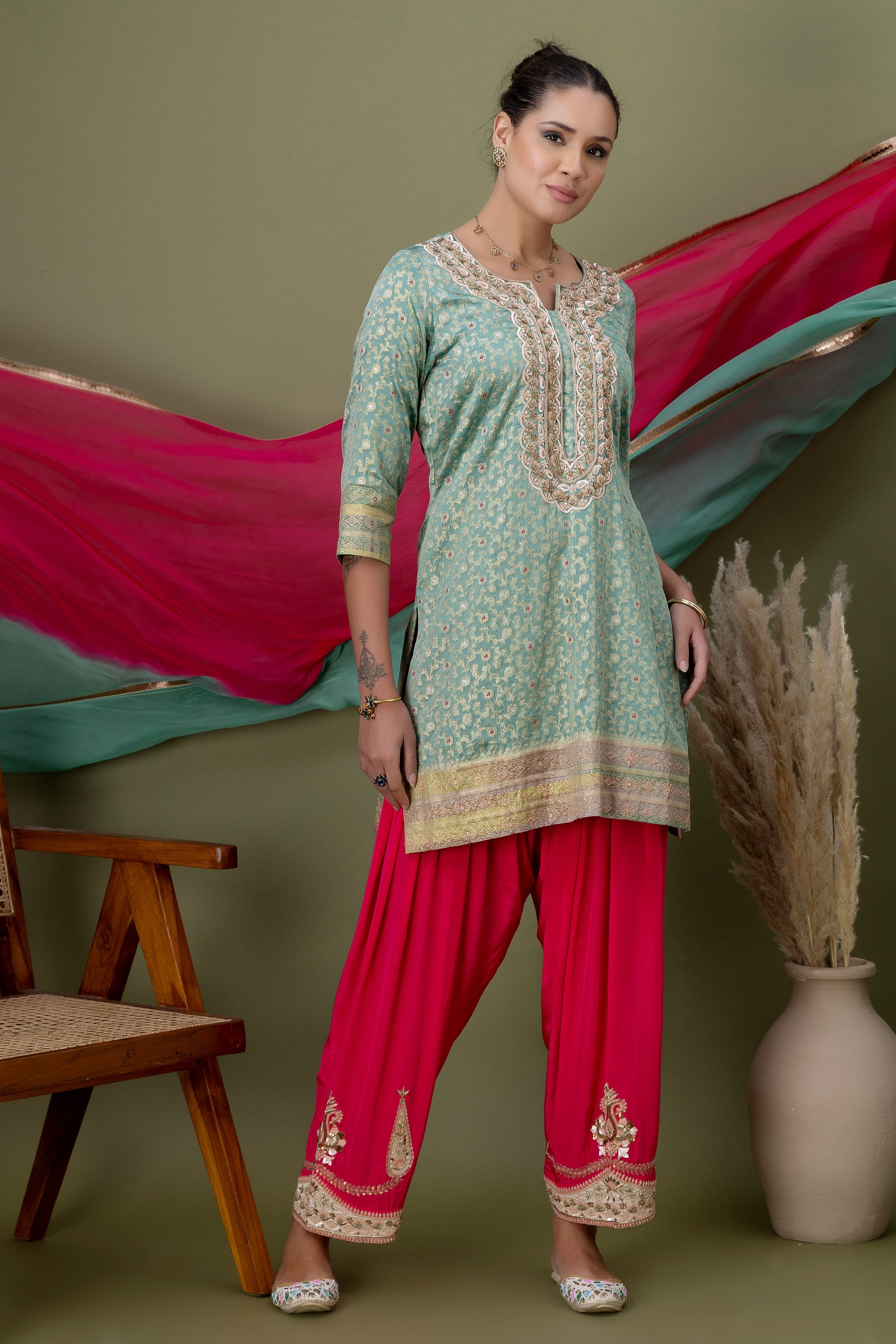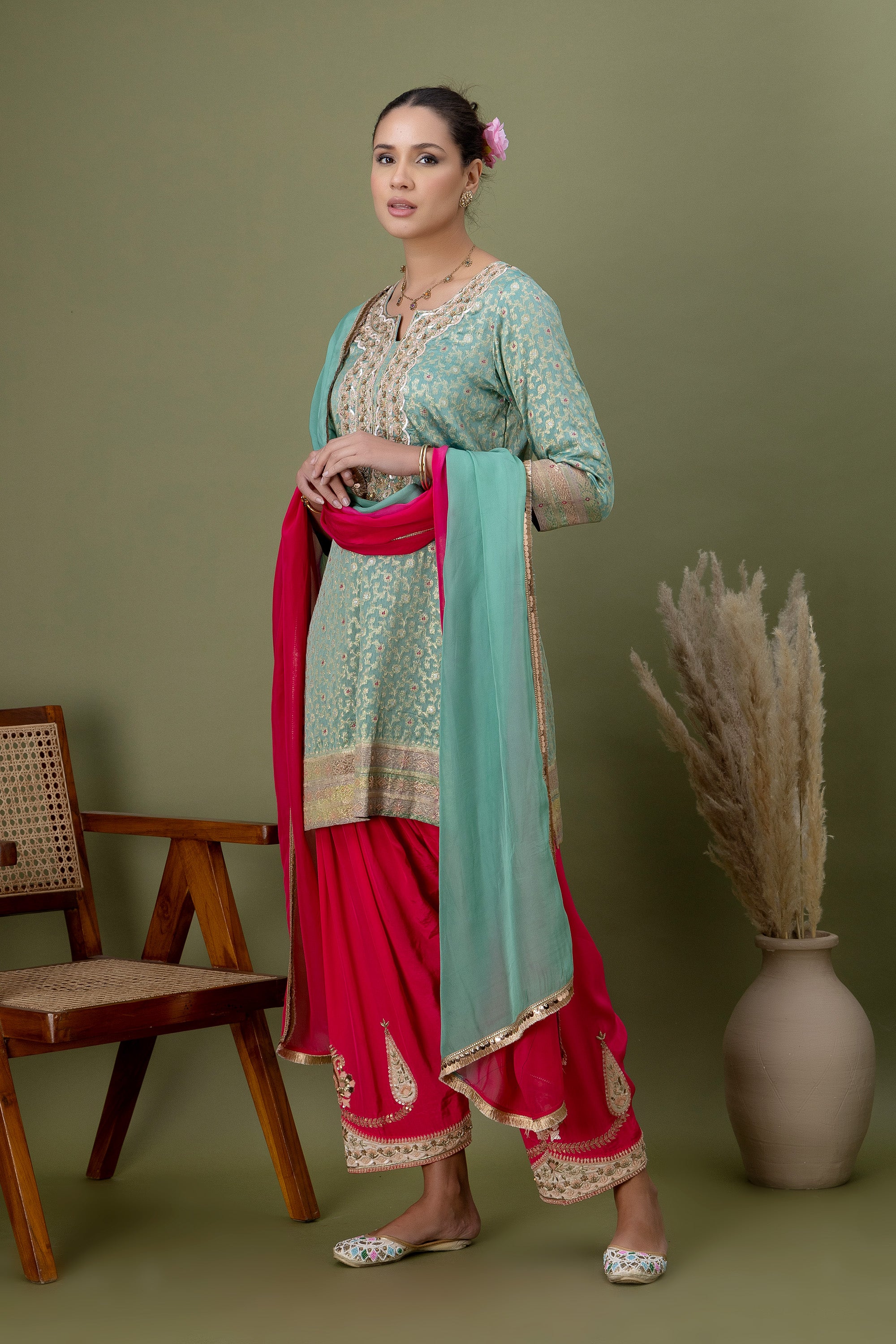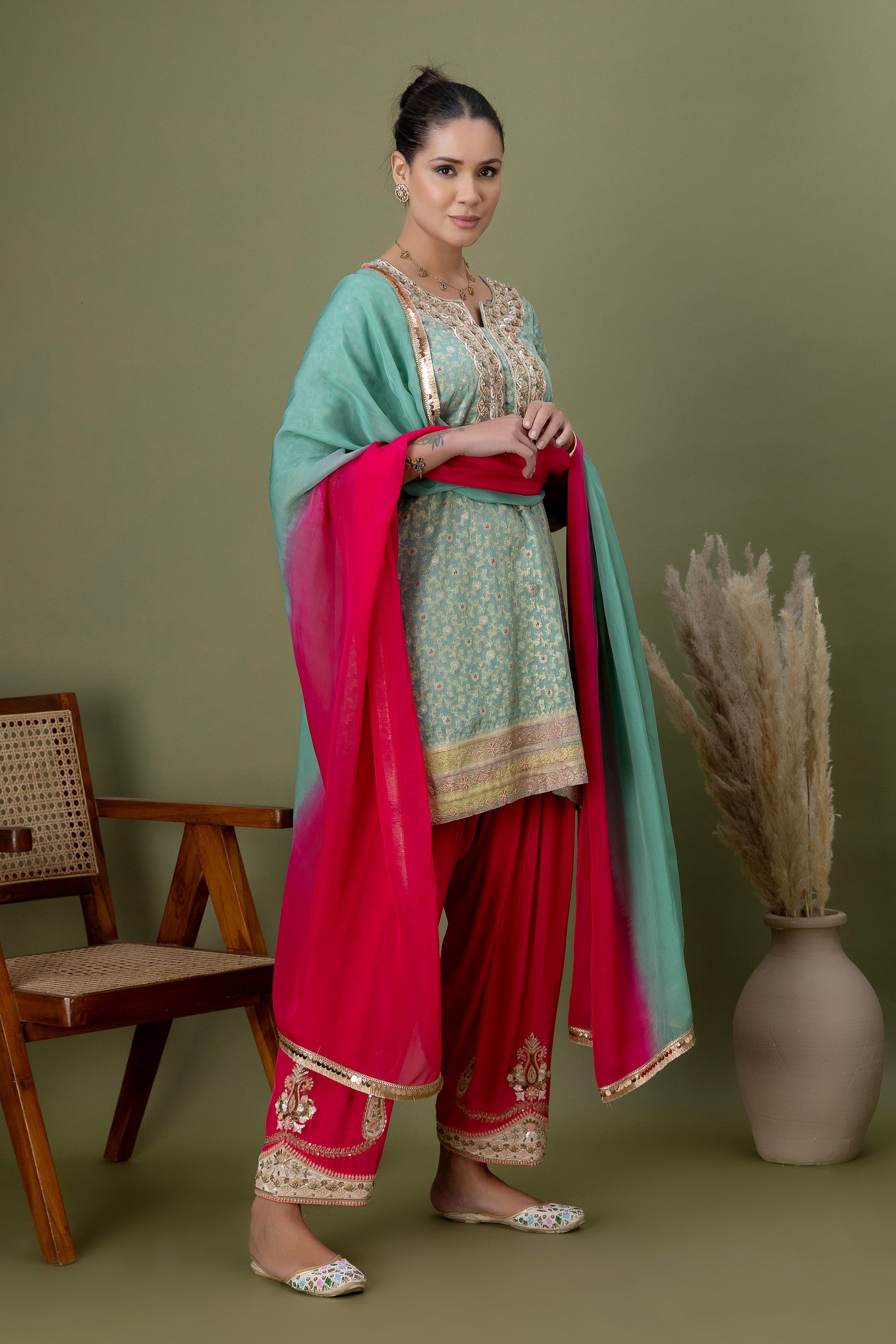 Inspired by festive florals, this mint kurta features fine gold accents and a traditional silhouette. Paired with playful pink patiala pants and a flowing dupatta, it’s a celebration-ready look full of colour and movement.