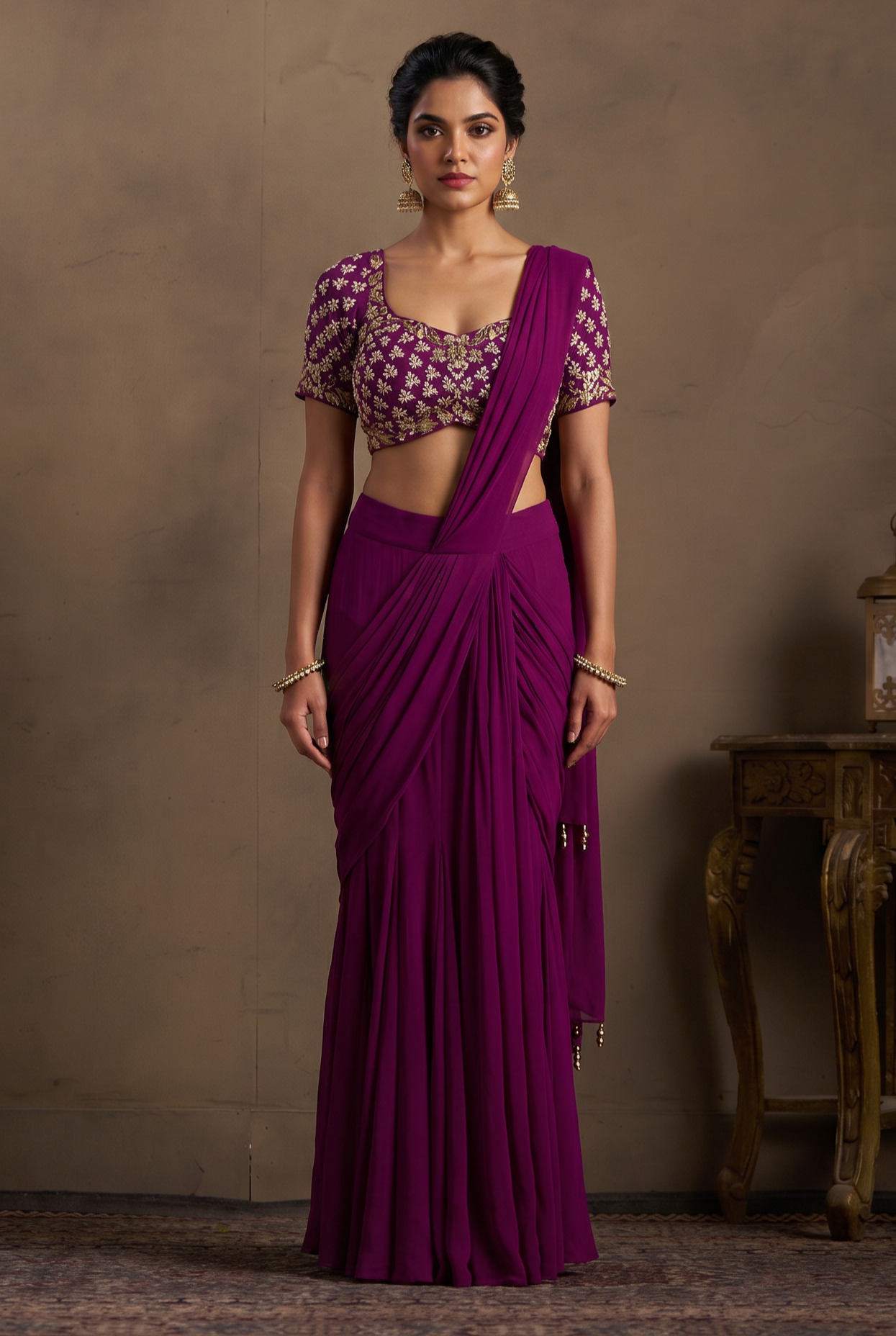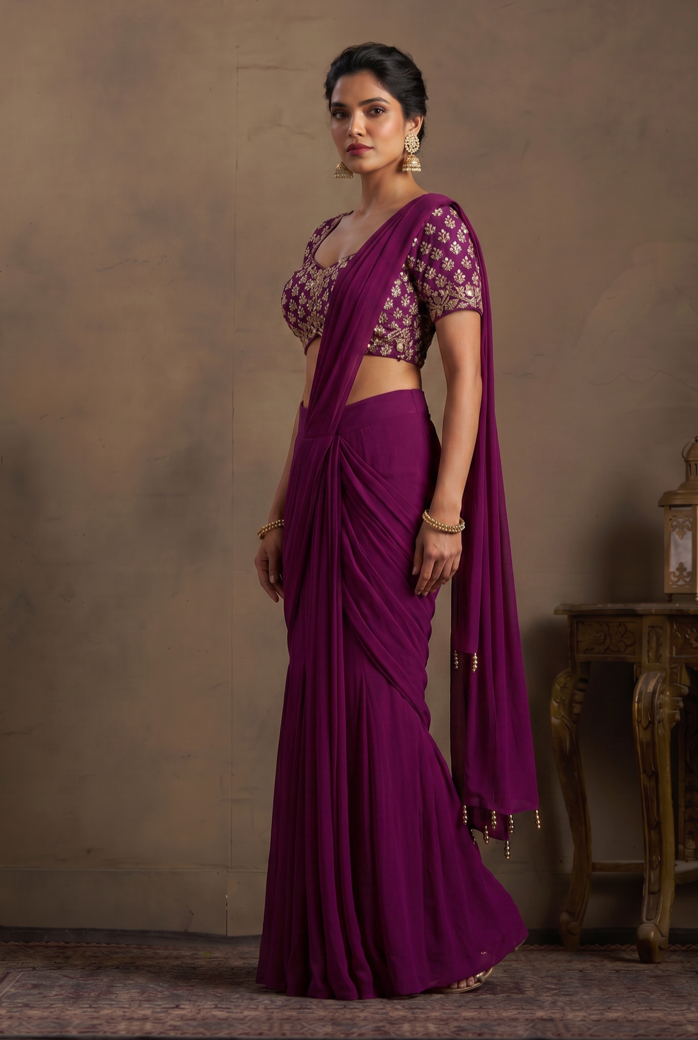• Deep wine georgette drape with fluid, graceful fall