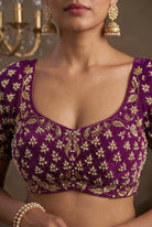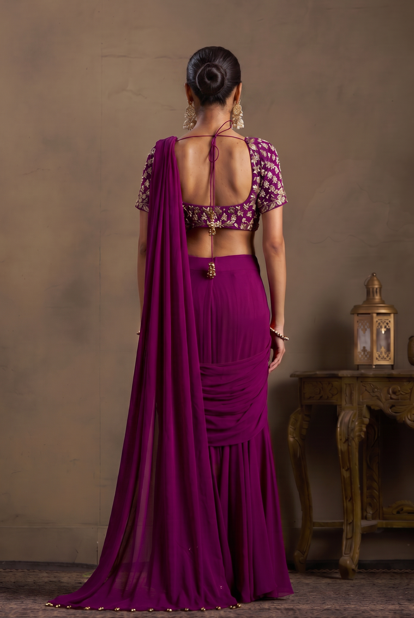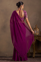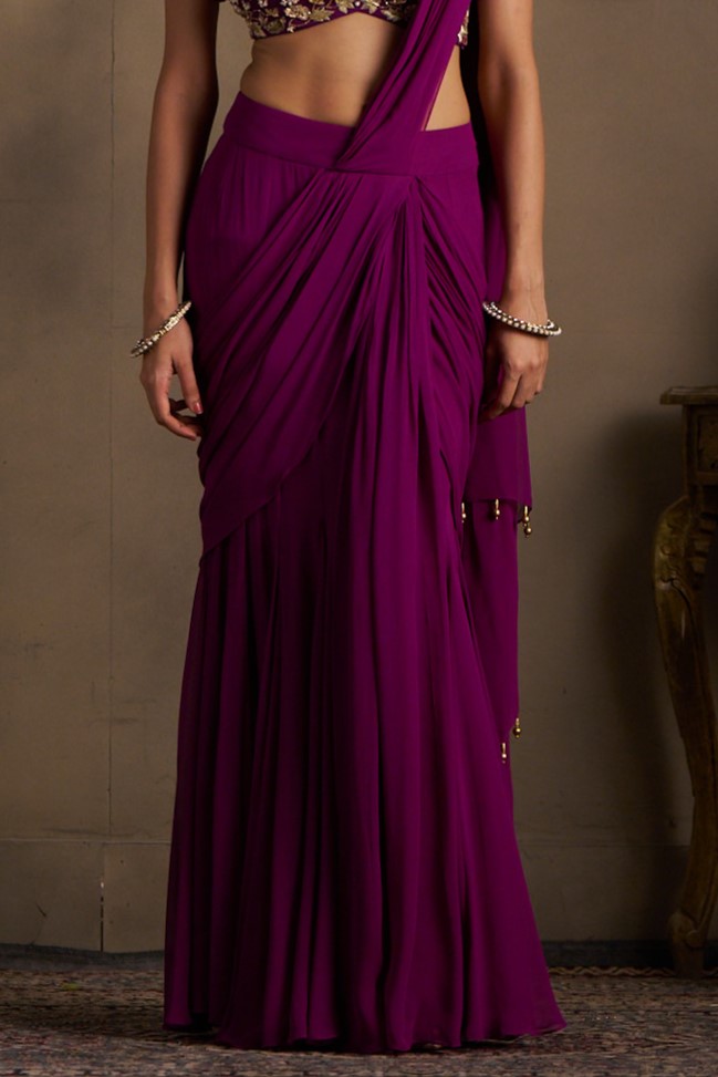 An elegant pre-drape saree in deep wine georgette, paired with a richly embellished blouse featuring all-over band embroidery with pearl and dabka handwork — front and back. A complete, statement look for weddings, receptions, and festive celebrations.