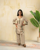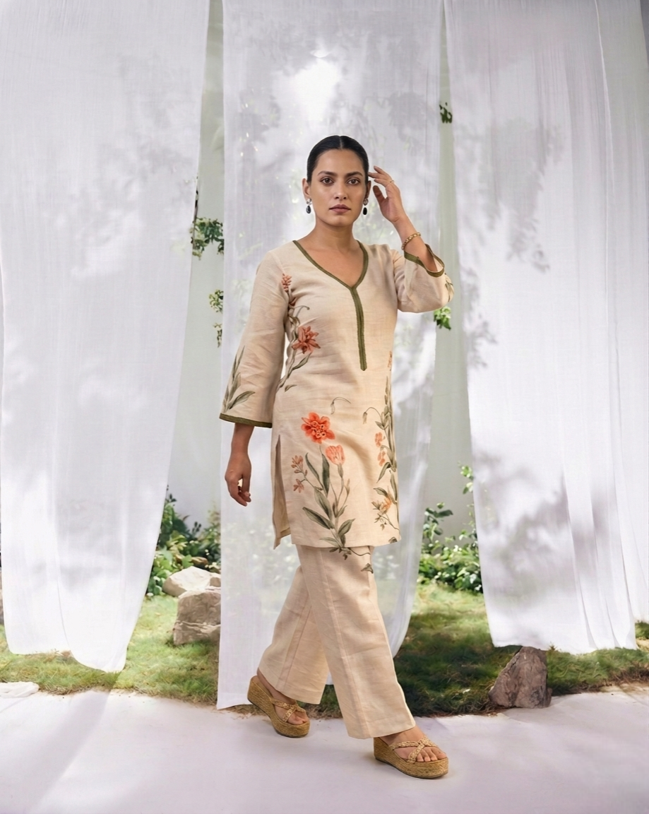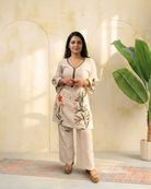 Embrace understated elegance with this beautifully crafted kurta set, designed to bring comfort and charm to your everyday wardrobe. Featuring delicate floral prints on a soothing neutral base, this ensemble exudes a graceful and refreshing appeal.