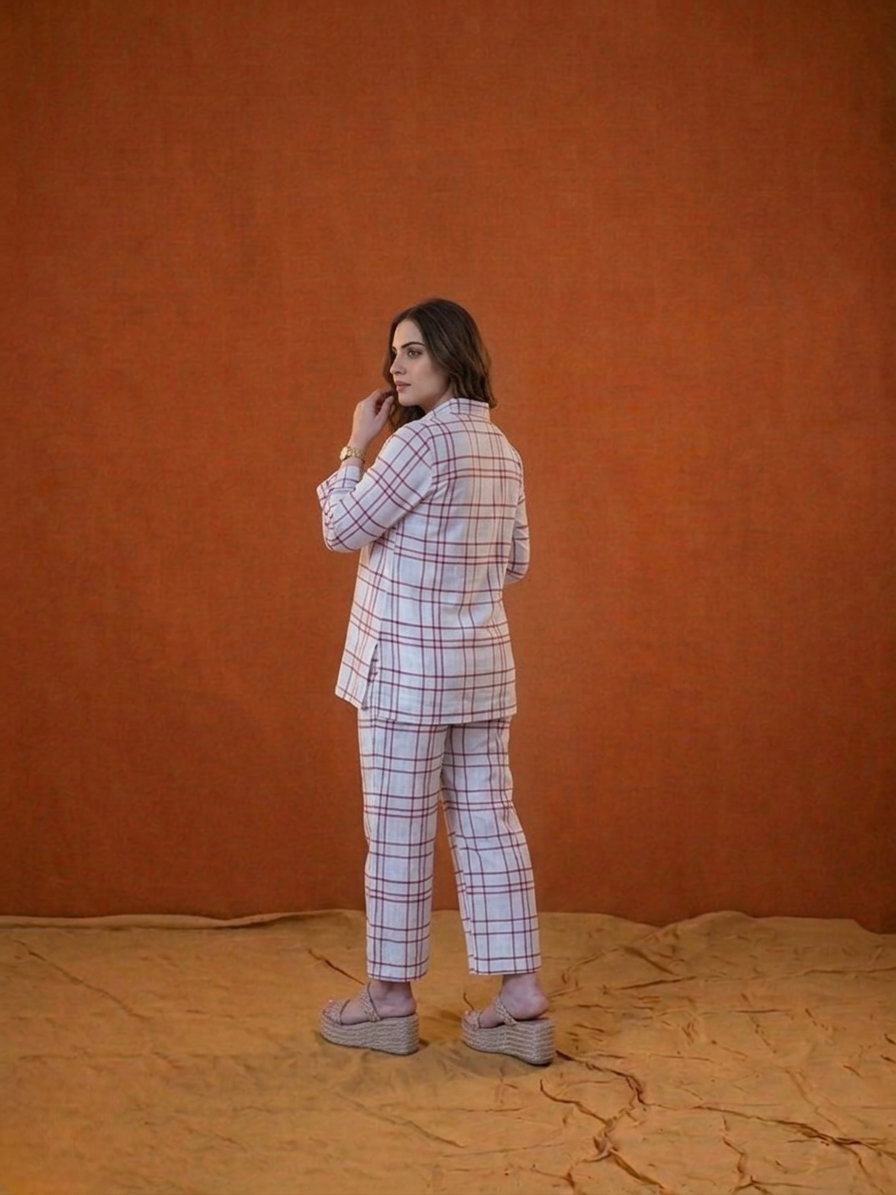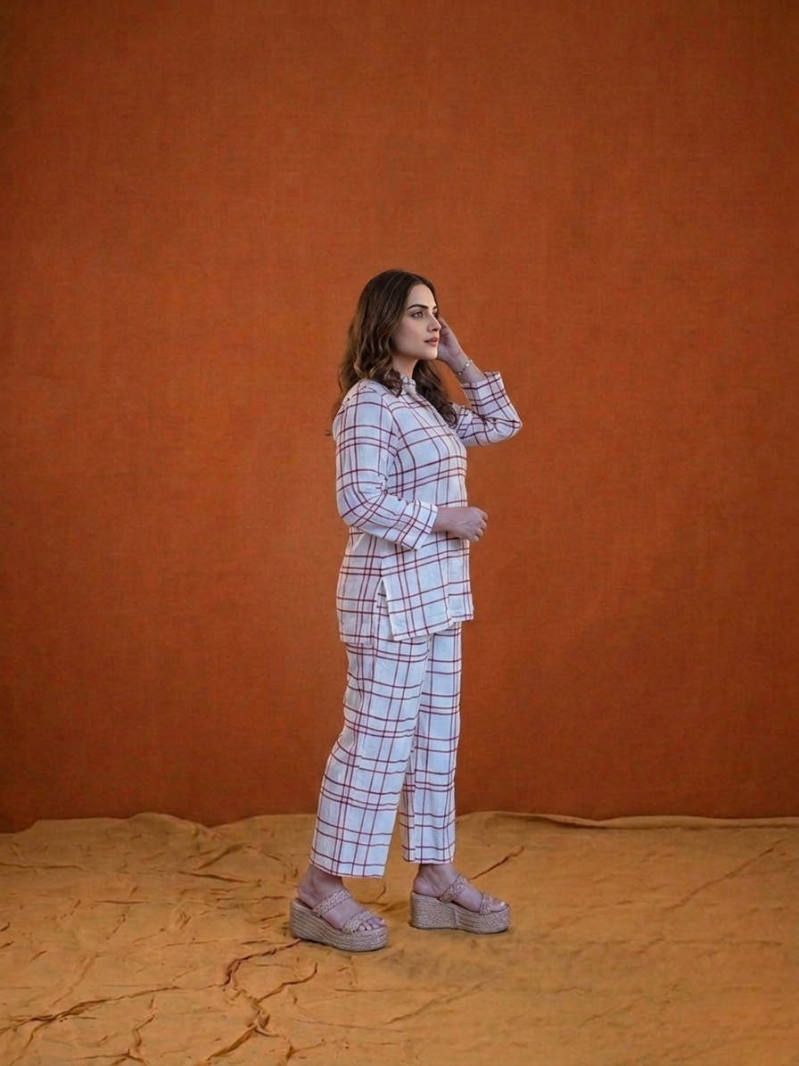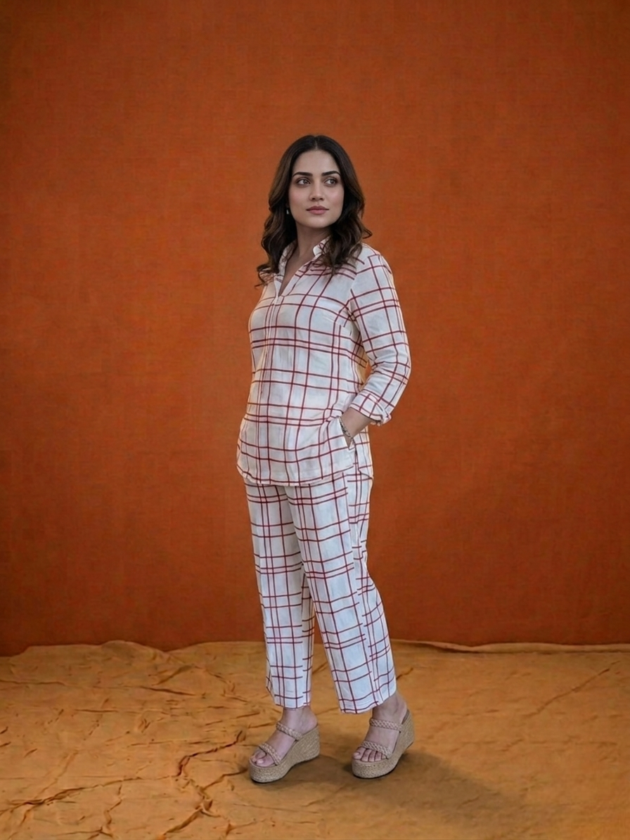 Everyday wardrobe with this effortlessly chic co-ord set, designed for both comfort and style. Featuring a modern checkered pattern, this two-piece outfit includes a relaxed-fit shirt and matching straight-leg pants, creating a polished yet laid-back look.