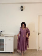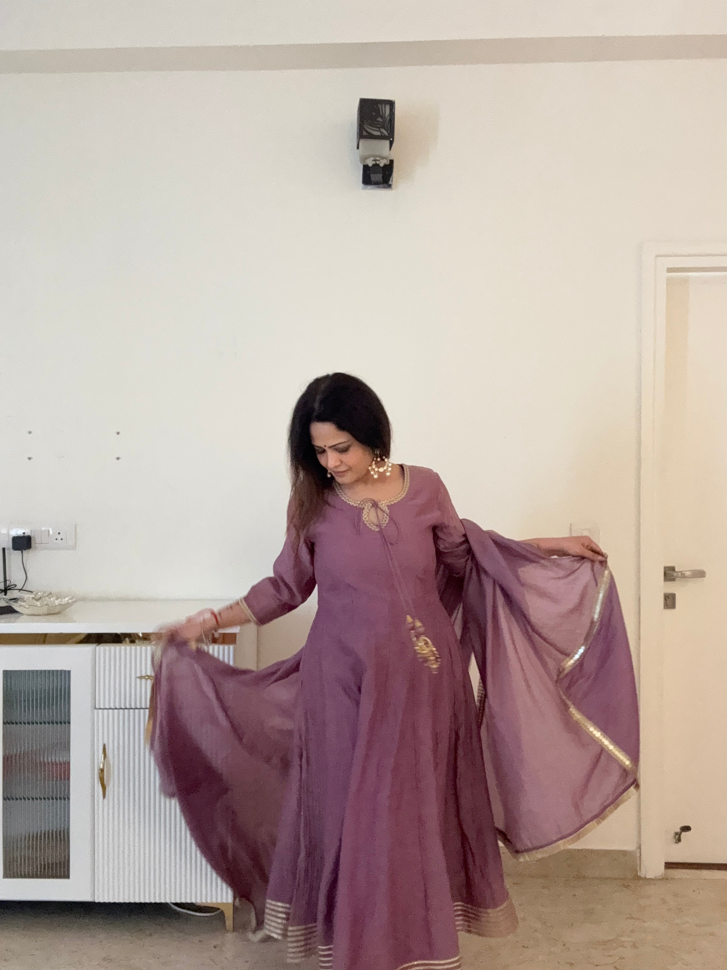 Elegant and timeless, this Anarkali set is crafted in soft Chanderi silk in a delicate onion pink hue. The silhouette features 18 kalis, creating a beautiful flare that adds movement and grace to the ensemble. The neckline is accentuated with tassel detailing, while the hemline is finished with traditional gota detailing that enhances its festive charm. Paired with a soft Chanderi dupatta, this three-piece set is perfect for intimate celebrations and elegant occasions.