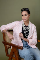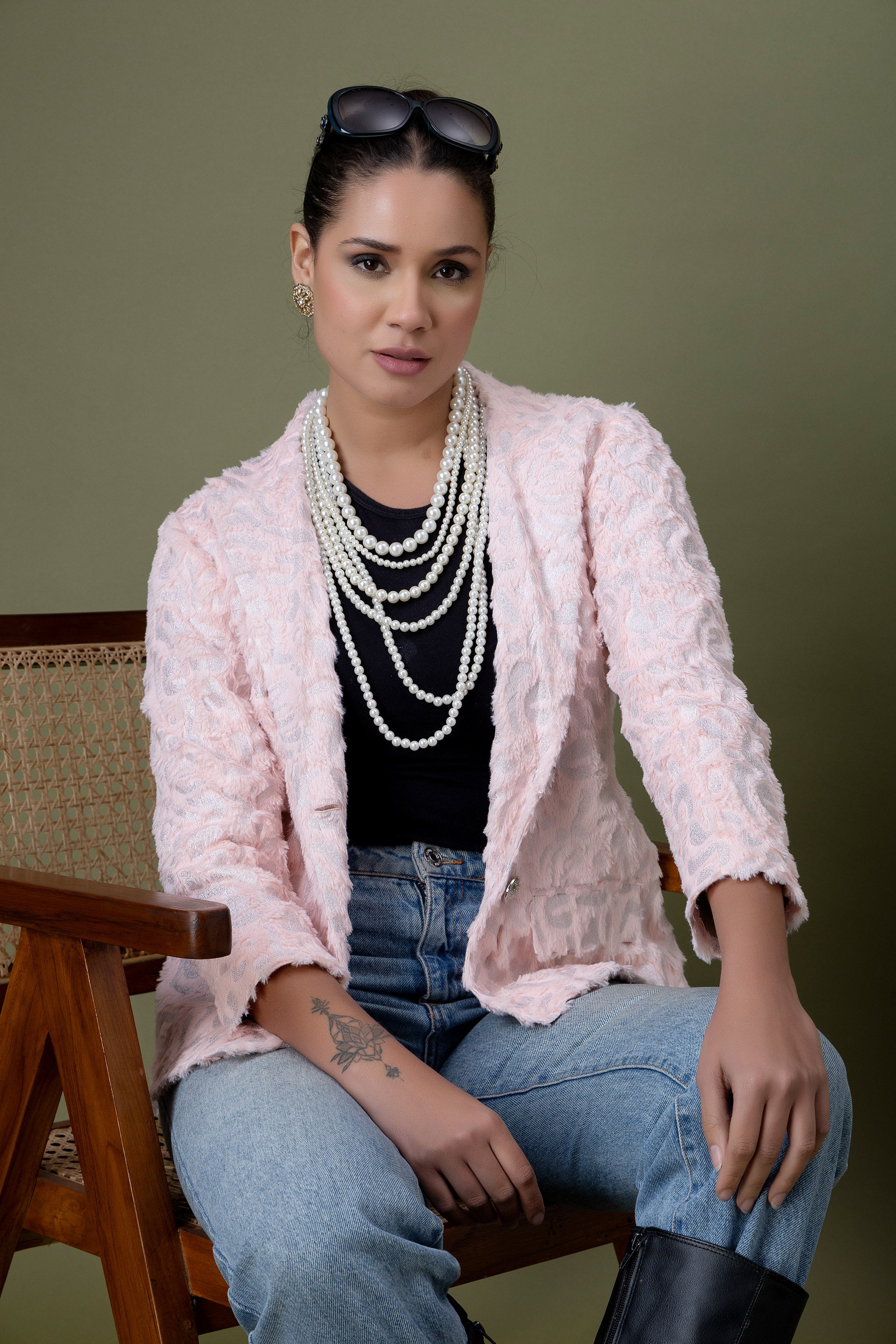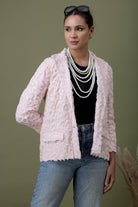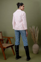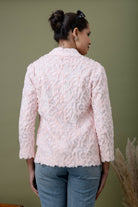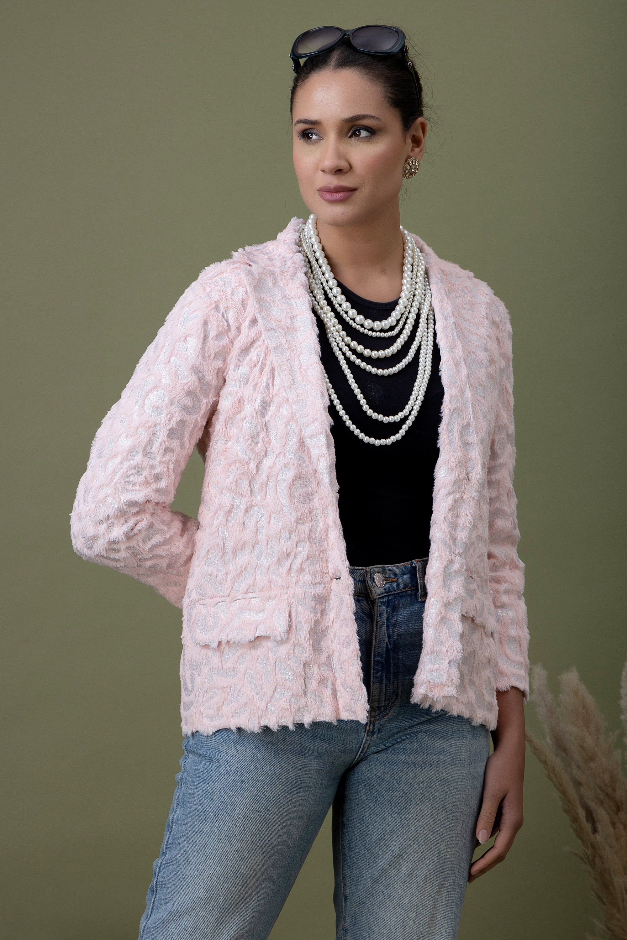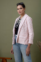 This contemporary pink jacket features a tactile textured finish and clean open-front styling. Lightweight yet statement-worthy, it pairs seamlessly with denim or dresses for elevated everyday dressing.