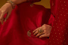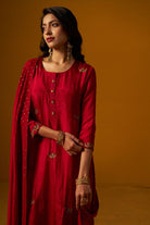 This rich red Mehrun silk suit is beautifully adorned with all-over chand motifs crafted in intricate dabka handwork, lending it a regal and festive charm. It is paired with matching plazos in the same elegant hue for a coordinated silhouette. Completing the ensemble is a lightweight chinon dupatta, delicately finished with four-side Mukesh work, adding a graceful shimmer and elevating the overall look.