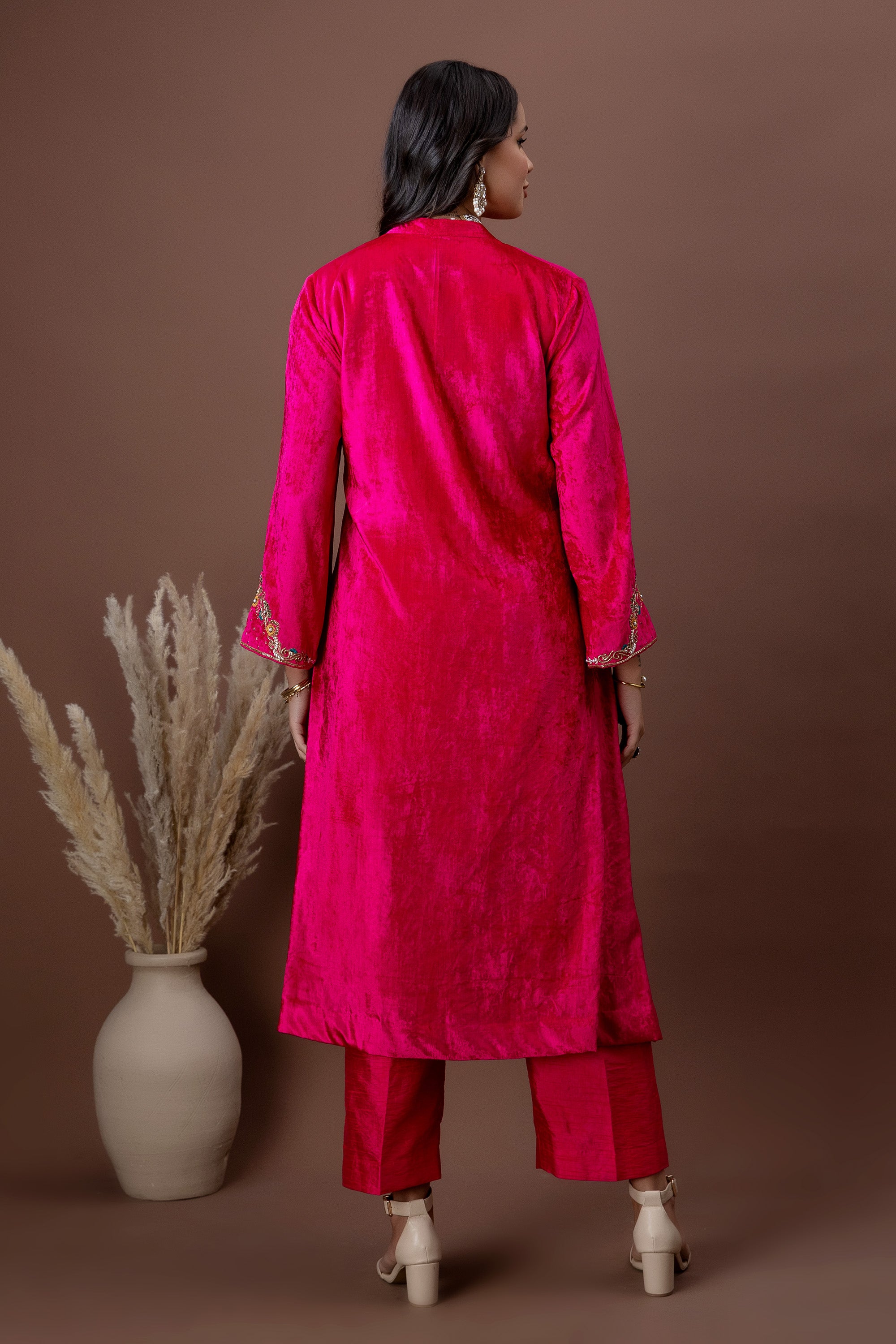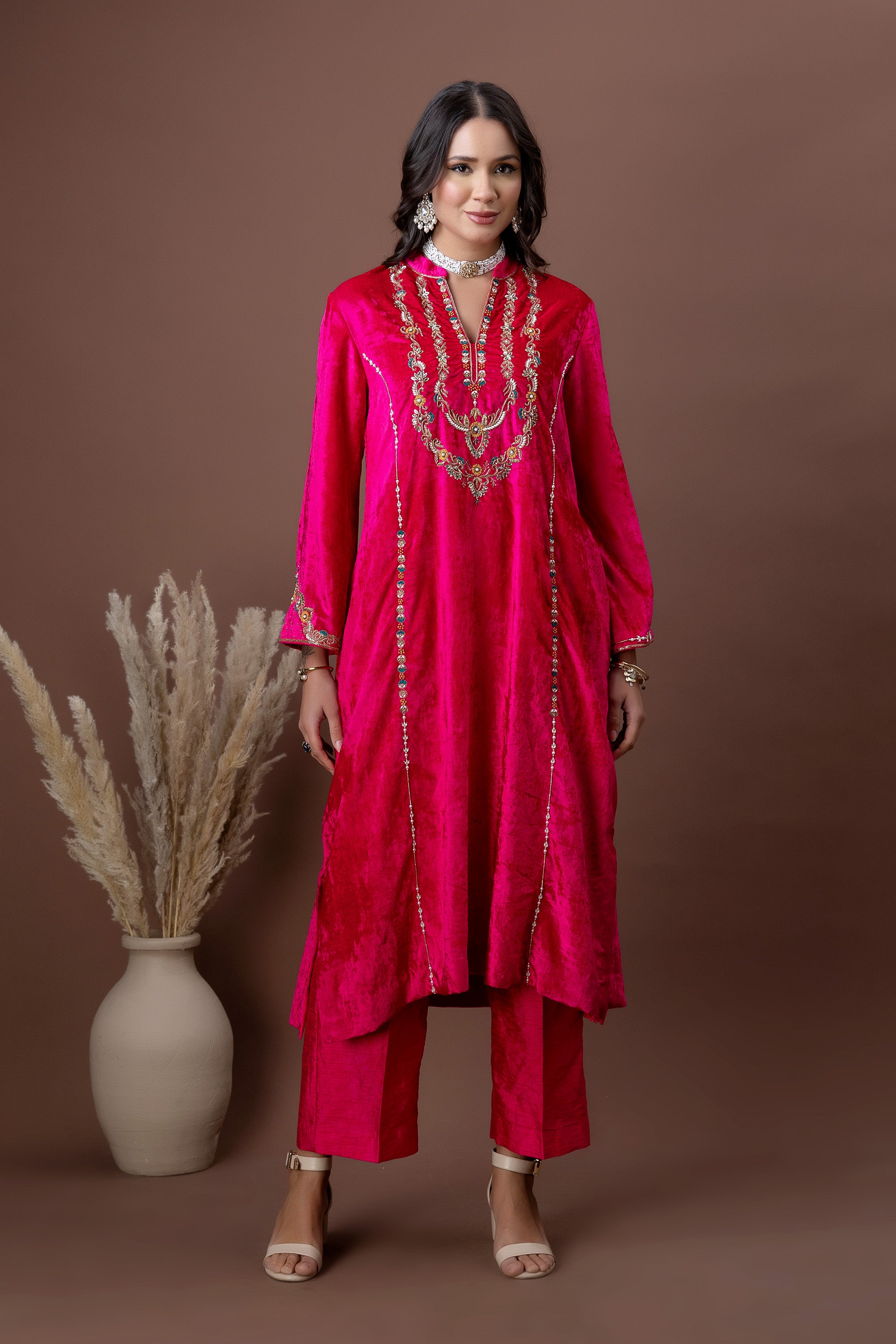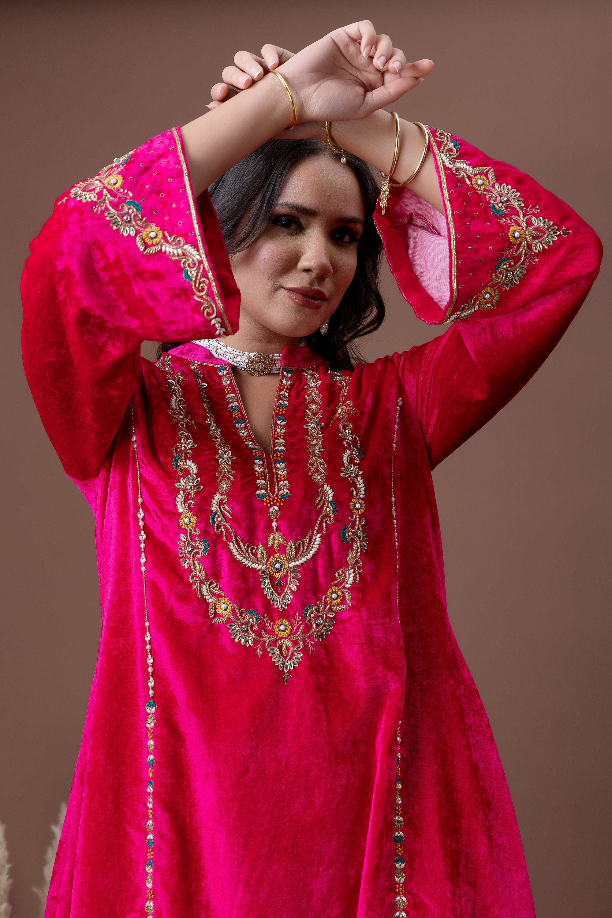 Drenched in a rich fuchsia hue, the Gulnaar Kurta Set features plush velvet adorned with intricate gold embroidery across the neckline and sleeves. Paired with straight-fit pants, this ensemble is designed to make a confident festive statement—perfect for weddings, celebrations, and winter festivities.