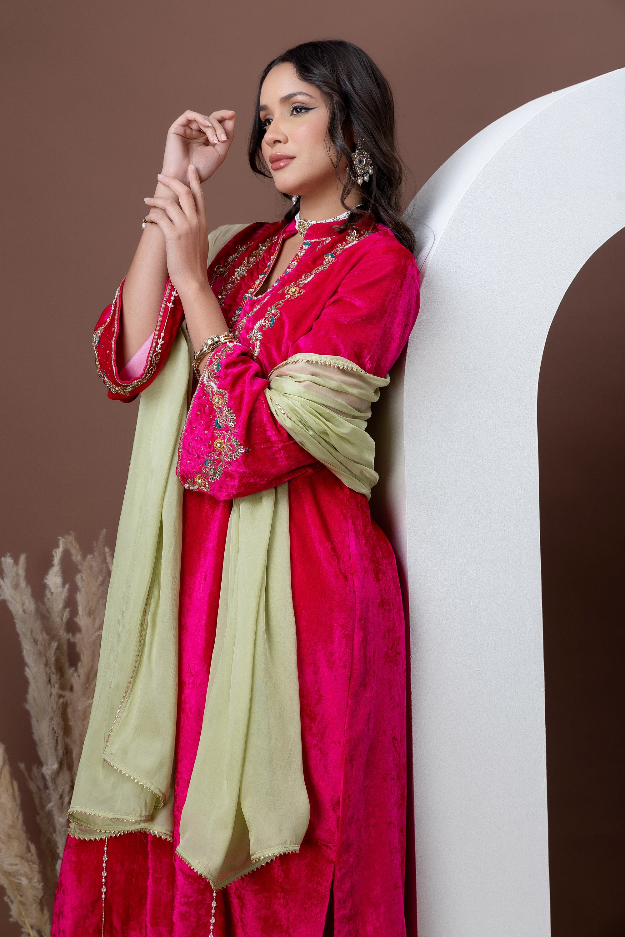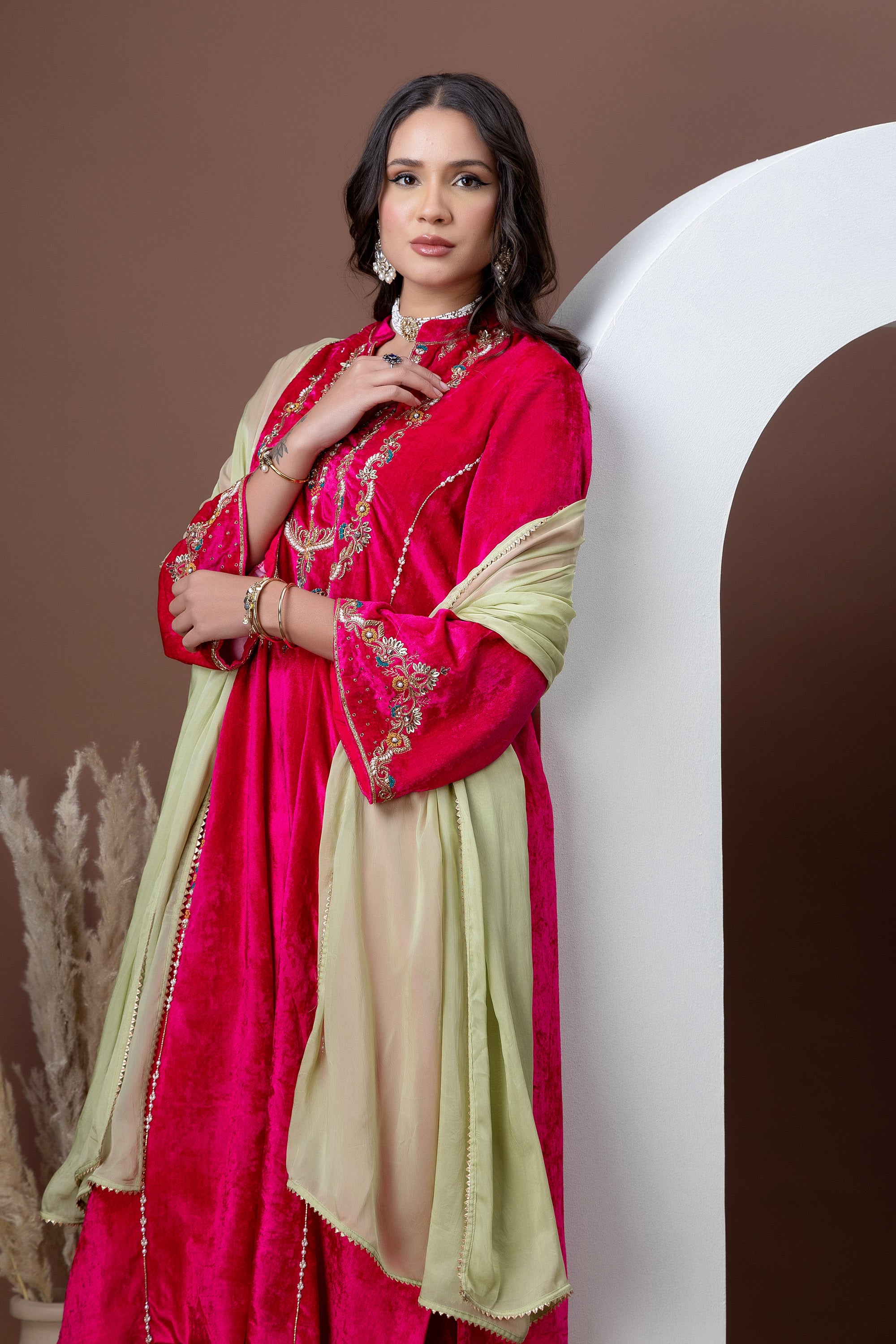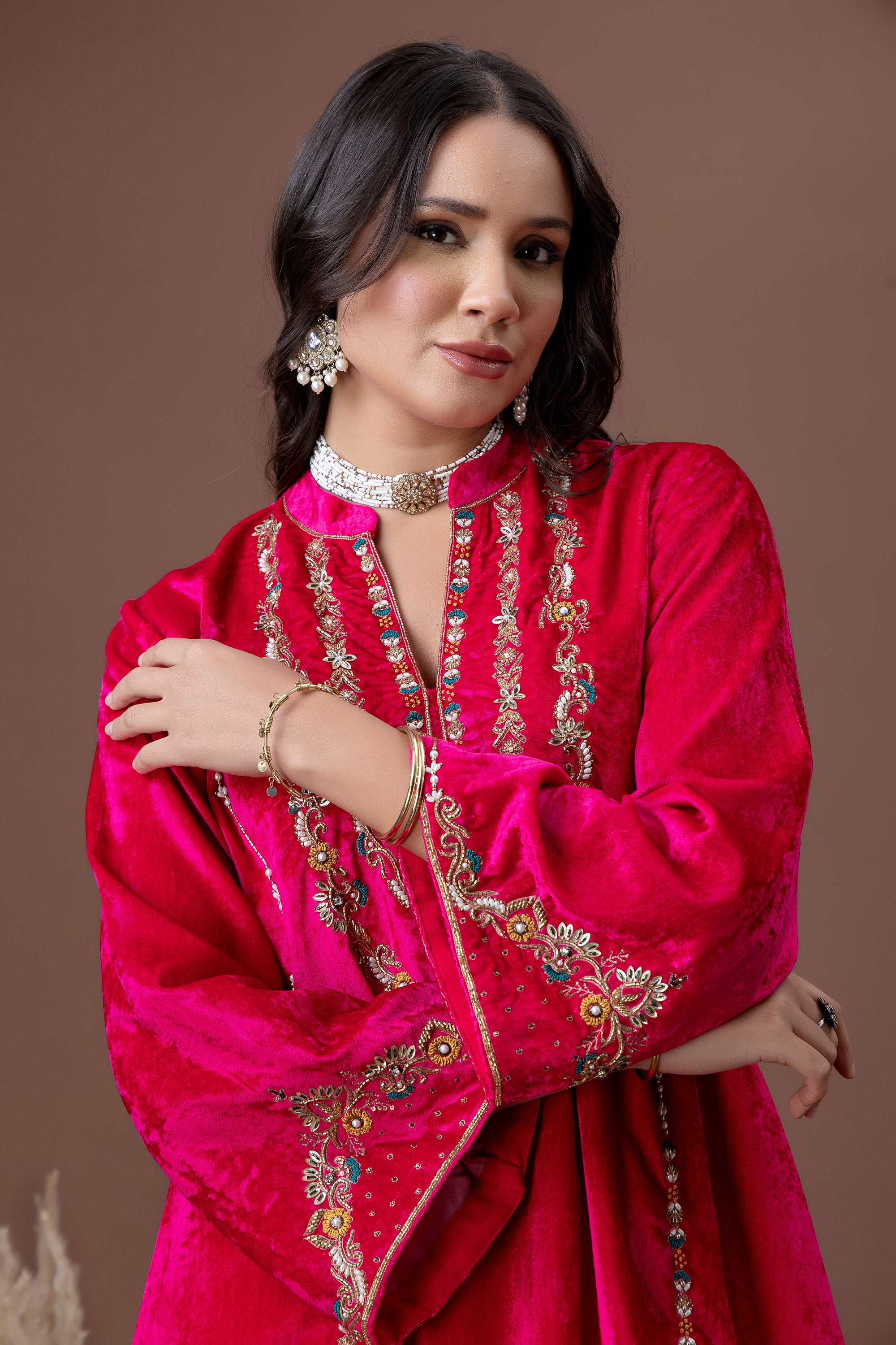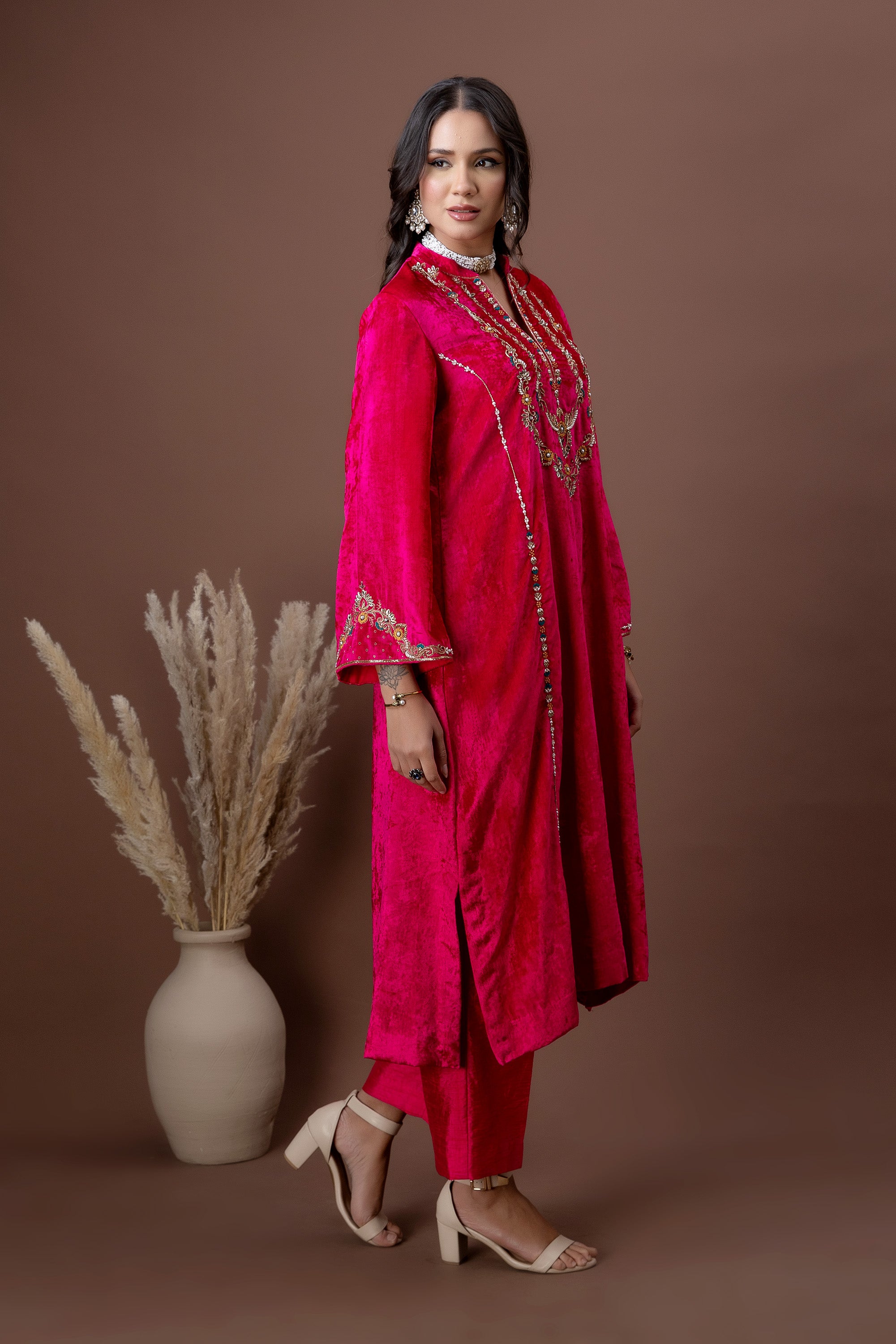 Drenched in a rich fuchsia hue, the Gulnaar Kurta Set features plush velvet adorned with intricate gold embroidery across the neckline and sleeves. Paired with straight-fit pants, this ensemble is designed to make a confident festive statement—perfect for weddings, celebrations, and winter festivities.