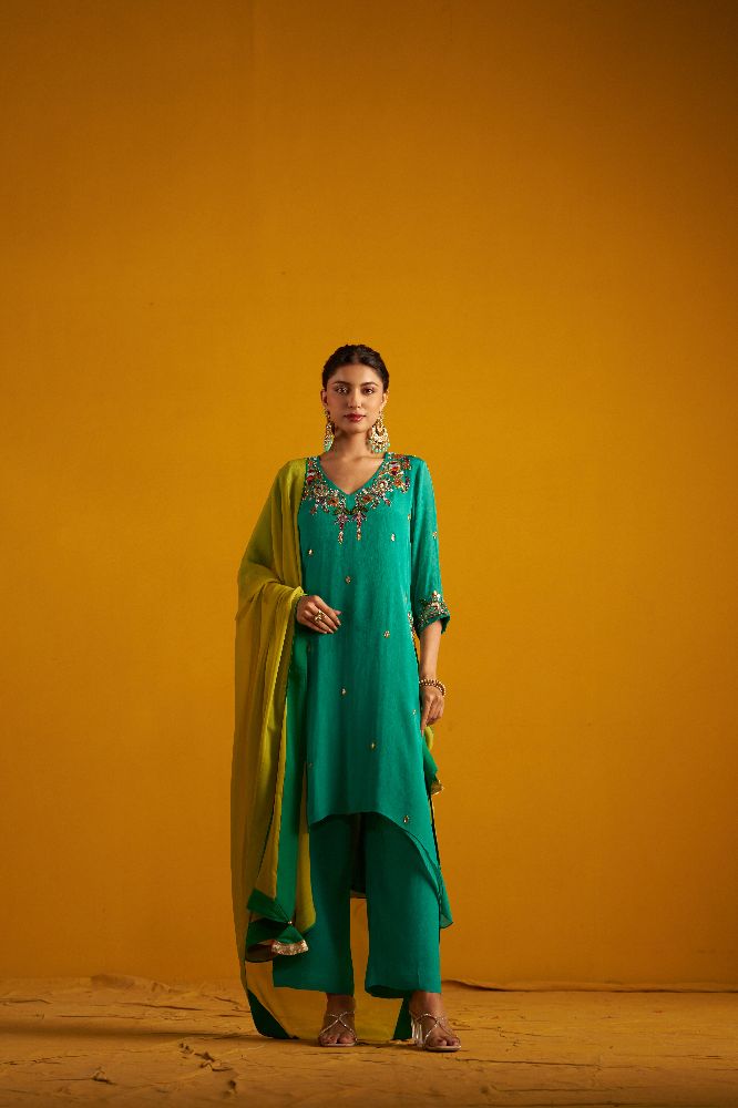 This stunning Rama green chinon kurta–plazo set stands out for its effortless elegance and contemporary high–low silhouette. Intricate handwork detailing in contrast threads is beautifully complemented with gota patti and sequin work on the neckline, pocket, sleeves, and back. Paired with a contrast dupatta featuring a four-side border and delicate gota patti butis, this ensemble brings together festive charm and modern grace.