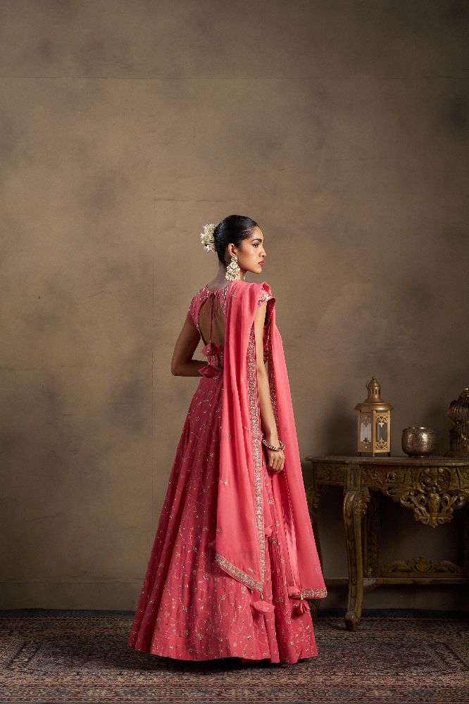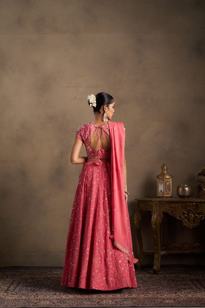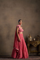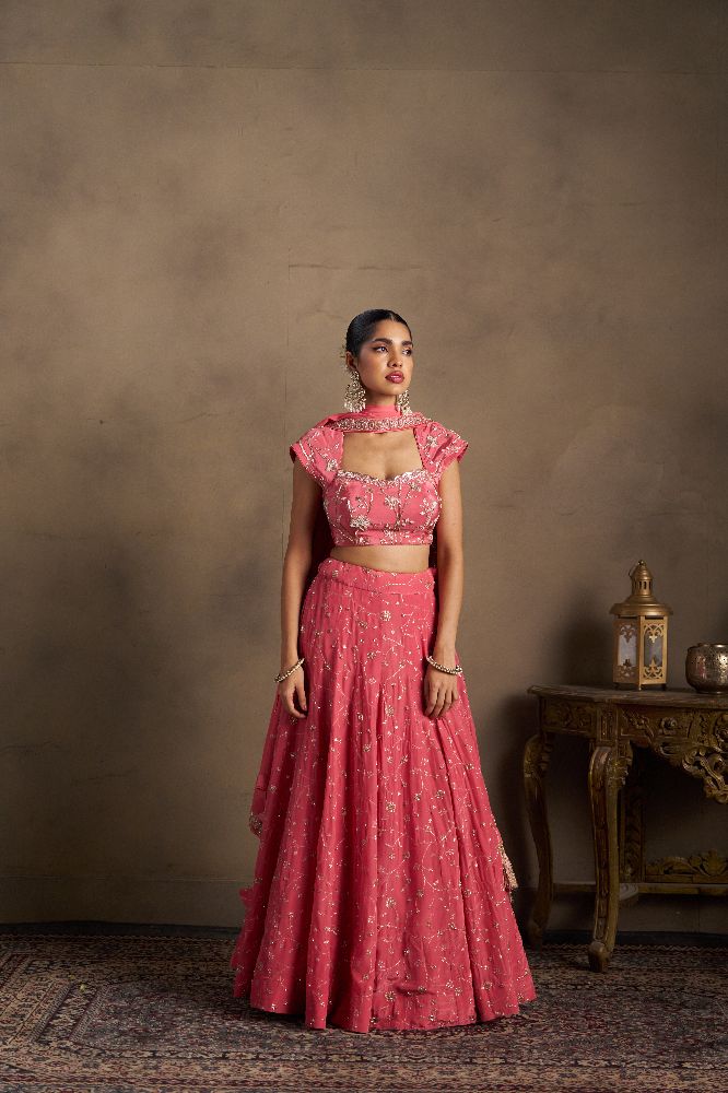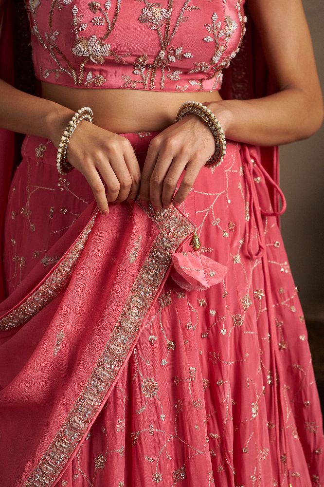 This elegant lehenga set is crafted in soft crepe fabric, featuring a 20-kali full ghera silhouette highlighted with intricate handwork, sequin and zari embroidery, and finished with beautifully handcrafted tassels. The choli is adorned with detailed pearl and cutdana hand embroidery, designed with short sleeves and an attractive neckline that enhances the overall look. Completing the ensemble is a lightweight chinnon dupatta, embellished with four-side handwork and tassels, adding a graceful and festive finish.