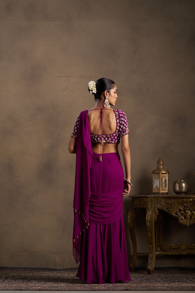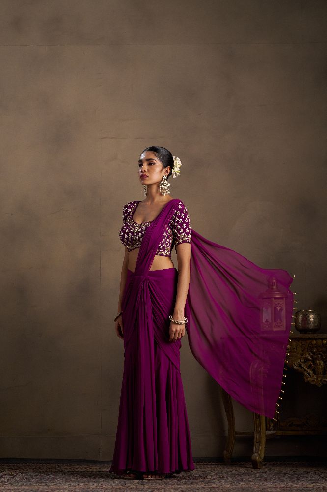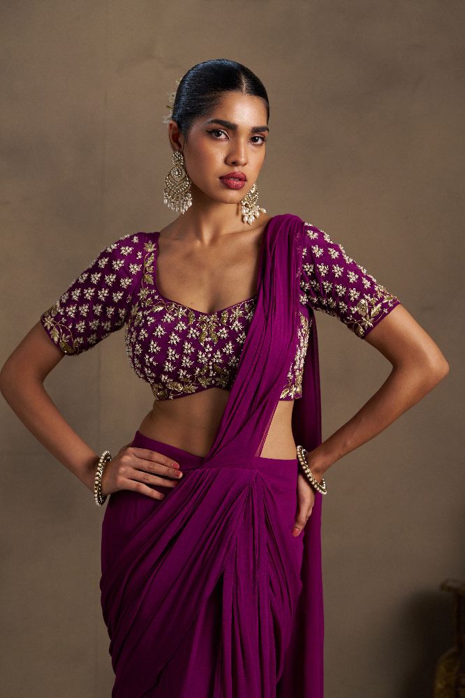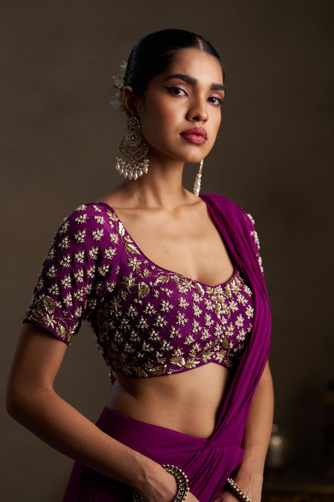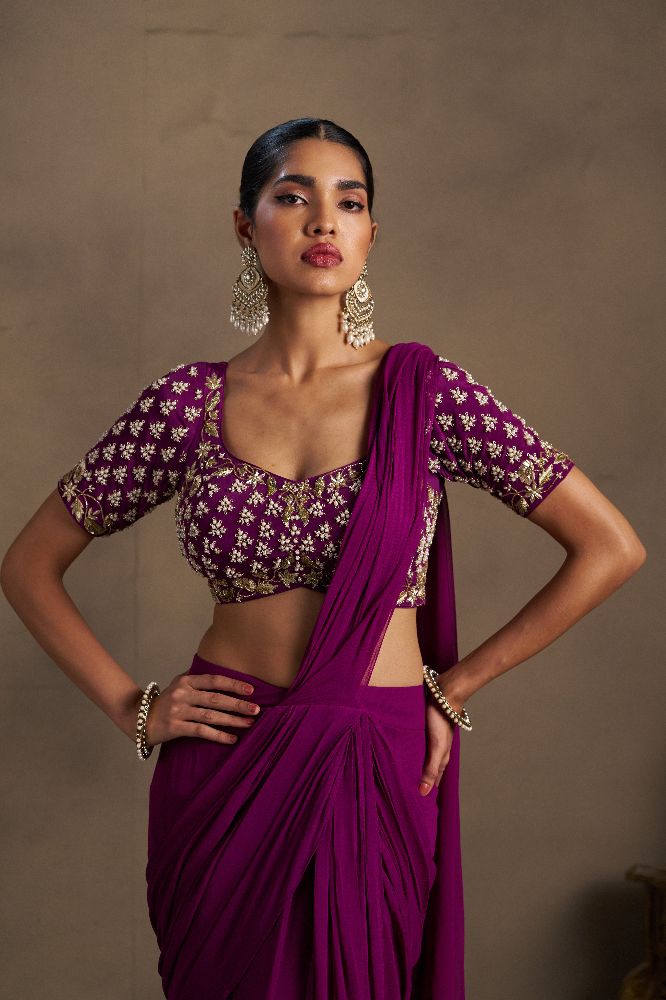 This elegant wine-coloured drape is crafted in fluid georgette, offering a stylish and graceful fall that elevates your party look with bold sophistication. Paired with a richly embellished blouse featuring all-over band embroidery with pearl and dabka handwork on both the front and back, the ensemble exudes refined glamour and statement appeal.